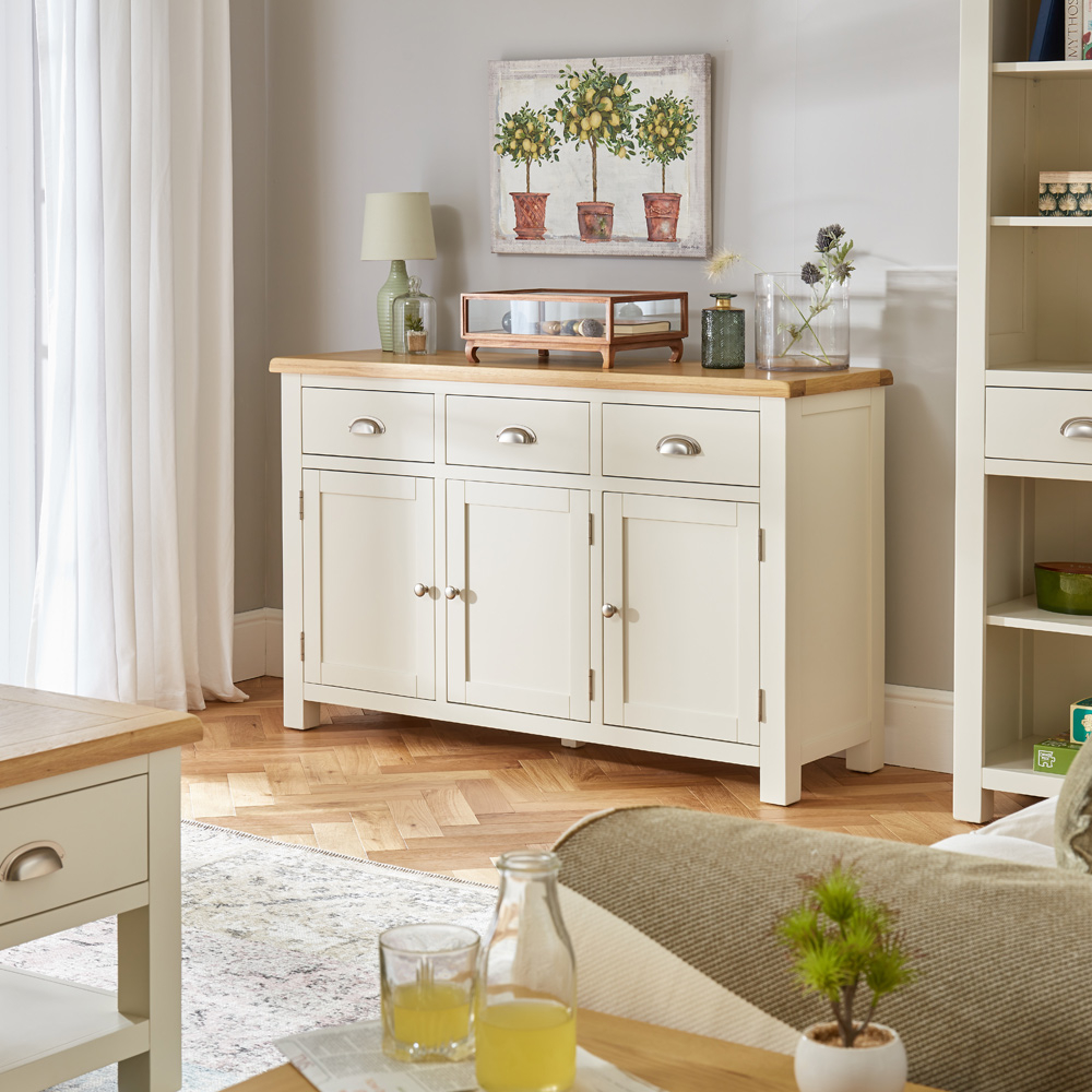 The three door large sideboard is painted in a light cream colour with a satin paint finish and the natural oak top has softly rounded corners and has a protective satin lacquered finish that is hard wearing and maintenance free.