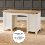 This cream desk is skilfully hand made with traditional time honoured construction methods using a combination of high quality North American solid oak for the top frame, thick oak veneer in the top panel, solid pine for the pedestal frames and drawer internals and man-made board for selected panels for increased strength and durability over time. The drawers feature dovetail joints for increased strength and drawer stops to prevent you from accidentally pulling the drawers all the way out.