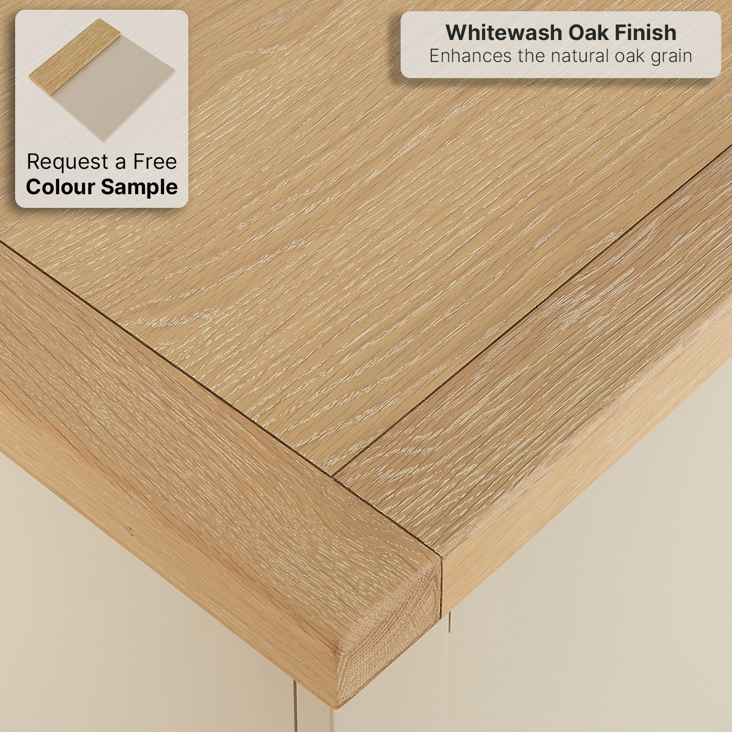 Dove Grey Painted with Whitewash Oak Top - This furniture is finished in a timeless Dove Grey paint finish, offering a subtle, muted tone that effortlessly complements both traditional and contemporary interiors. Its gentle grey hue strikes the perfect balance between warmth and coolness, making it an adaptable choice for any space. The oak tops feature a hand-applied whitewash finish, delicately softening and enhancing the natural grain to create a beautifully airy and refined aesthetic. A durable matt lacquer adds lasting protection to the tops while preserving the oak’s inherent charm, ensuring a flawless blend of durability and elegance. Designed for effortless upkeep, this furniture is maintenance-free and can be easily cleaned with a damp cloth.