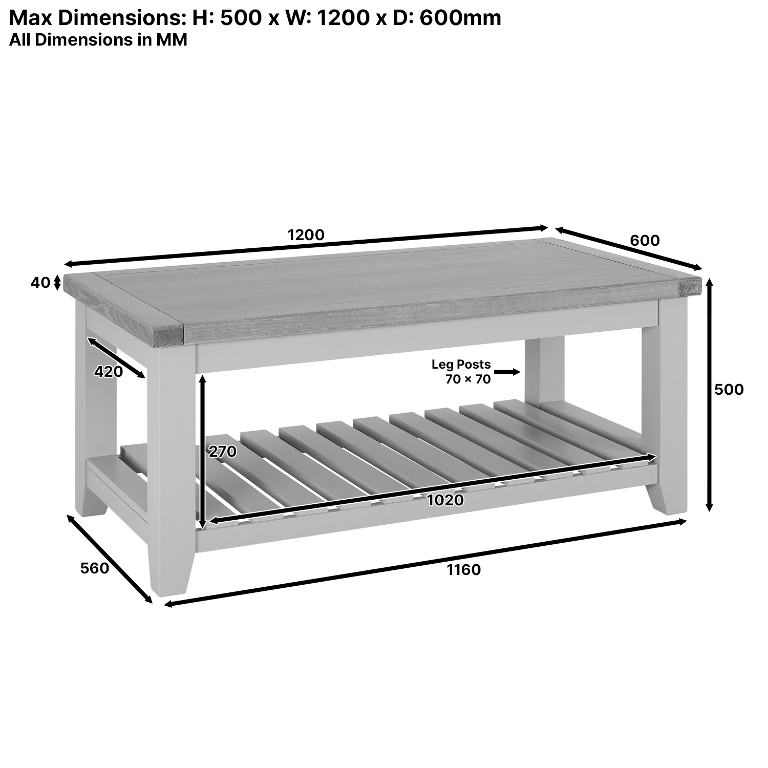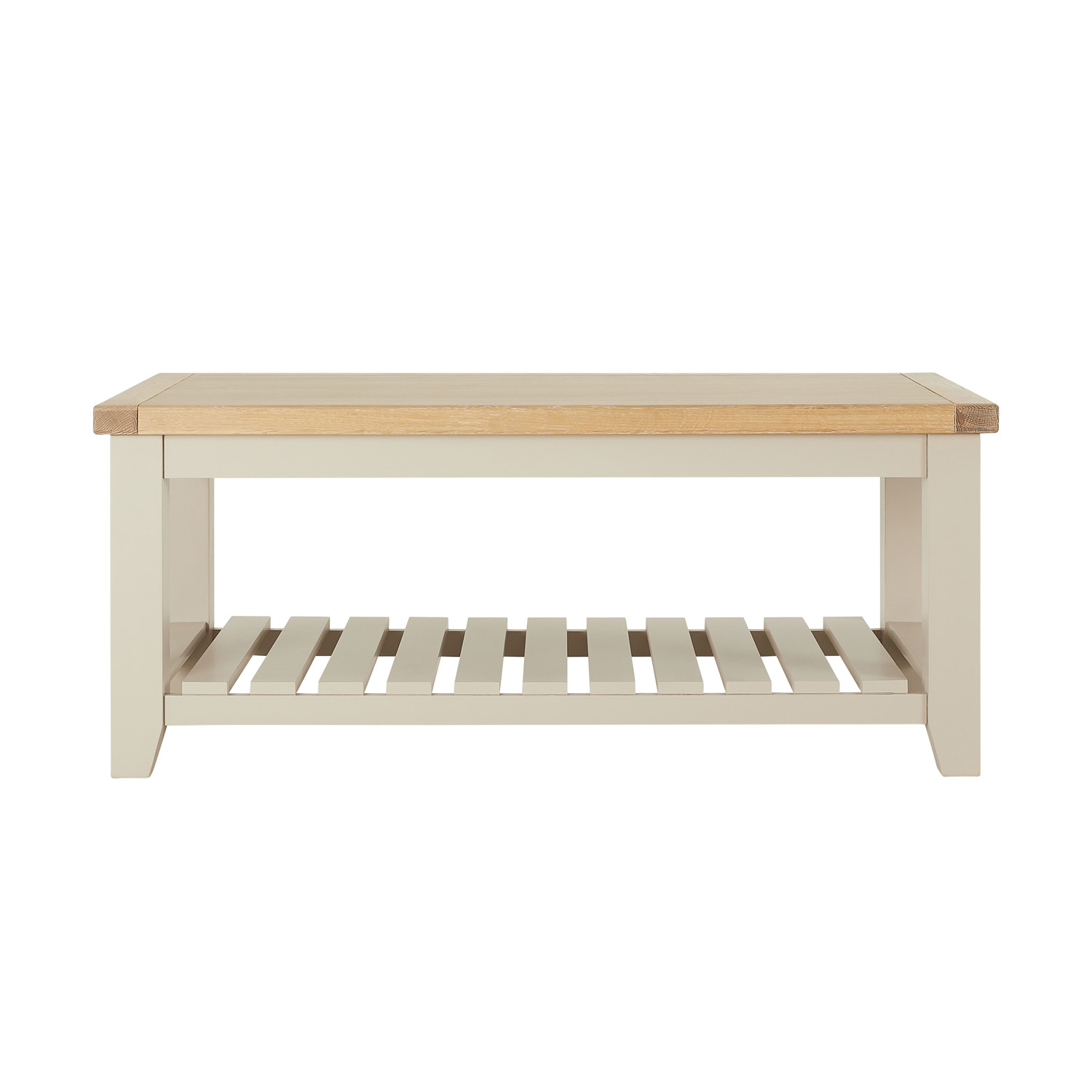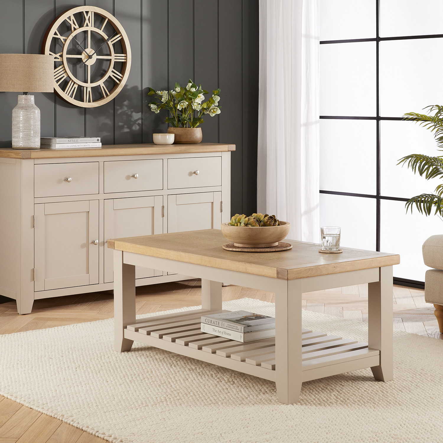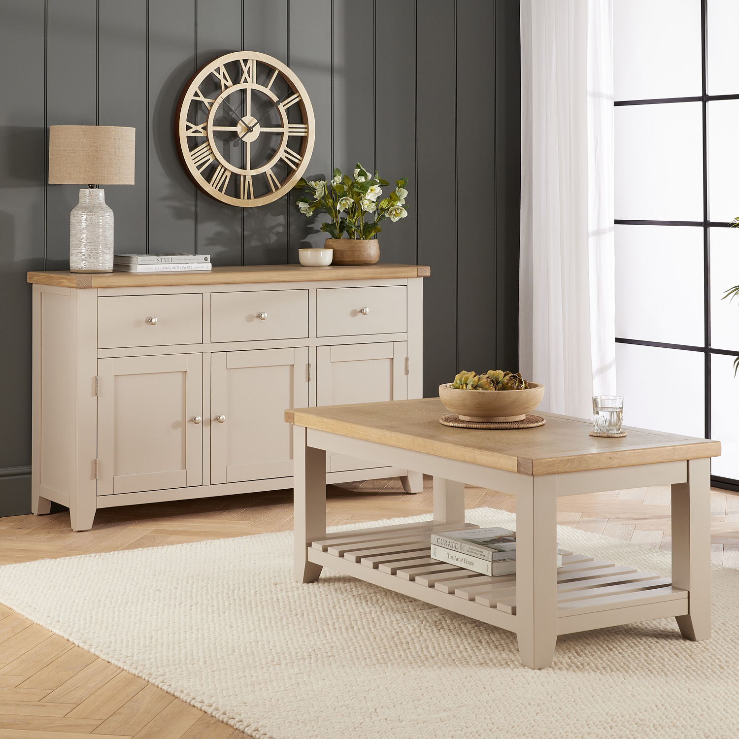 Cheshire Dove Grey Painted Coffee Table – A timeless centrepiece for any living space, this rectangle shaped coffee table combines striking design with everyday practicality. It’s robust construction and substantial proportions exude durability and refined craftsmanship. Designed for both style and function, this heavy coffee table features solid wood legs and a slatted lower shelf, adding texture while offering a convenient storage space for magazines, decorative baskets, or everyday essentials. Whether used for entertaining, displaying décor, or simply enjoying a morning coffee, this beautifully crafted piece blends seamlessly with classic and contemporary interiors alike.
