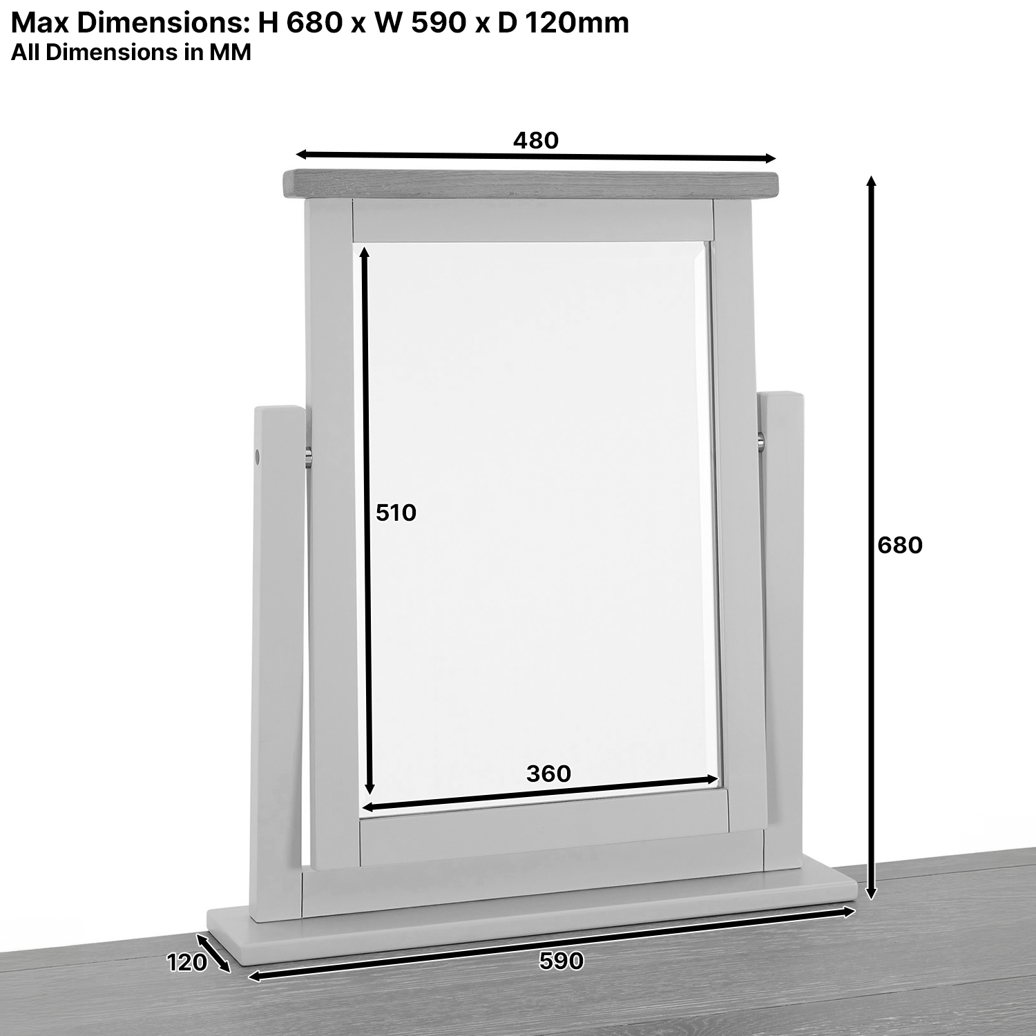 Cheshire Dove Grey Painted Dressing Table Set – The perfect addition to any bedroom, this three piece set includes the dressing table, vanity mirror and stool. The dressing table has a spacious table top area and two drawers. The stool is hand upholstered in a natural oatmeal colour fabric and is very comfortable due to the thick foam cushioning. The vanity mirror angle can be adjusted to suit your needs, and the base of the mirror can be secured to the back of the dressing table top using the metal joining brackets that are supplied.