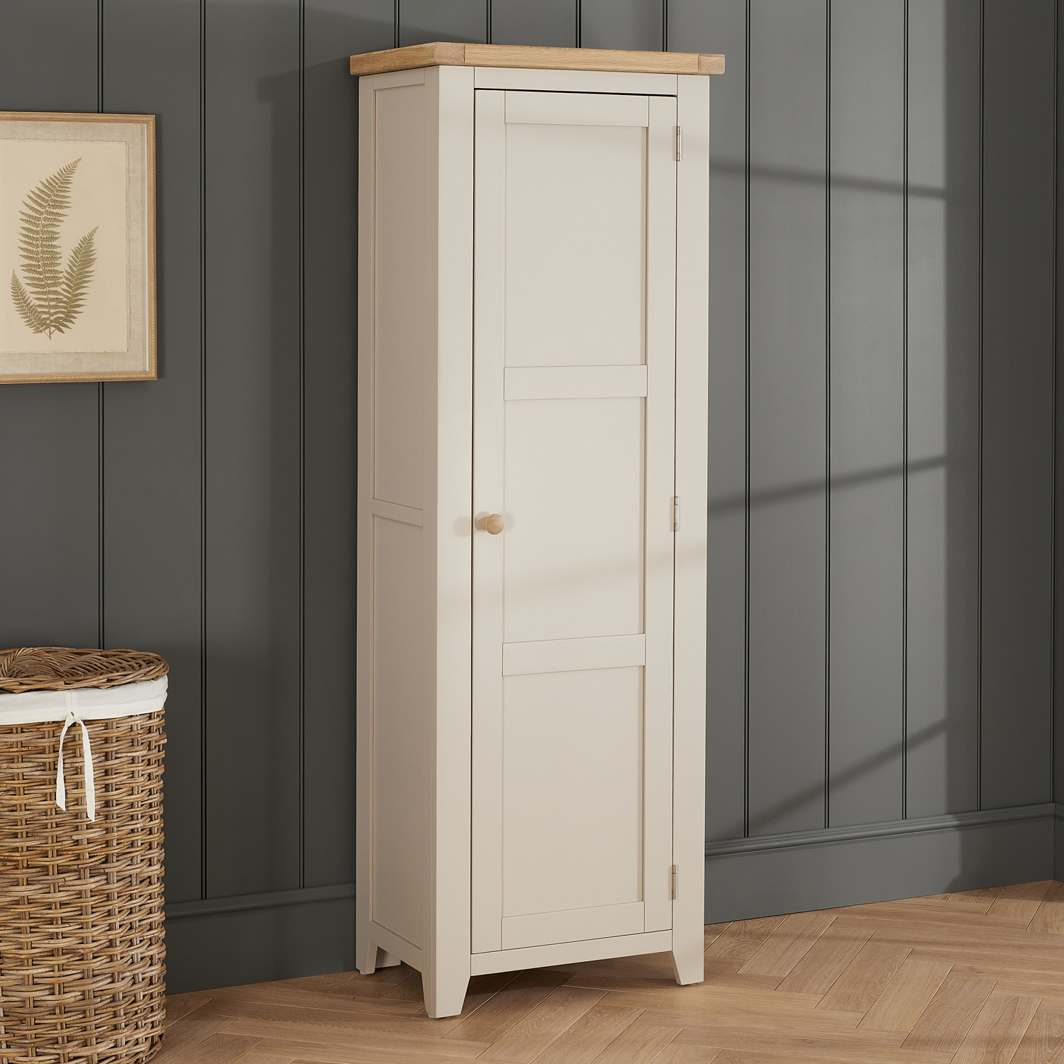 Cheshire Dove Grey Single Shaker Linen Cupboard – Elevate your storage solutions with this shaker cupboard, a beautifully crafted cupboard designed for both style and practicality. Standing tall, this cupboard offers six spacious open shelf areas, providing ample room to organise and display your essentials. There are five height adjustable and removable shelves, allowing you to customise the storage layout to suit your needs. Versatile and effortlessly elegant, this cupboard is perfect for any room in your home. Whether you need extra storage in the kitchen, bedroom, living area or hallway as a coat and shoe cupboard. Its timeless shaker-style design and warm oak finish blend seamlessly with a variety of interiors, making it a sophisticated yet functional addition to your home.