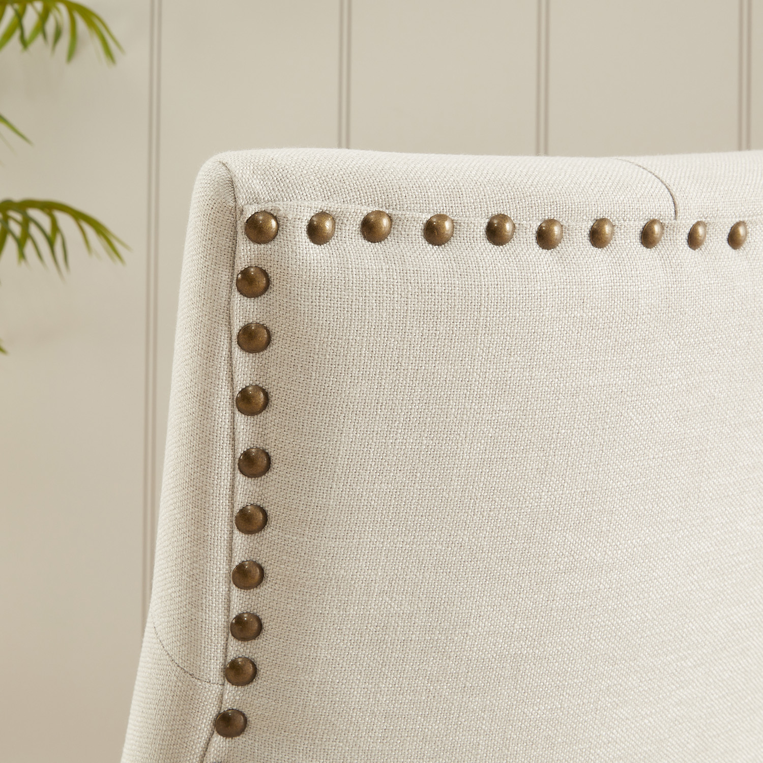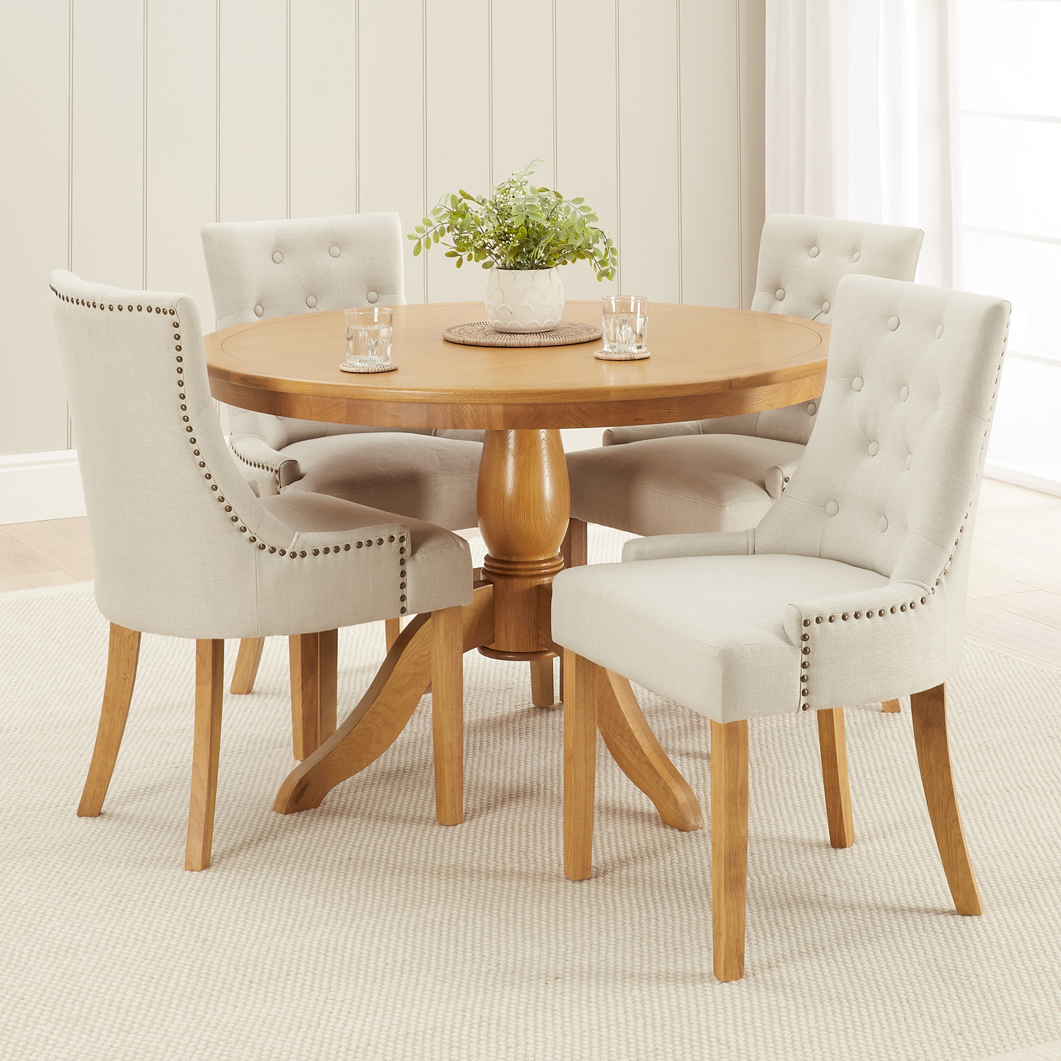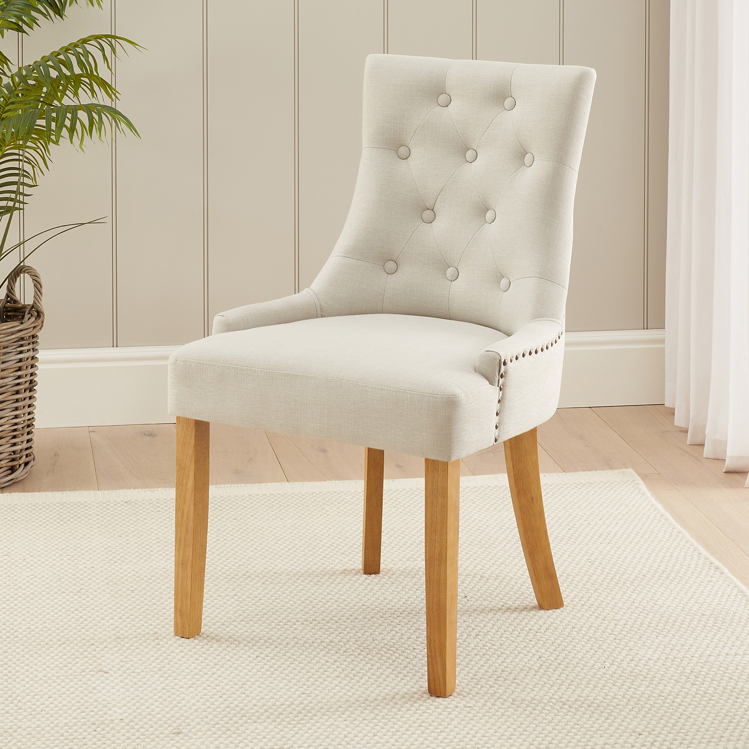Natural Linen Fabric Scoop Back Dining Chairs – The Luxurious dining chairs are very comfortable due to the curved scoop back design and button upholstered back rest. They are hand upholstered in a high quality natural linen fabric that is easy to clean and robust for everyday use. The chairs have bronze stud detailing on the back and sides and the legs are made from solid hardwood and have a natural oak finish.