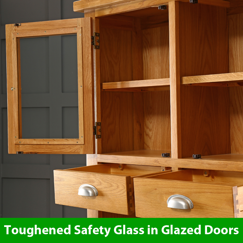 Cheshire Oak Medium Glazed Dresser – This dresser is a very practical piece of kitchen or dining room furniture that provides plenty of storage space. The sideboard base features two drawers for easy access to everyday essentials and a spacious two door cupboard below with a fixed central shelf. The glazed dresser top features two upper cupboards each with clear safety glass door panels and an internal shelf. Directly below this sits two smaller drawers that are great for keeping your spices and other smaller kitchen items.