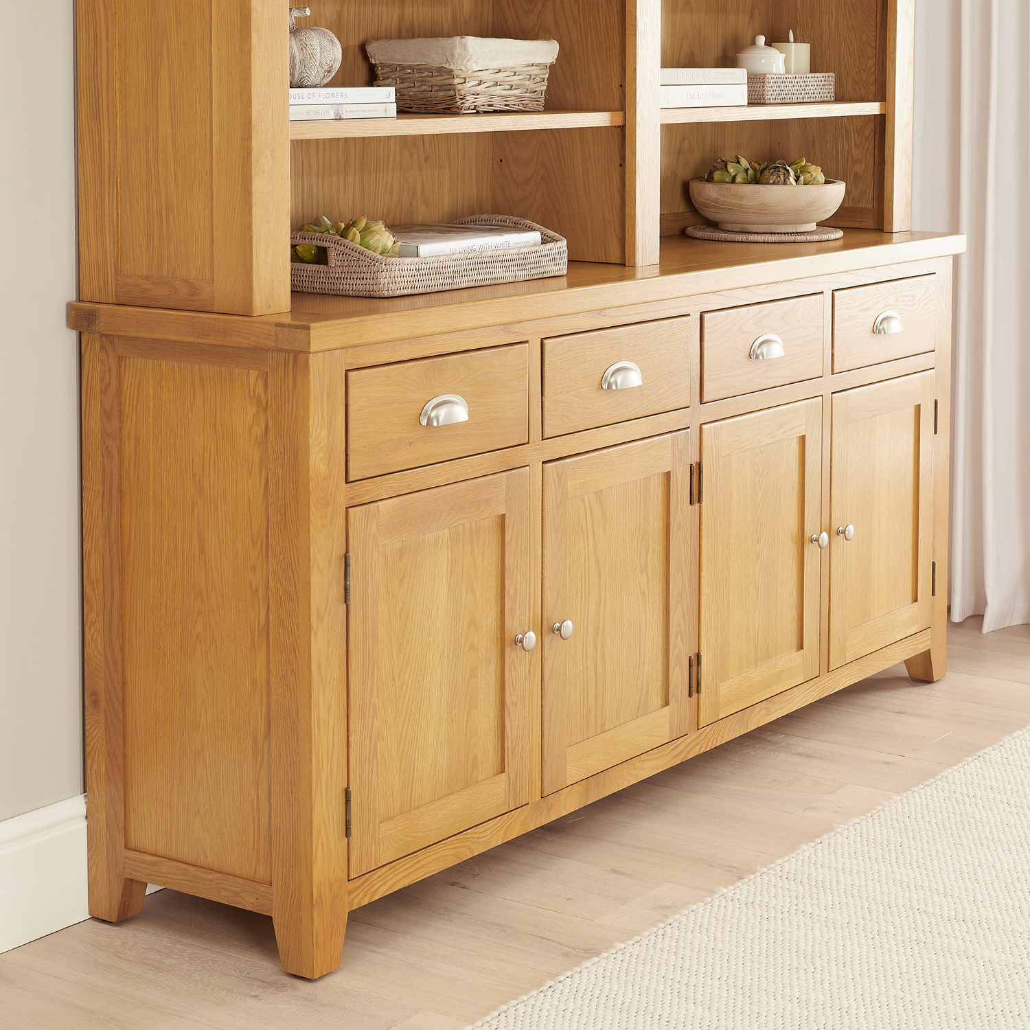 Cheshire Oak Extra-Large Sideboard with Bookcase Dresser Top - Designed to offer both generous storage and elegant display space, this stunning piece is perfect for kitchens, dining rooms, and living areas alike. Crafted from high-quality oak, the sideboard base boasts four spacious solid drawers and two double-door cupboards, each fitted with a fixed internal shelf—ideal for organising crockery, kitchen essentials, or household items. The bookcase dresser top provides six sturdy shelves, with the top and bottom shelves being height adjustable to accommodate books or displaying your collectibles. Whether used as a traditional kitchen dresser, a stylish bookcase, or a multifunctional storage solution, this extra-large sideboard delivers both practicality and timeless elegance to your home.