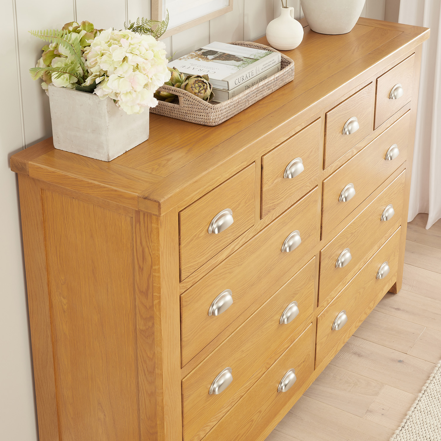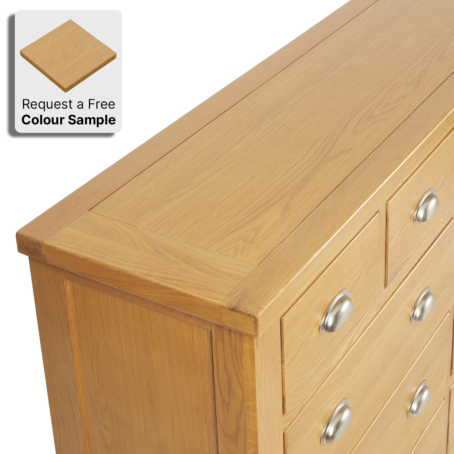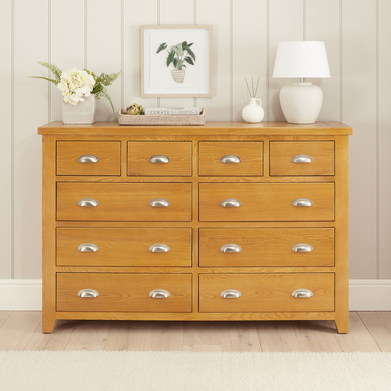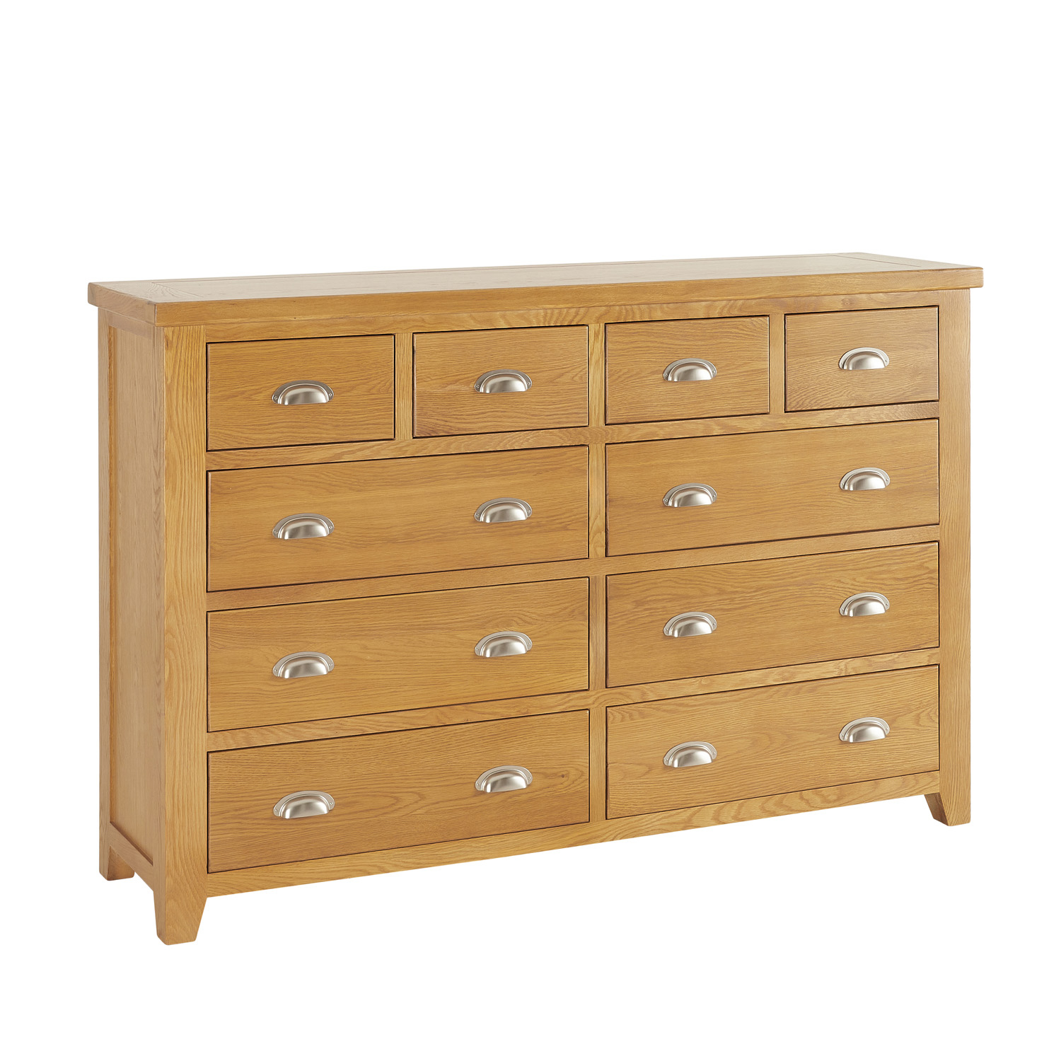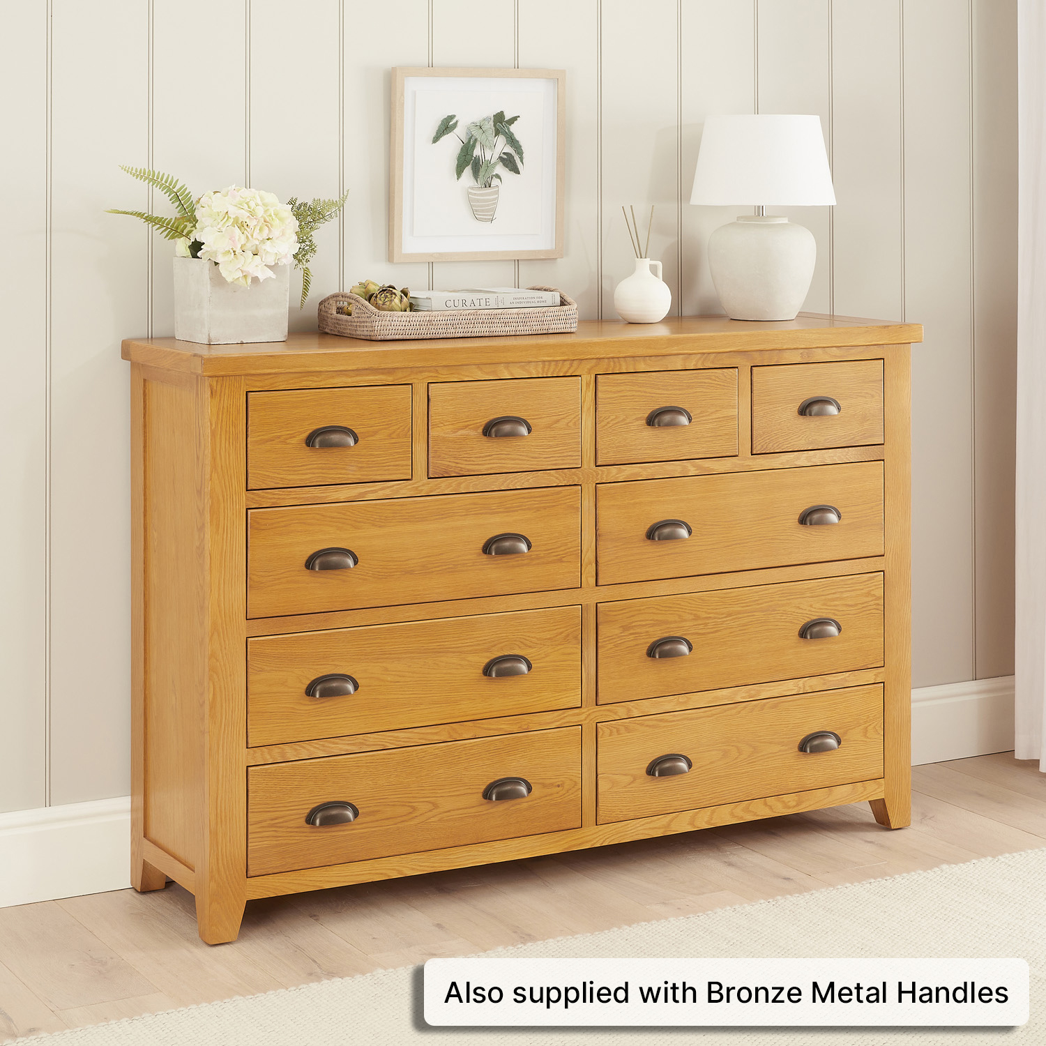 Cheshire Oak Jumbo 10 Drawer Chest – A beautifully crafted solid oak chest of drawers, this extra-large piece is designed to maximise storage while enhancing your bedroom with timeless style. With four smaller top drawers and six large lower drawers, it offers exceptional capacity for neatly organising clothing, accessories, and everyday essentials. The frame is built from high-quality solid oak, the chunky frame and robust construction ensure strength, durability, and lasting appeal. The expansive oak top provides the perfect surface for displaying decorative accents such as lamps, photographs, or treasured ornaments, adding warmth and character to your room. Combining practicality with elegant design, this extra-large oak chest is a standout addition to any home and pairs seamlessly with the rest of the Cheshire Oak bedroom furniture collection.