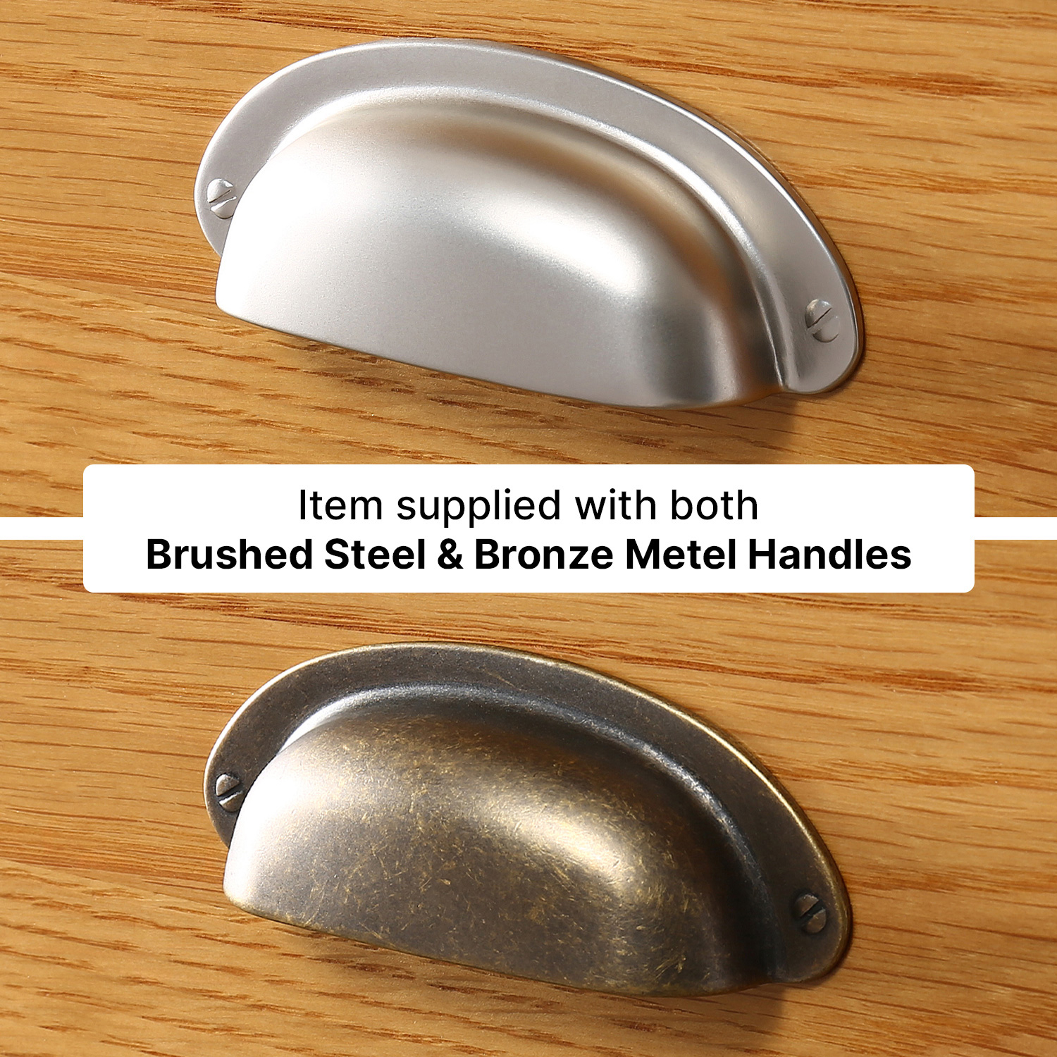 Two Handle Options Provided – This chest is supplied with two colours of cup handle (Brushed steel & Bronze metal). The brushed steel handles offer a sleek, contemporary vibe, while the bronze metal handles exude a more classic, traditional charm. With both options included, you have the flexibility to choose the look that perfectly suits your style.
