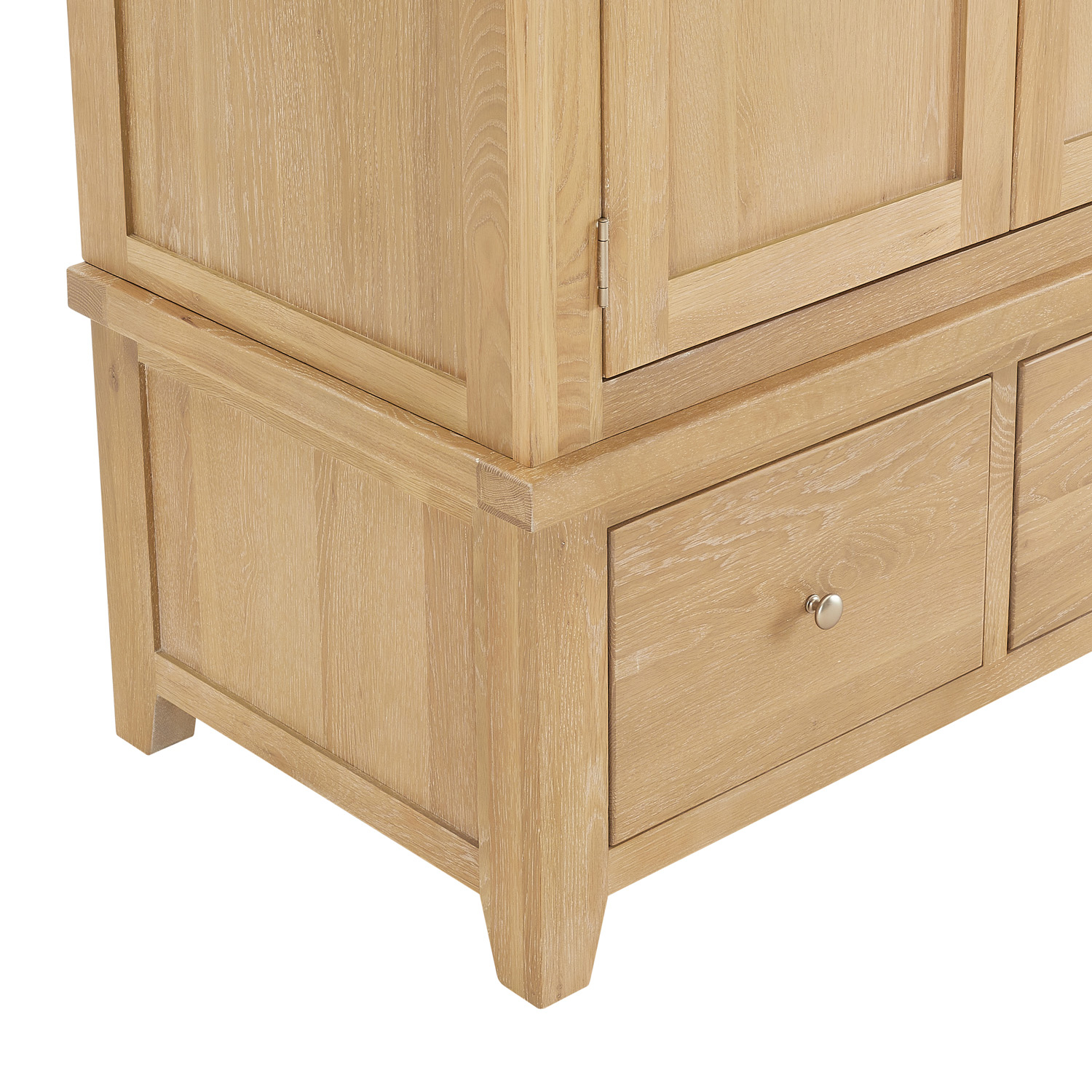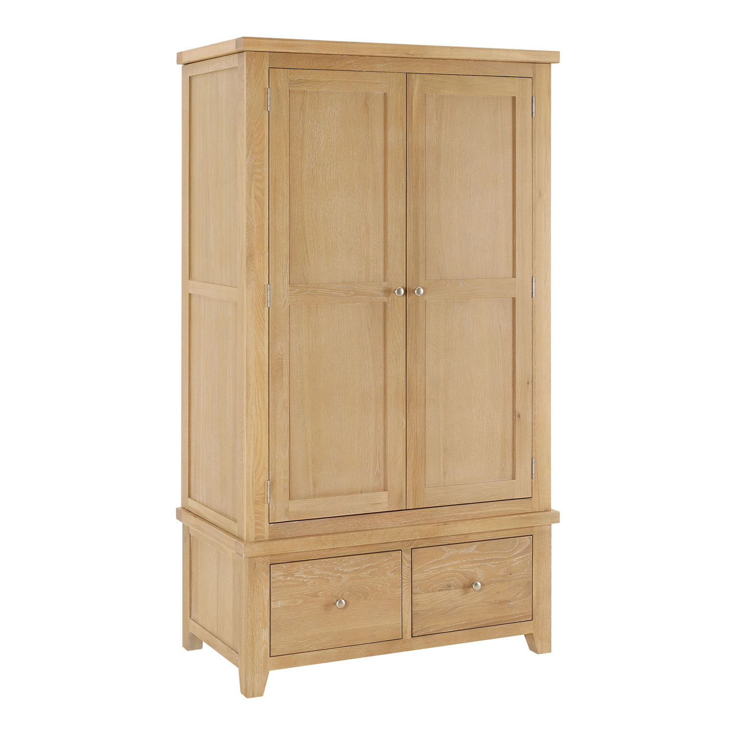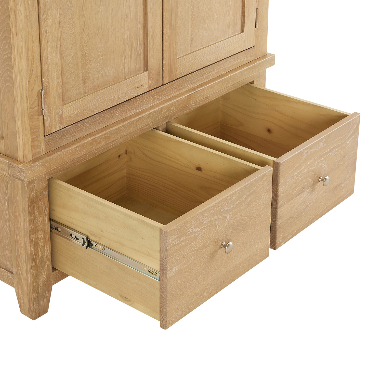 Cheshire Whitewash Oak Double Wardrobe – Spacious, stylish, and practical. Designed to offer both generous storage and timeless elegance, this double wardrobe is a beautifully crafted addition to any bedroom. Behind its two sturdy doors, a large internal space with a hanging rail provides ample room for clothing, keeping your wardrobe organised with ease. Below, two deep drawers offer extra storage for clothing or blankets maximising practicality. With its refined oak finish and solid construction, this versatile piece combines durability and classic charm, ensuring it remains a stylish focal point for years to come.