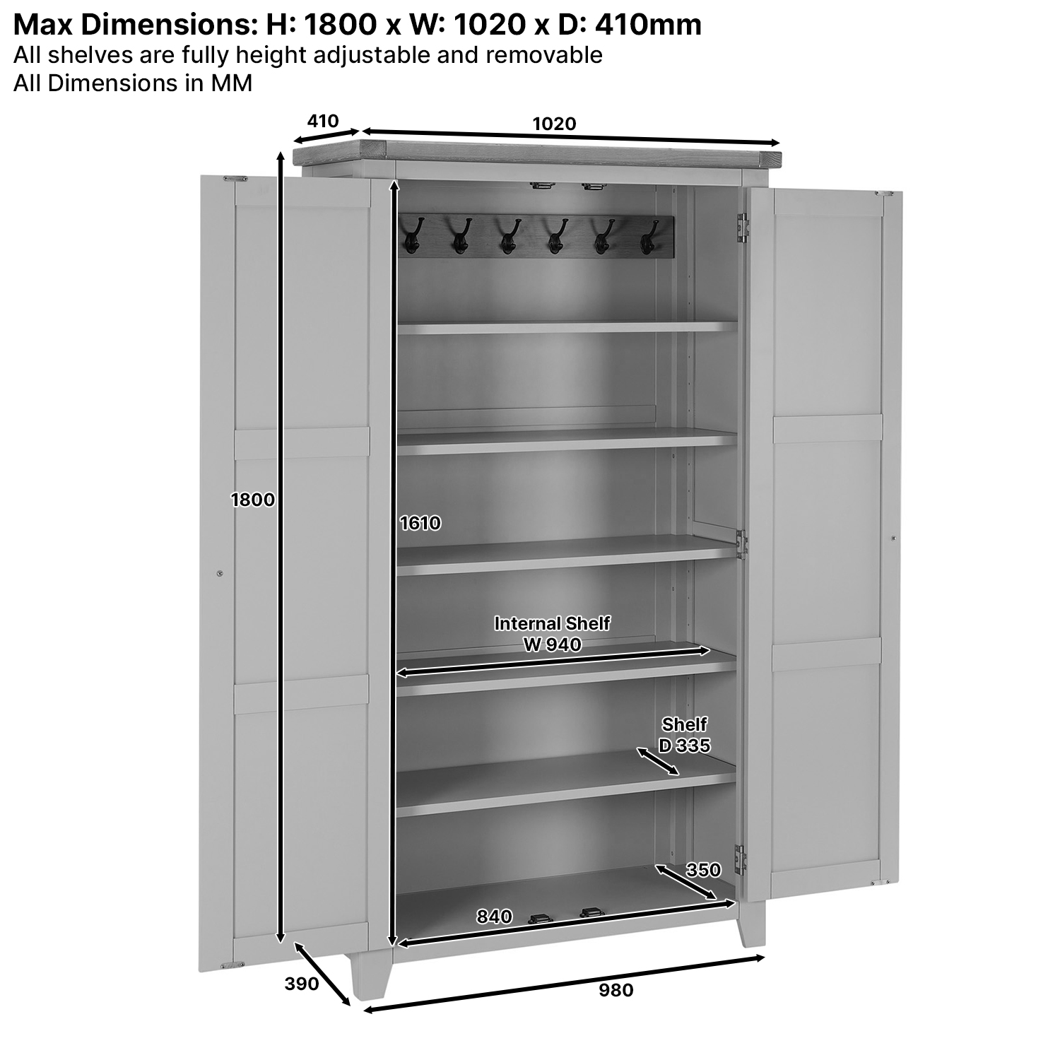 Cheshire Whitewash Oak Double Shaker Linen Cupboard – Elevate your storage solutions with this large shaker cupboard, a beautifully crafted cupboard designed for both style and practicality. Standing tall, this cupboard offers six spacious open shelves, providing ample room to organise and display your essentials. There are five shelves that are height adjustable and removable, allowing you to customise the storage layout to suit your needs. Versatile and effortlessly elegant, this cupboard is perfect for any room in your home—whether you need extra storage in the bedroom, kitchen, living area or hallway as a coat and shoe cupboard. Its timeless shaker-style design and warm oak finish blend seamlessly with a variety of interiors, making it a sophisticated yet functional addition to your home.