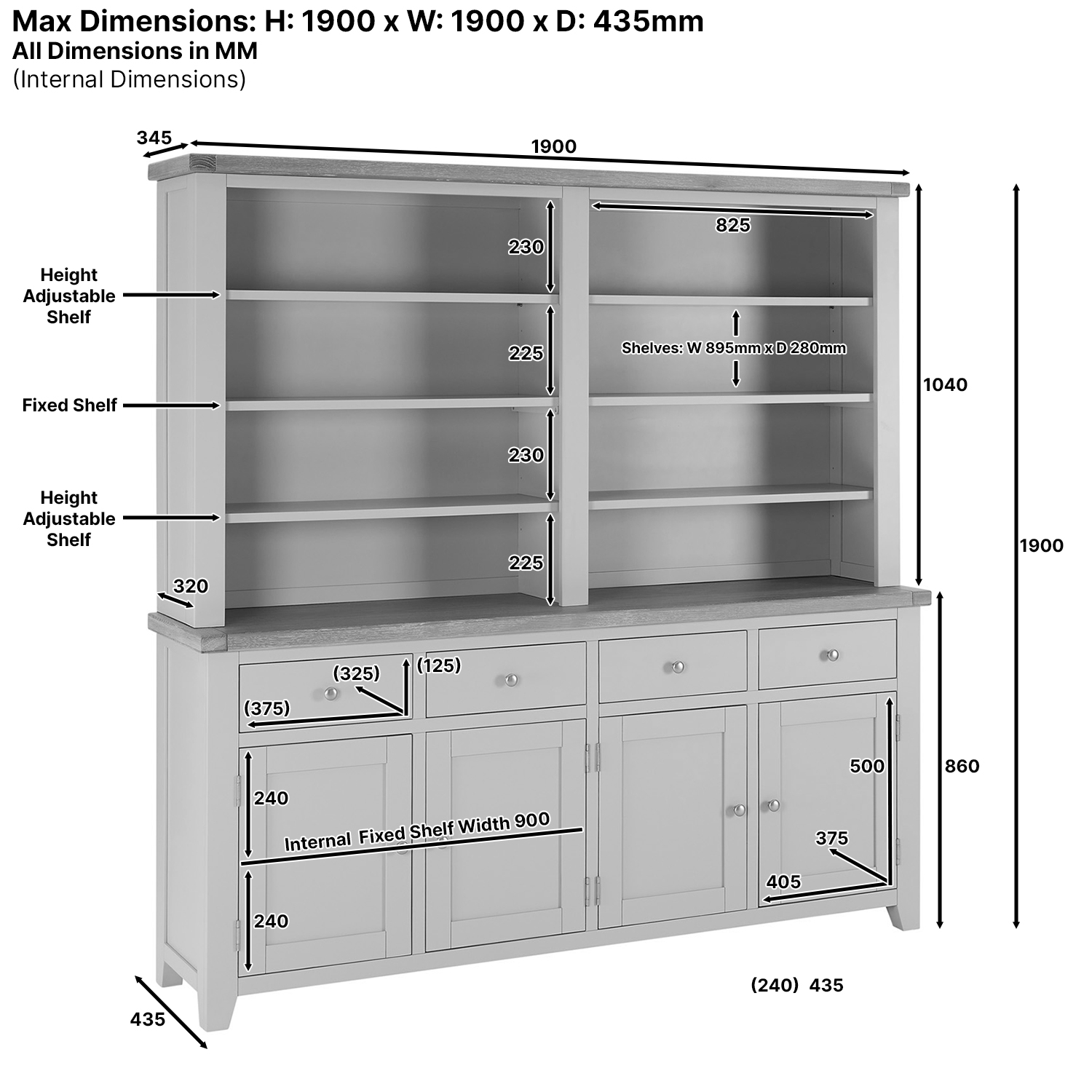 Cheshire Whitewash Oak Extra-Large Sideboard with Dresser Top - Designed to offer both generous storage and elegant display space, this stunning piece is perfect for kitchens, dining rooms, and living areas alike. Crafted from high-quality oak, the sideboard base boasts four spacious solid drawers and two double-door cupboards, each fitted with a fixed internal shelf—ideal for organising crockery, kitchen essentials, or household items. The bookcase dresser top provides six sturdy shelves, with the top and bottom shelves being height adjustable to accommodate books or displaying your collectibles. Whether used as a traditional kitchen dresser, a stylish bookcase, or a multifunctional storage solution, this extra-large sideboard delivers both practicality and timeless elegance to your home.