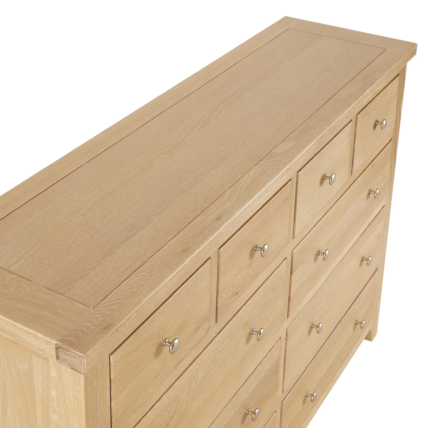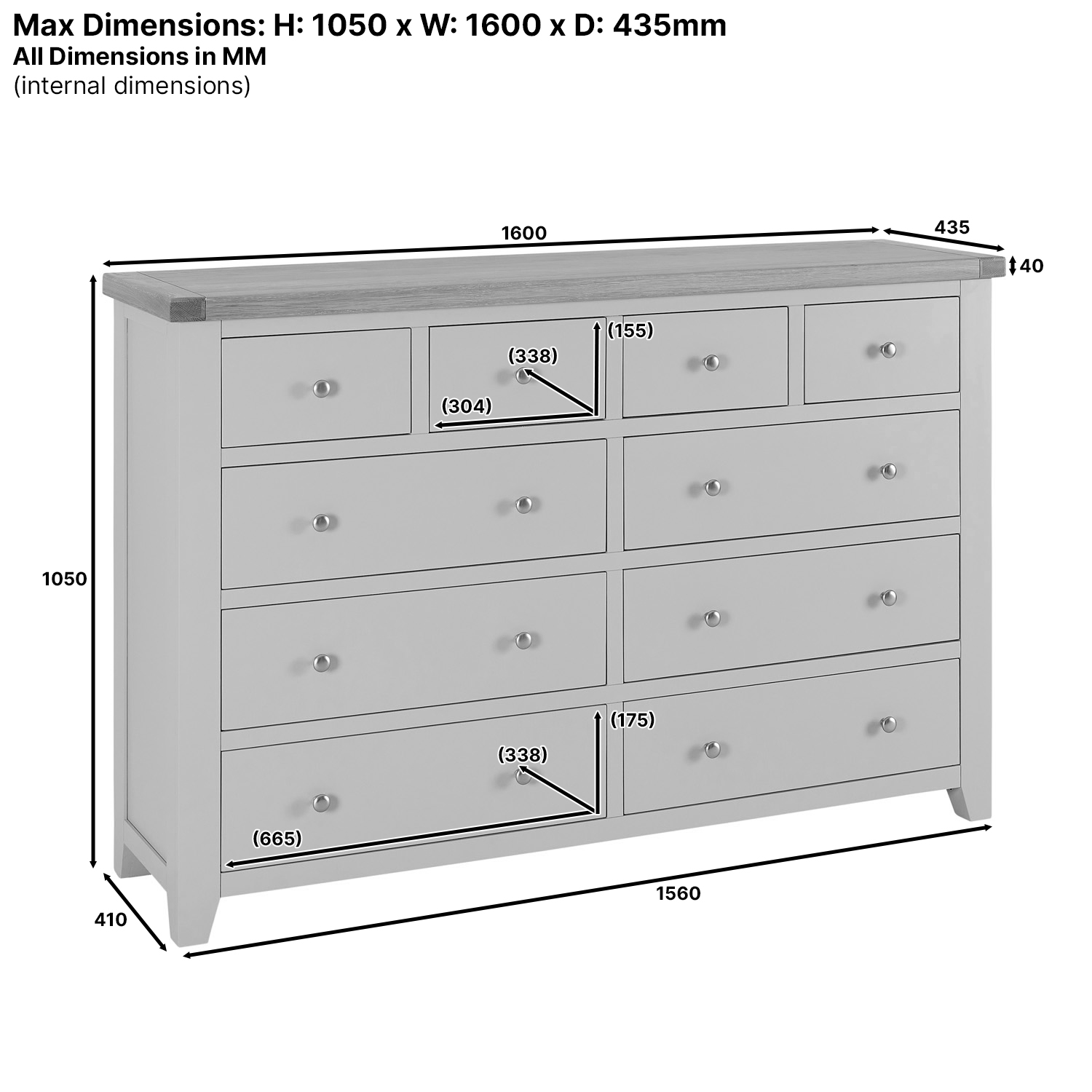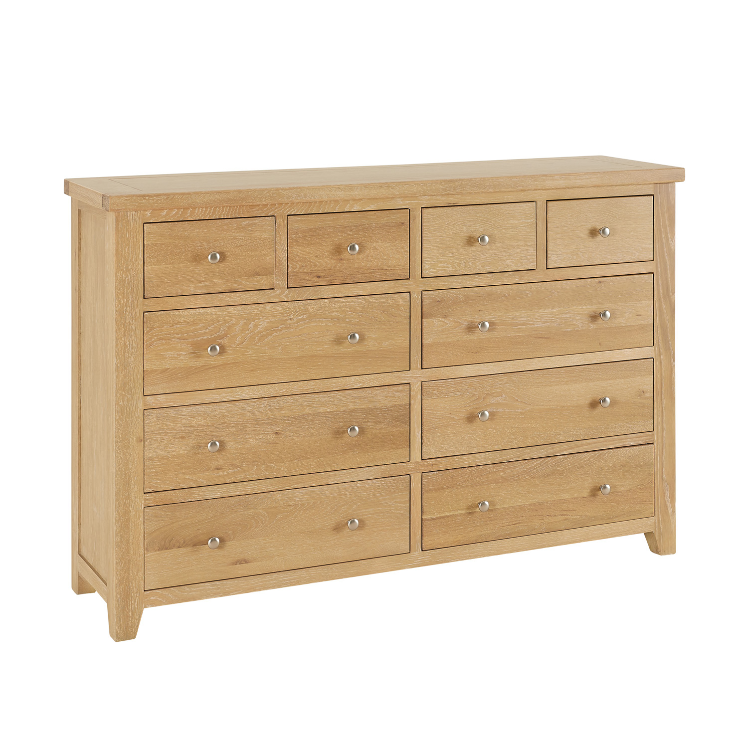 Cheshire Whitewash Oak Jumbo 10 Drawer Chest – Designed for maximum storage without compromising on style, this extra-large chest is the ultimate solution for organising clothing, accessories, and everyday essentials. Thoughtfully arranged with four smaller top drawers and six spacious lower drawers, it provides ample room to keep your belongings neatly stored and organised. The substantial, chunky oak top serves as the perfect surface for decorative accents, whether it’s a framed photograph, a lamp, or treasured ornaments, adding warmth and personality to your space.