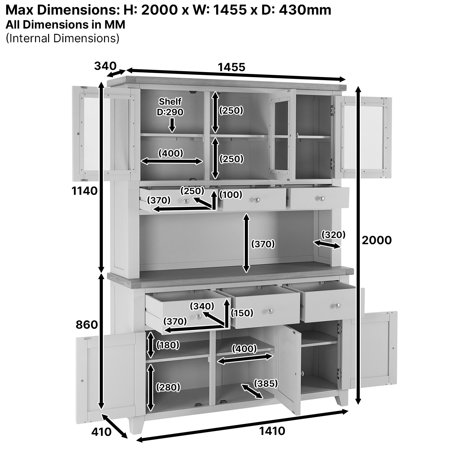 Cheshire Whitewash Oak Large Glazed Dresser – This dresser is a very practical piece of kitchen or dining room furniture that provides huge amounts of storage space. The sideboard base features three spacious drawers and three larger lower cupboards that each have fixed internal shelf. The glazed dresser top features three upper cupboards each with clear safety glass door panels and internal shelves. Directly below this sits three smaller drawers that are great for keeping your spices and other smaller kitchen items.
