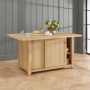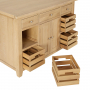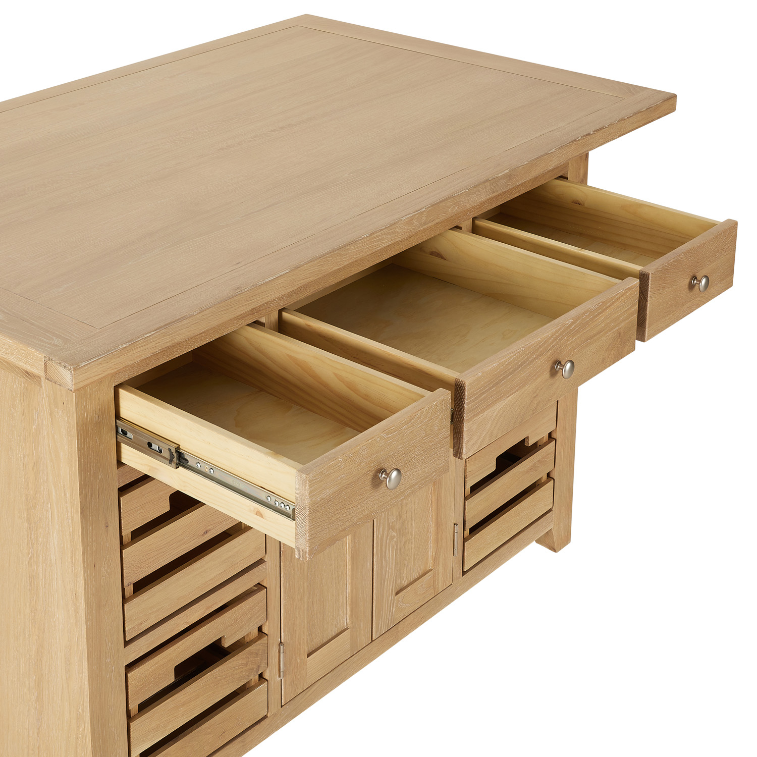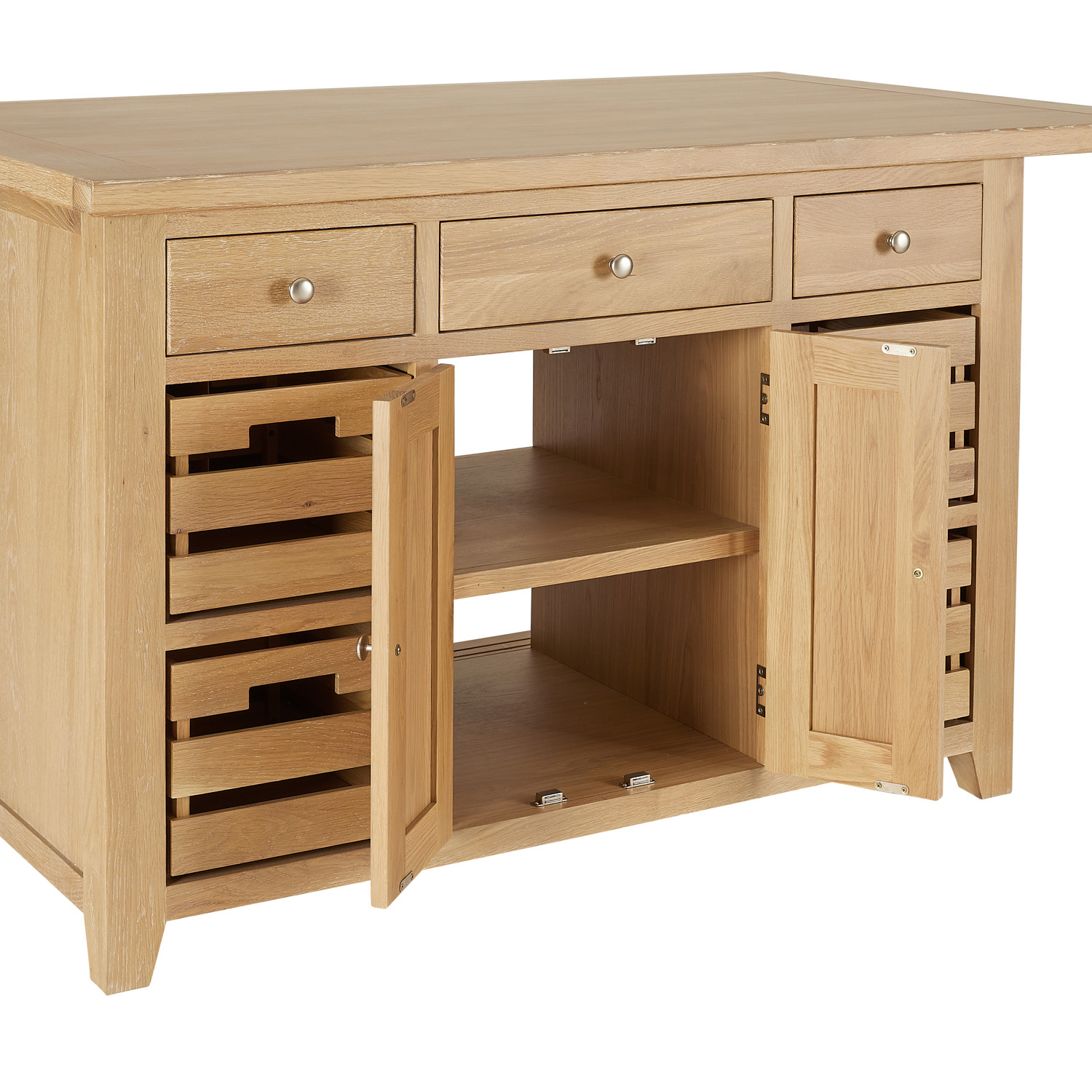 Beyond its elegant design, this kitchen island provides generous storage solutions. It has front-facing storage includes three large drawers, four solid oak crates, and a double-door cupboard, offering an organised space for cookware, utensils, and pantry essentials. The rear sliding cupboard doors grant easy access to the full-width internal shelving, maximising storage capacity without compromising accessibility. The drawers benefit from smooth-glide, heavy-duty metal drawer runners ensuring effortless opening and closing, while height adjustable feet provide easy levelling on uneven floors.