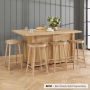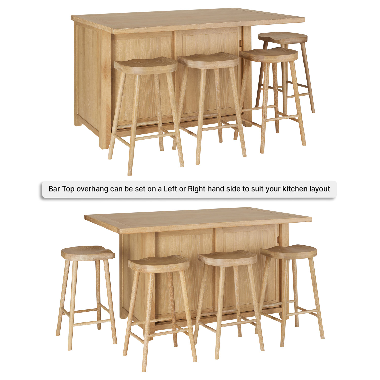 The spacious bar-style tabletop comfortably accommodates four bar stools—three positioned along the back and one at the side—creating an inviting space for casual dining or social gatherings. The top features a configurable overhang, allowing you to position it on the left or right, ensuring seamless integration with your kitchen layout. With 30cm overhangs at the back and one side, it offers ample legroom for relaxed seating.