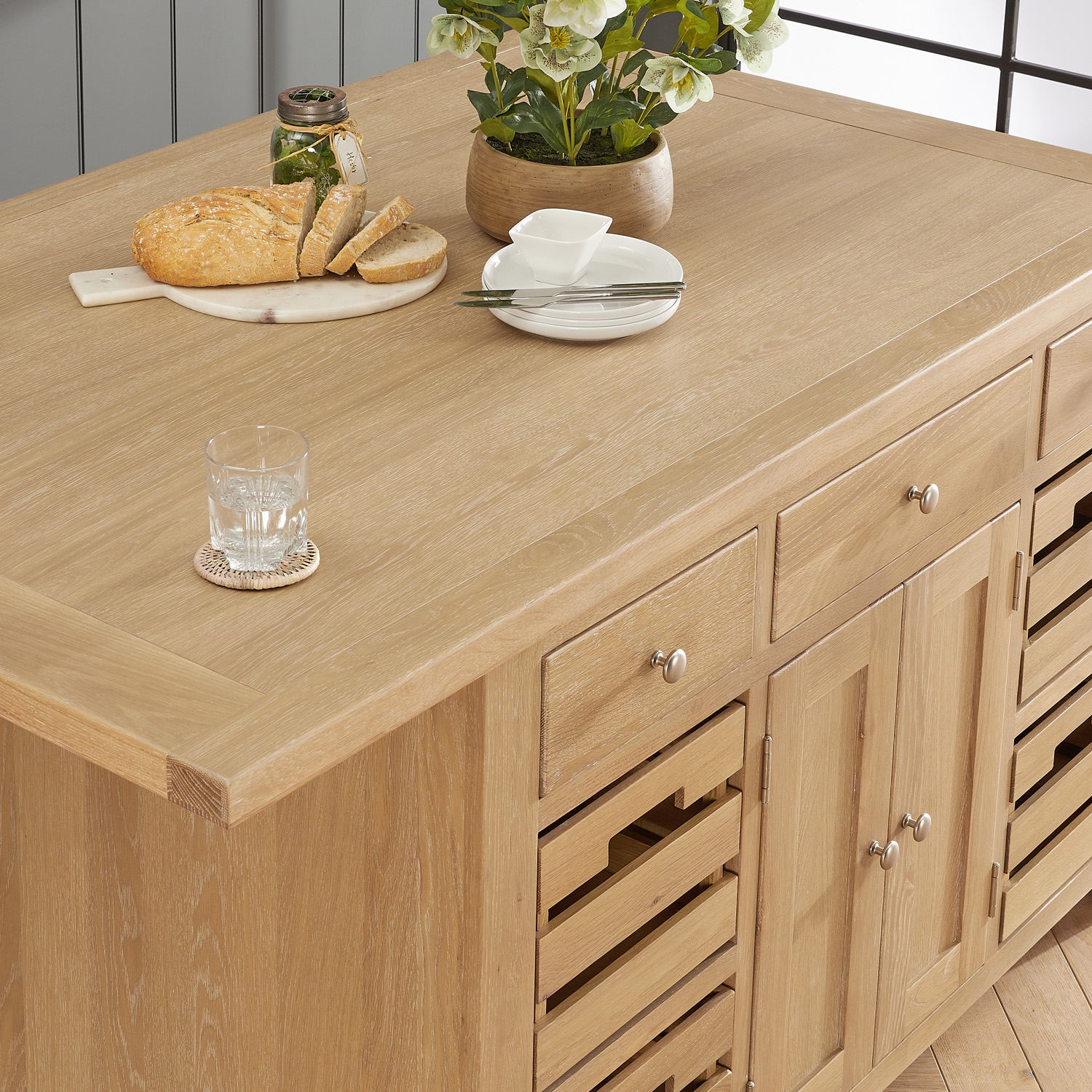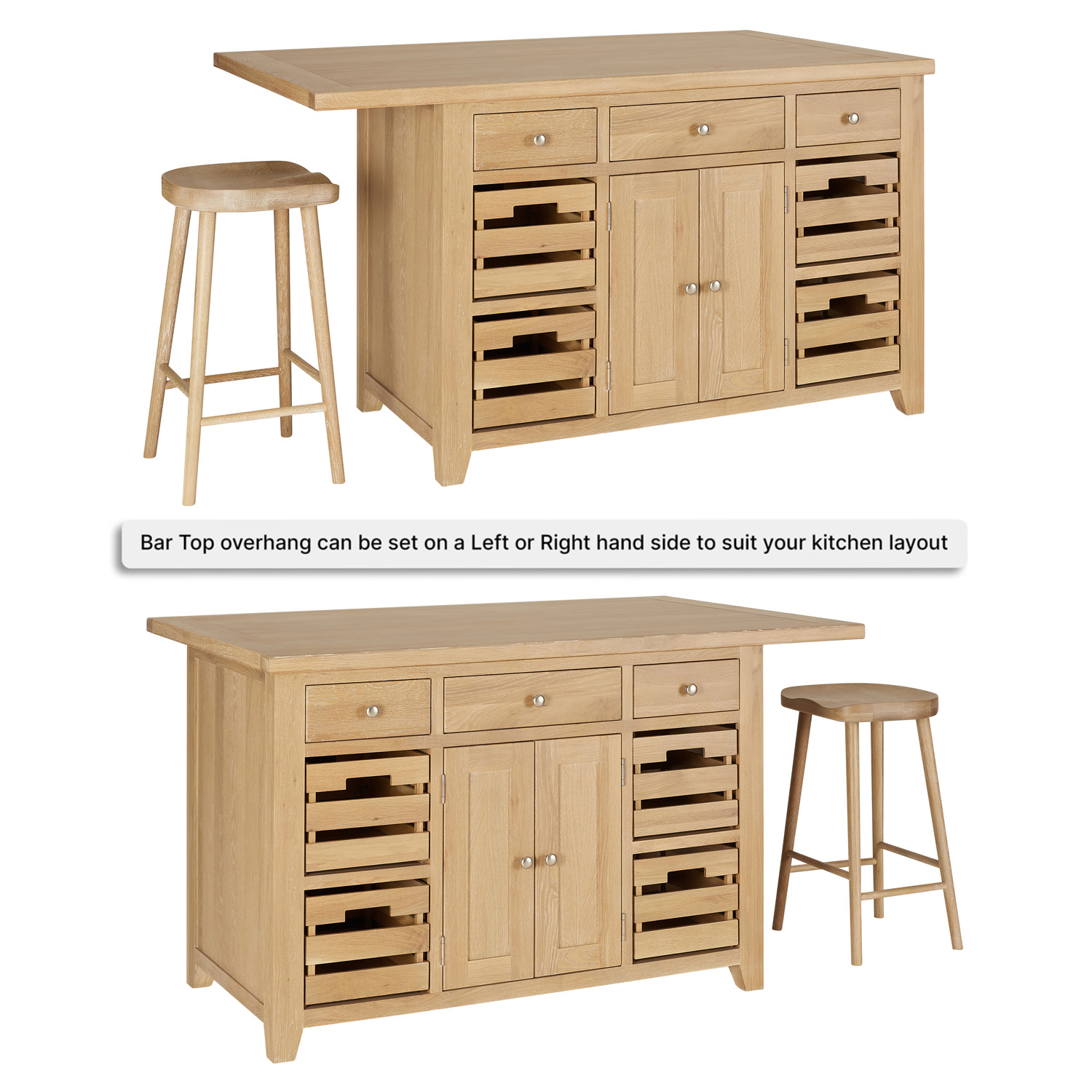 Cheshire Whitewash Oak Large Kitchen Island with Bar Table Top – Elevate your kitchen with the Cheshire Oak Large Kitchen Island, a statement piece designed for both practicality and style. Combining the convenience of an island with the functionality of a dining table, this versatile unit is perfect for entertaining, storage, and everyday use.