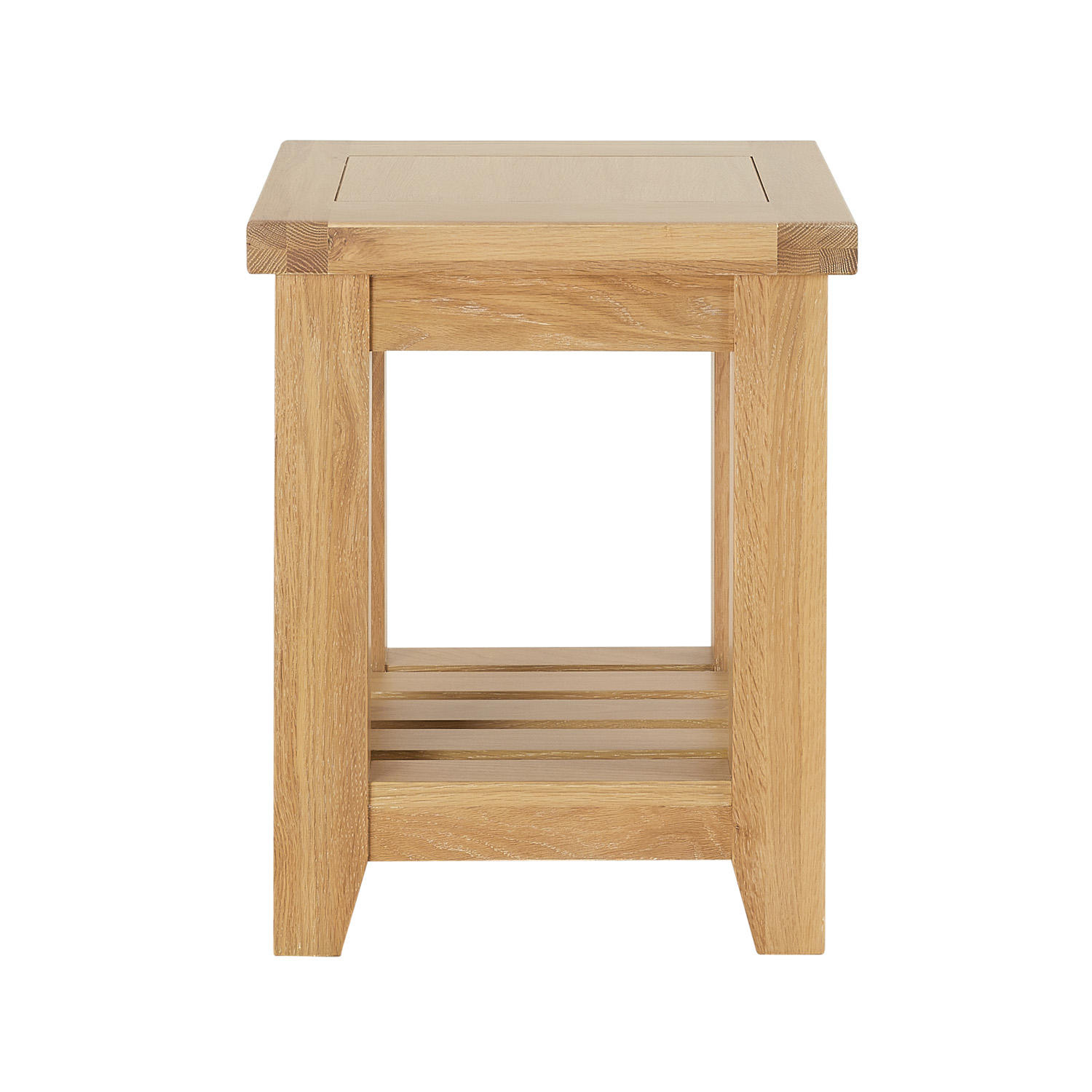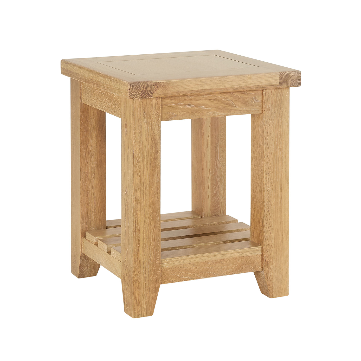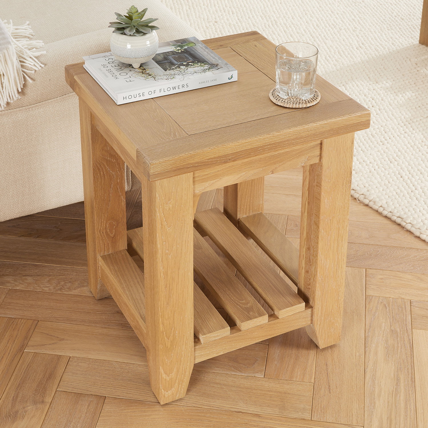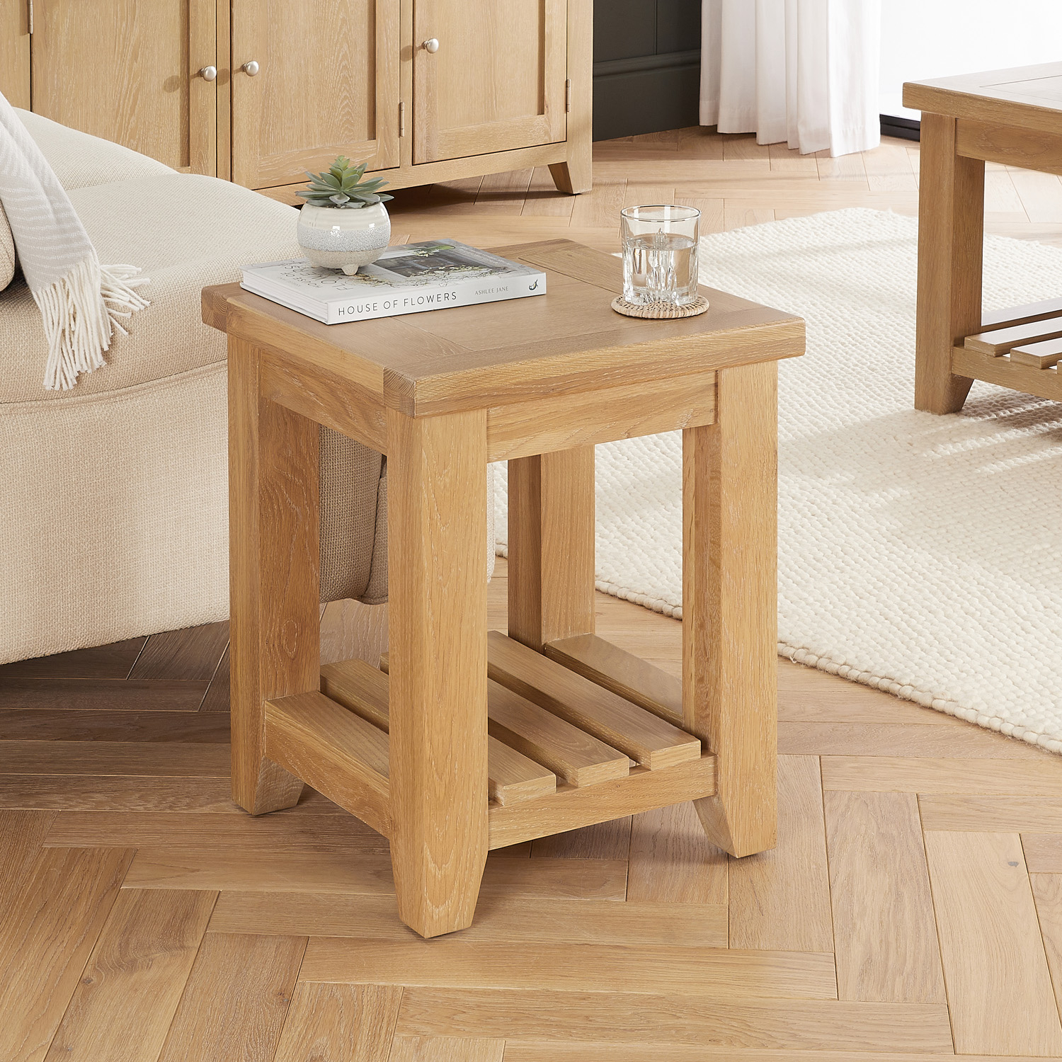 Cheshire Whitewash Oak Side Lamp Table – A versatile and beautifully crafted addition to any home, this oak lamp table effortlessly blends style with practicality. Designed to complement both living spaces and bedrooms, it works just as well beside a sofa or armchair as it does serving as a bedside table. With its substantial proportions and robust oak construction, this chunky lamp table exudes quality and durability. It is a heavy side table due to the solid oak legs and it has a slatted lower shelf that adds both character and functionality, providing the perfect space for storing magazines or housing a decorative rattan basket.