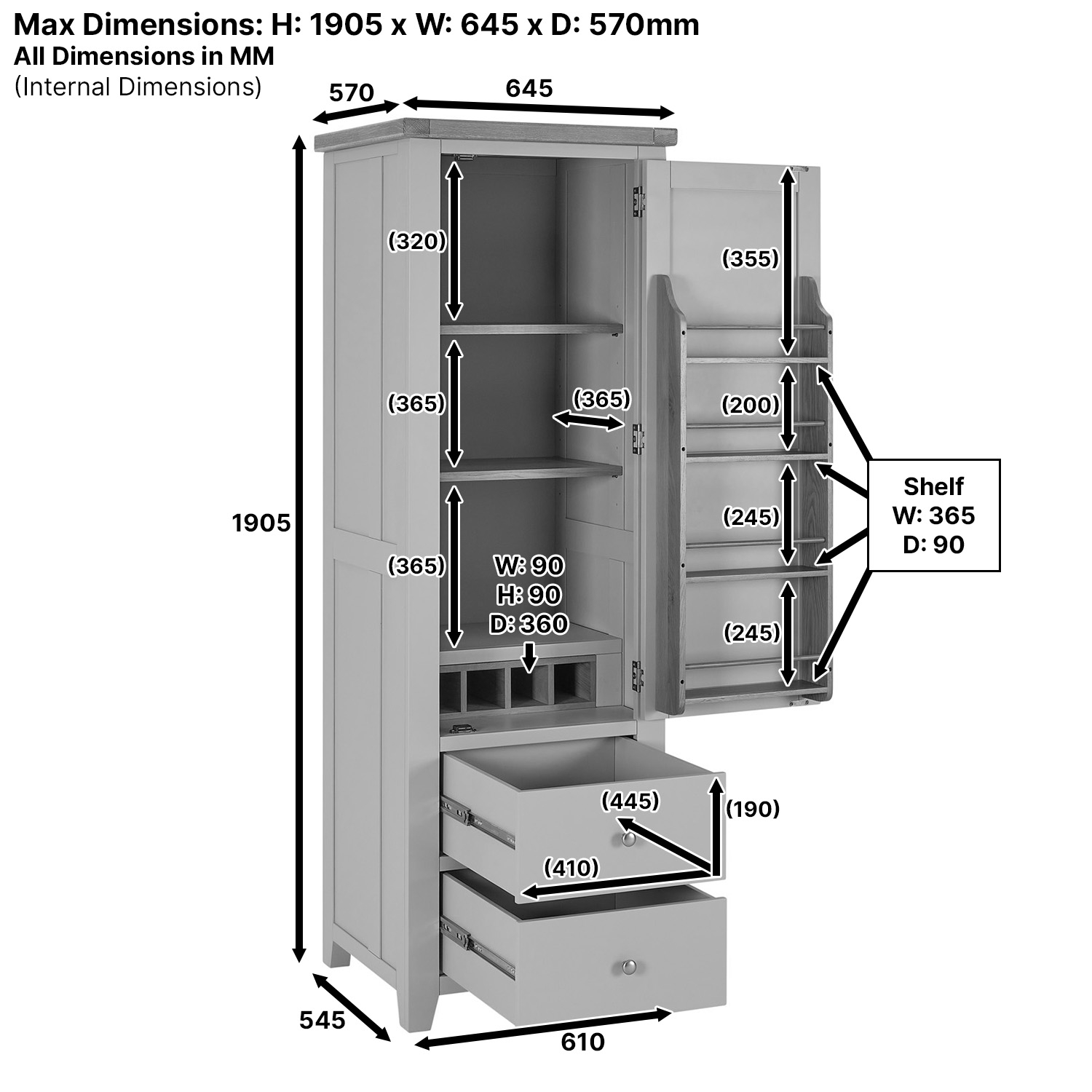 Cheshire Whitewash Oak Single Kitchen Larder Cupboard – This larder cupboard provides loads of storage for your food and drink without taking up too much floor space. The upper cupboard area features three open shelf areas with the two oak shelves being fully height adjustable so you can configure it to your storage needs. The lower part of the cupboard has a four bottle oak wine rack and the inside of the door has a four shelf rack which is perfect for storing your jars, bottles, tins etc. The lower part of the unit features two large drawers with telescopic drawer runners making for easy opening and closing especially when they are laden with the heavy crockery.