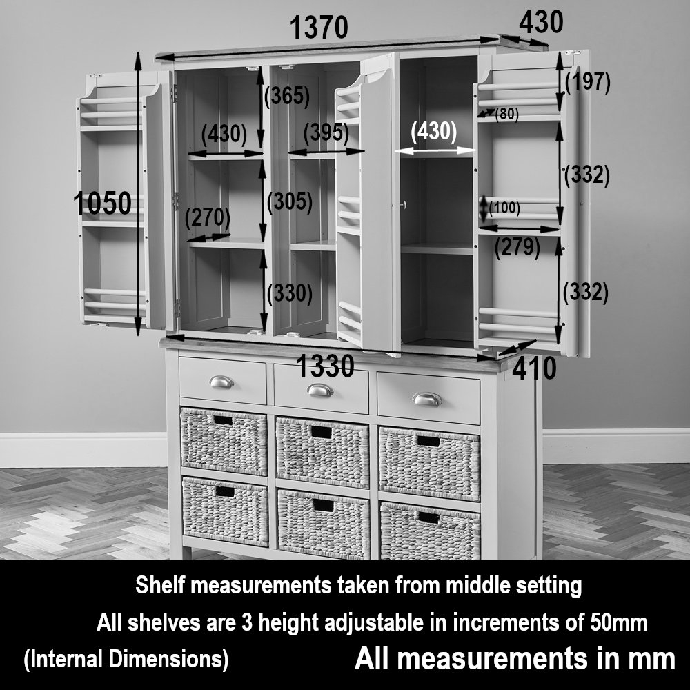 The larder cupboard top features three cupboard doors each with two internal shelves that are 3 stage height adjustable in increments of 50mm and the inside of the doors each have three shelf racks which are perfect for storing your jars, bottles and tins etc.