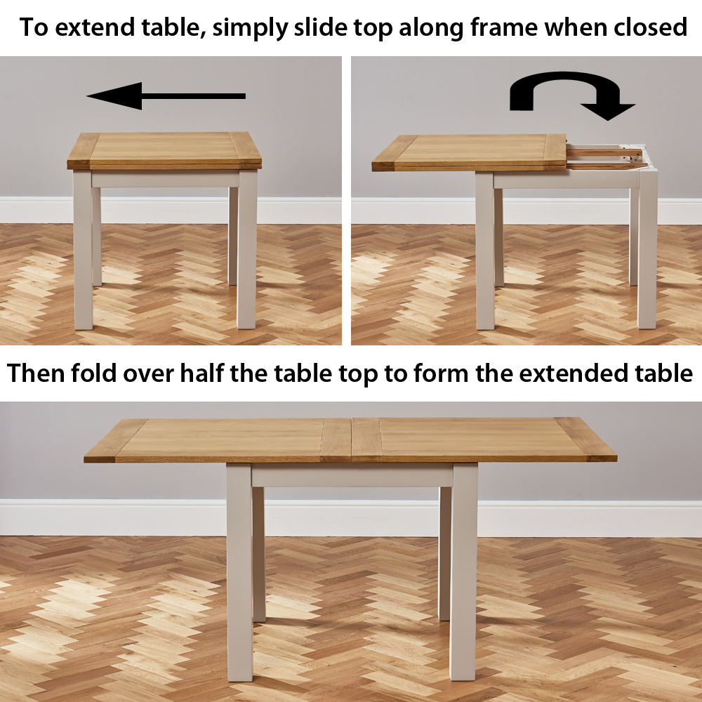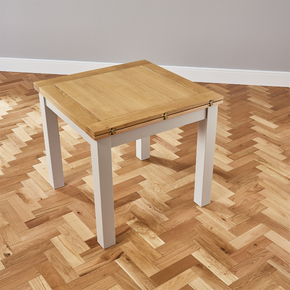 This Cotswold Grey painted square flip-top dining table is the perfect solution for small dining spaces when there is only the normal requirement for seating of 2 or 4 people at the table. But at occasional times you need seat more at your table you can simply double the size of the table top by folding the top over and this then makes space for 6 or even 8 people at a squeeze.