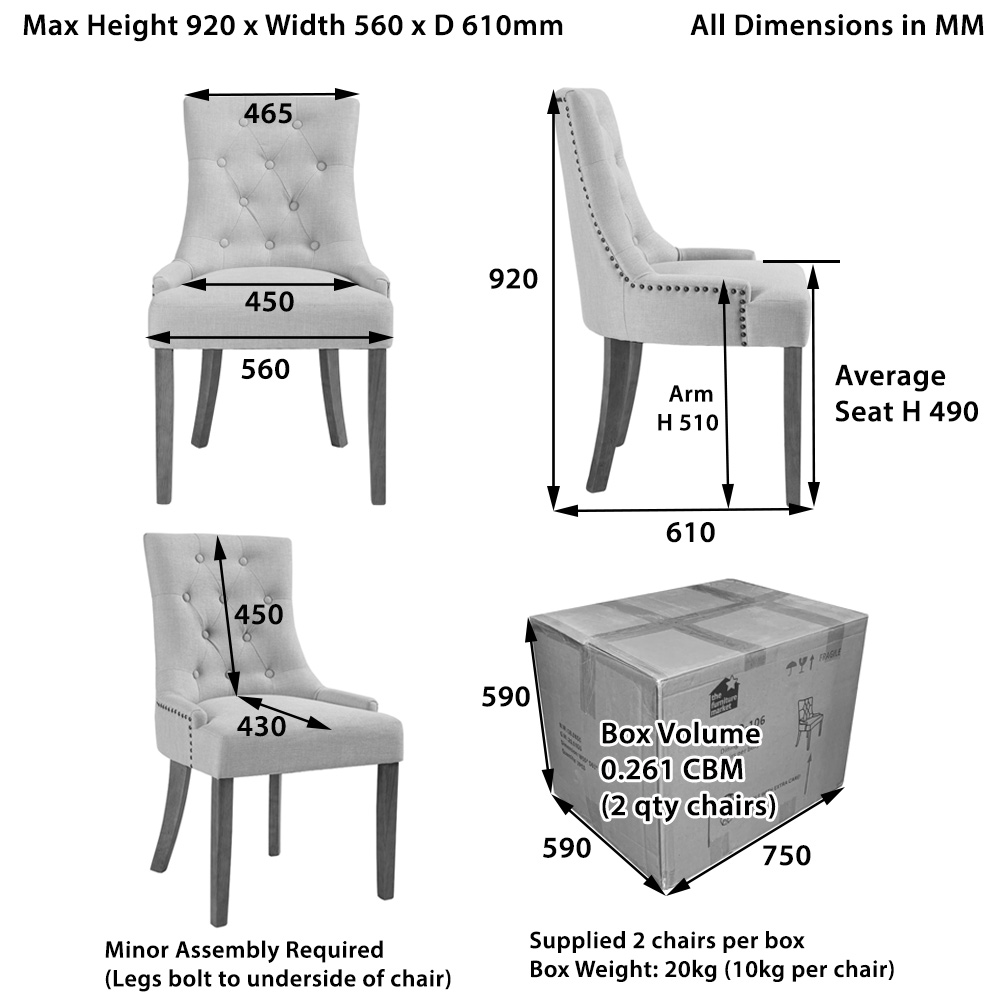 The Luxurious dining chairs are very comfortable due to the curved scoop back design and button upholstered back rest. They are hand upholstered in a high quality natural linen fabric that is easy to clean and robust for everyday use. The chairs have bronze stud detailing on the back and sides and the legs are made from solid hardwood with an oak stain.