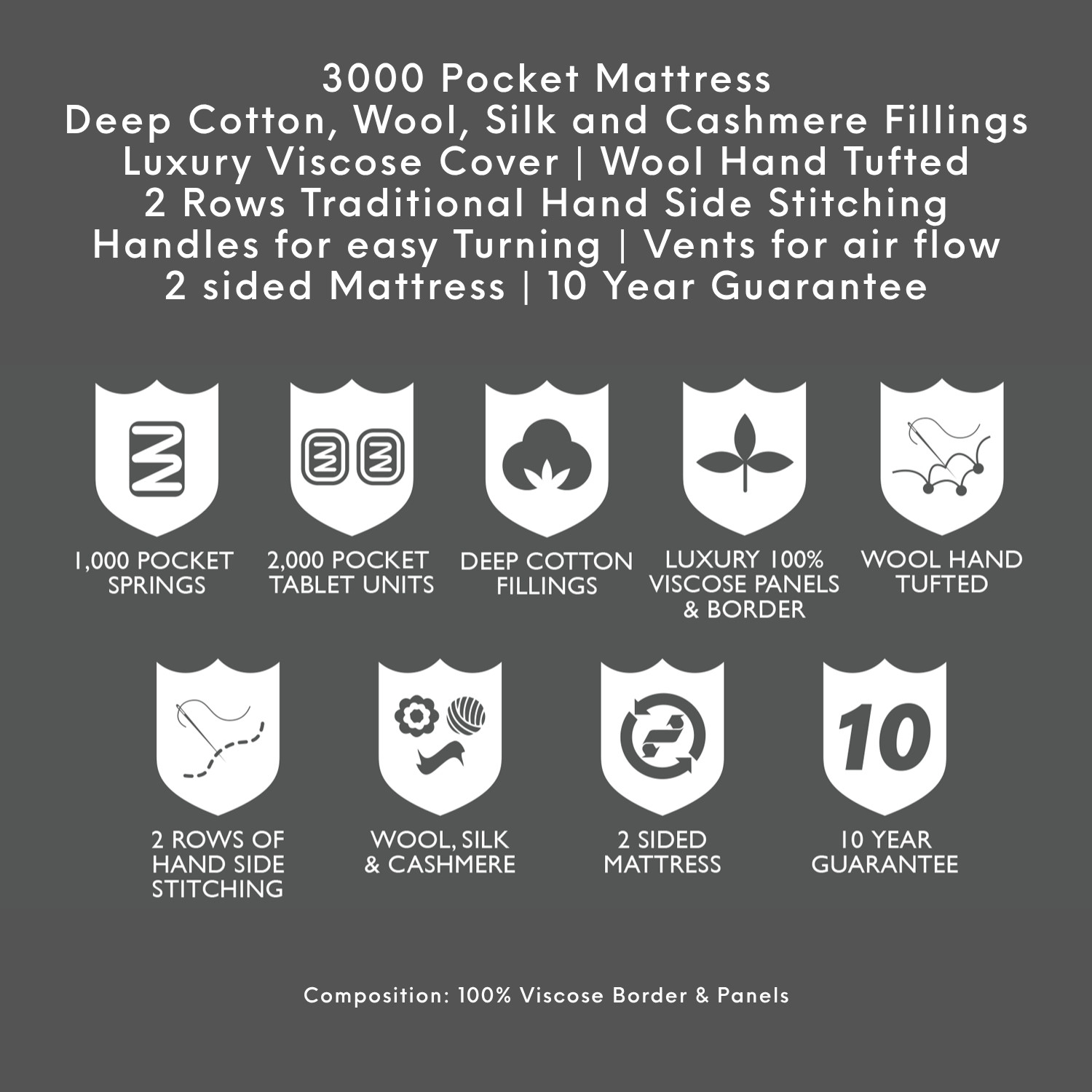 Enjoy 5 star hotel comfort at home with the Eden Pocket 3000 mattress. This luxury mattress is designed to deliver premium comfort without the premium price. This mattress brings together traditional craftsmanship, luxurious natural fillings such as silk and cashmere and an advanced 3000 count pocket spring system to deliver a dreamy night’s sleep.