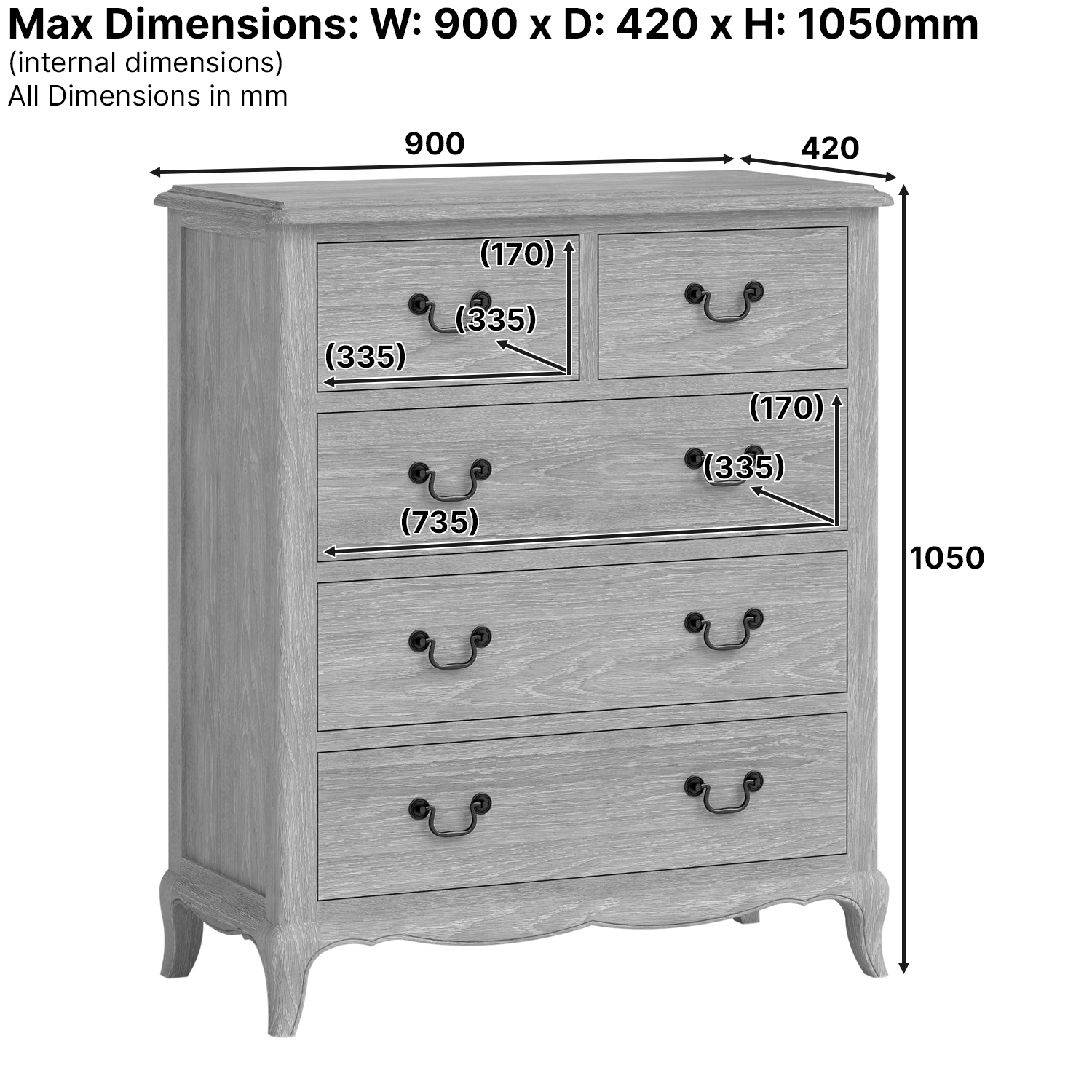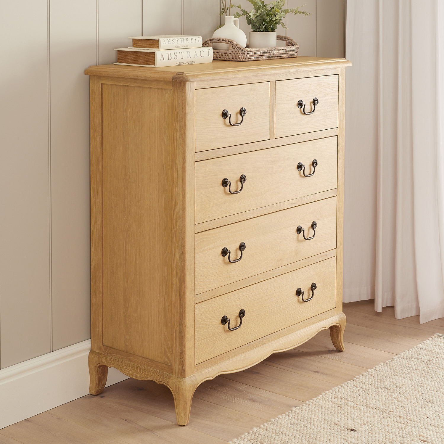 French Chateau Oak 2 over 3 Drawer Chest - A beautiful addition to your bedroom that combines practicality with classic French charm. This large bedroom chest has two smaller drawers over three larger drawers that provide plenty of storage space for clothes. It is crafted to bring a touch of sophistication and warmth to your bedroom, making it both a functional and decorative piece. Designed for flexibility, this chest can enhance your bedroom or add elegant storage to your living room.