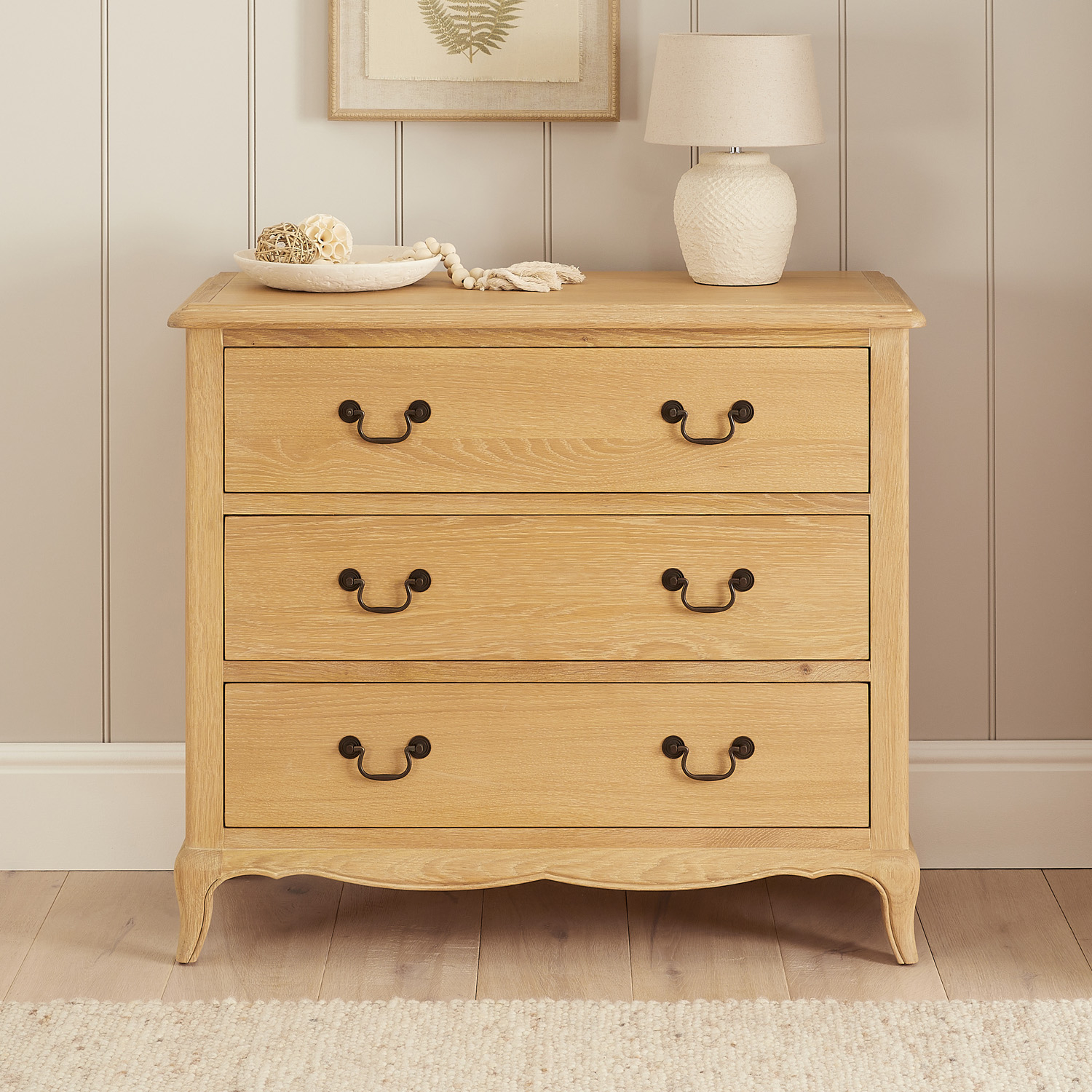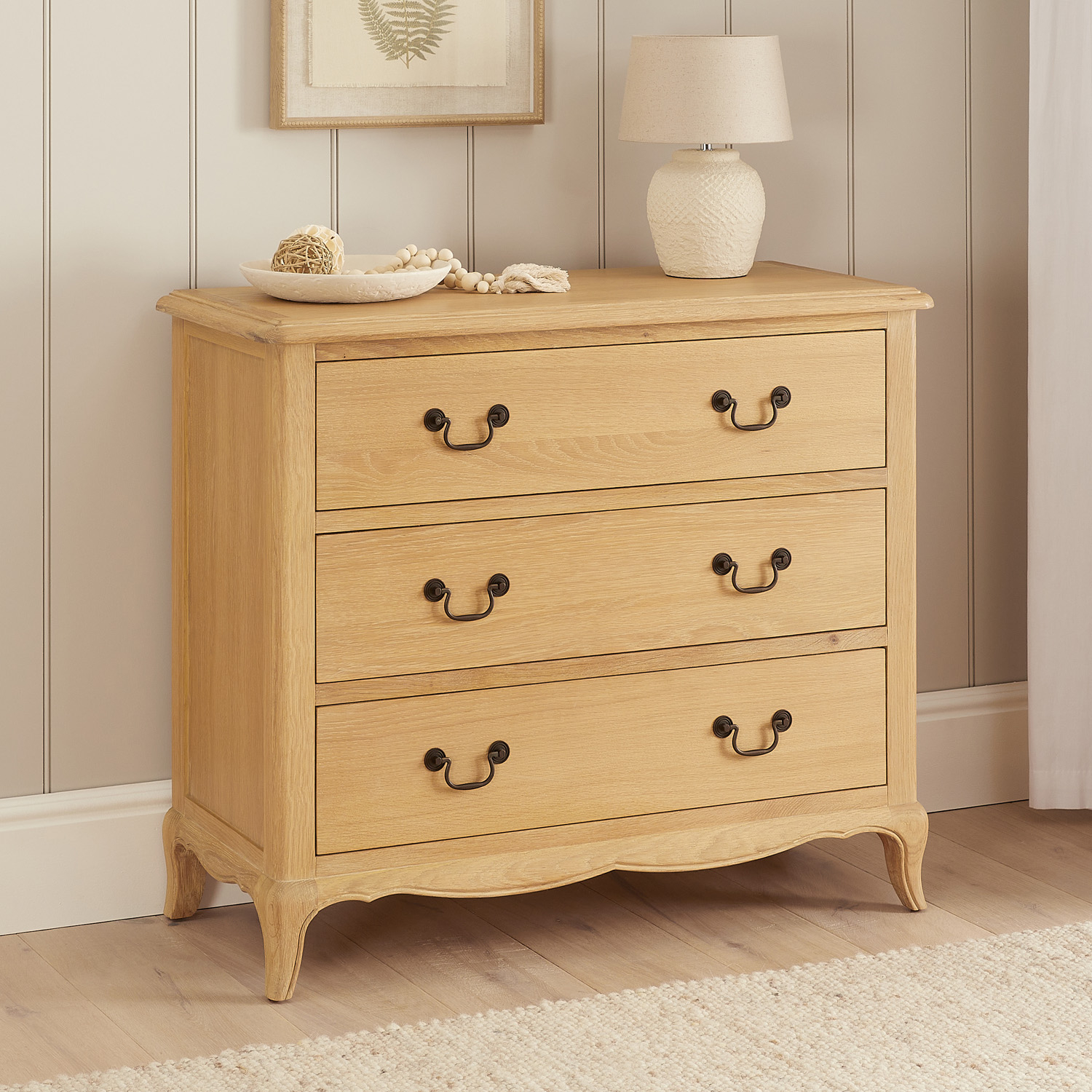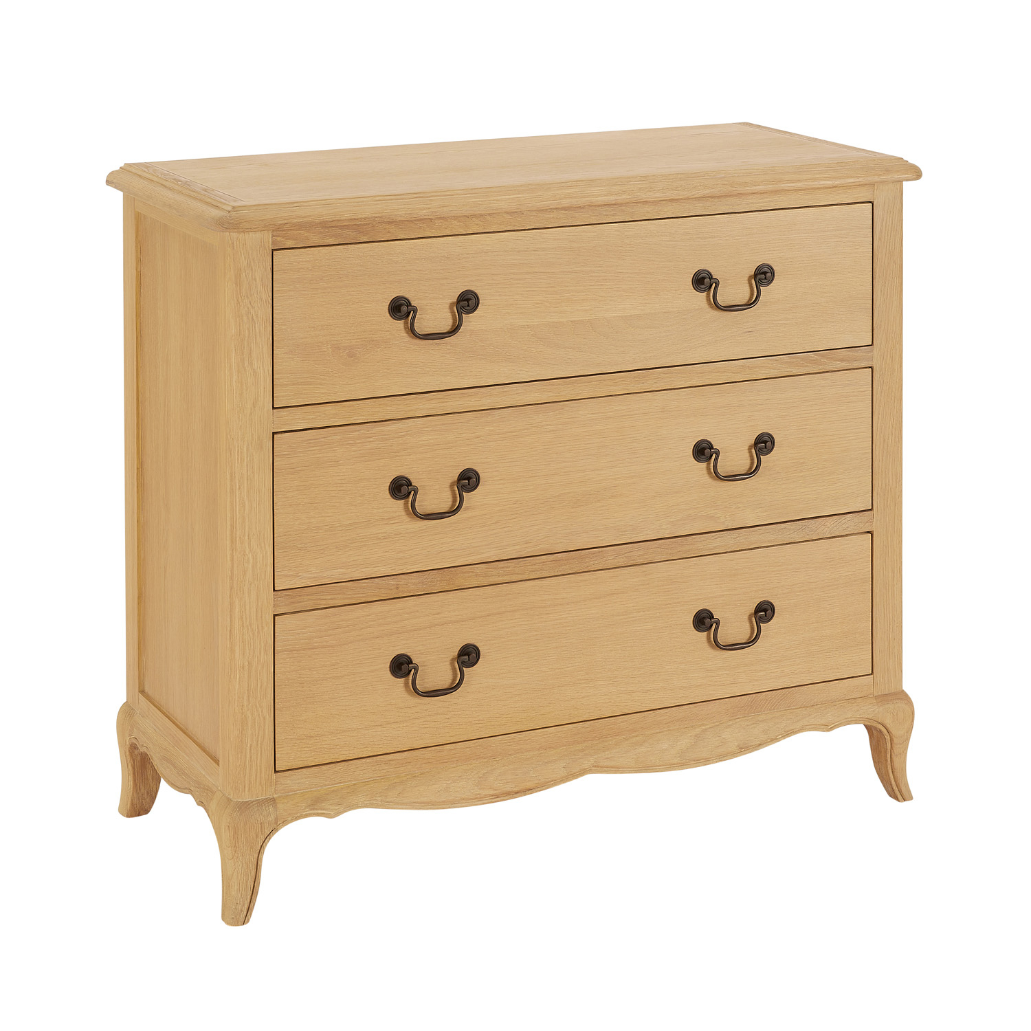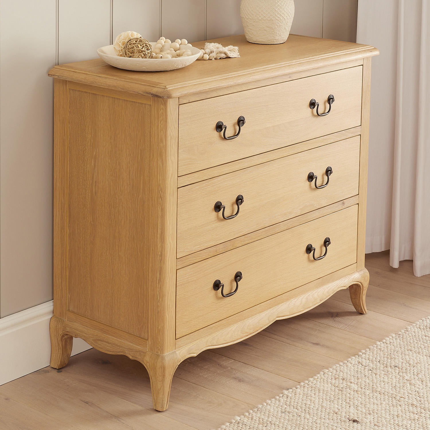 French Chateau Oak 3 Drawer Chest - A beautiful addition to your bedroom that combines practicality with classic French charm. This mid-sized bedroom chest has three drawers that are generous and practical in size. It is crafted to bring a touch of sophistication and warmth to your bedroom, making it both a functional and decorative piece. Designed for flexibility, this chest can enhance your bedroom or add elegant storage to your living room.
