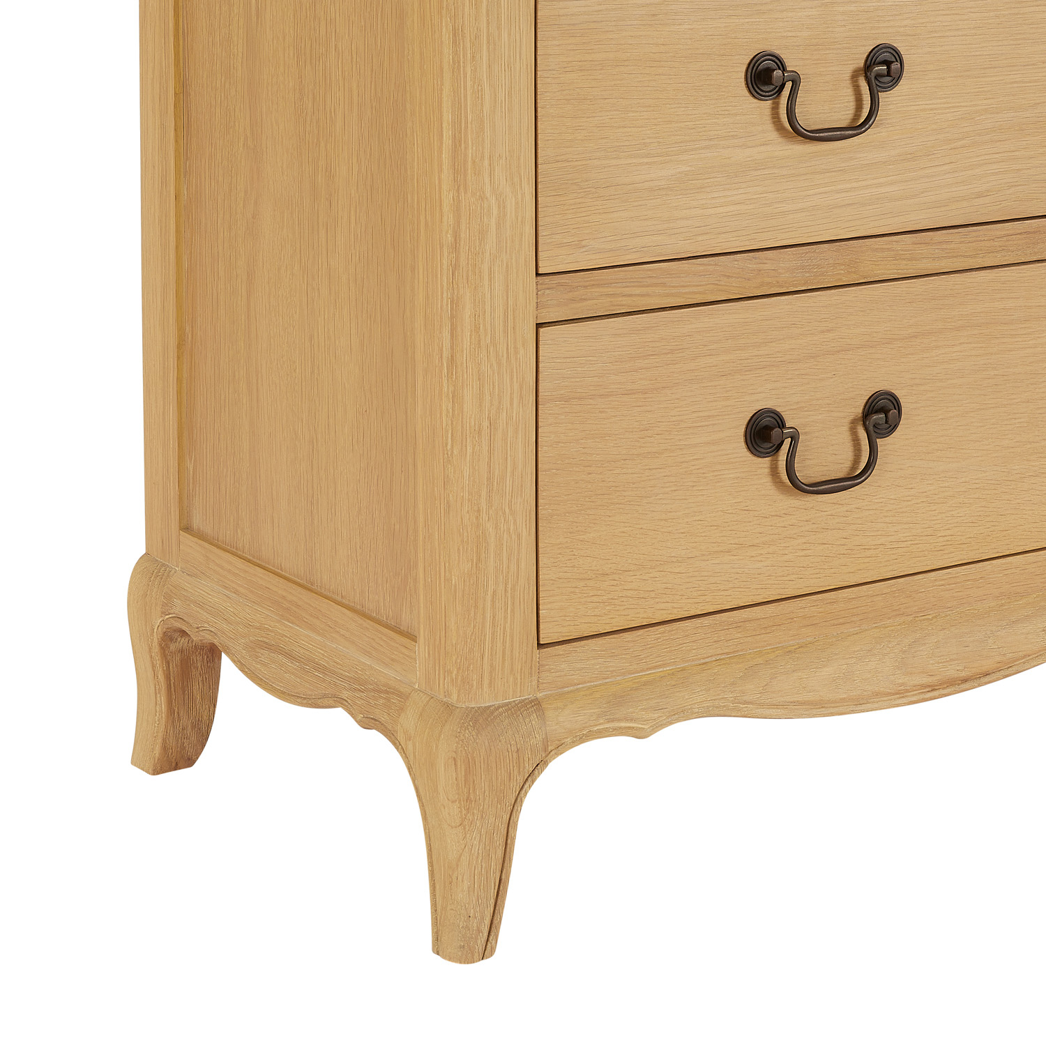Classic French Design - This French Oak chest is sure to enhance the elegance of any bedroom decor. Inspired by the grandeur of French chateaux, this furniture celebrates authentic craftsmanship and refined detail. Hand-carved cabriole legs and graceful curves bring character and elegance, while the natural beauty of solid oak ensures strength and durability. The top features a gently curved thumbnail edge, adding depth and elegance to the design.