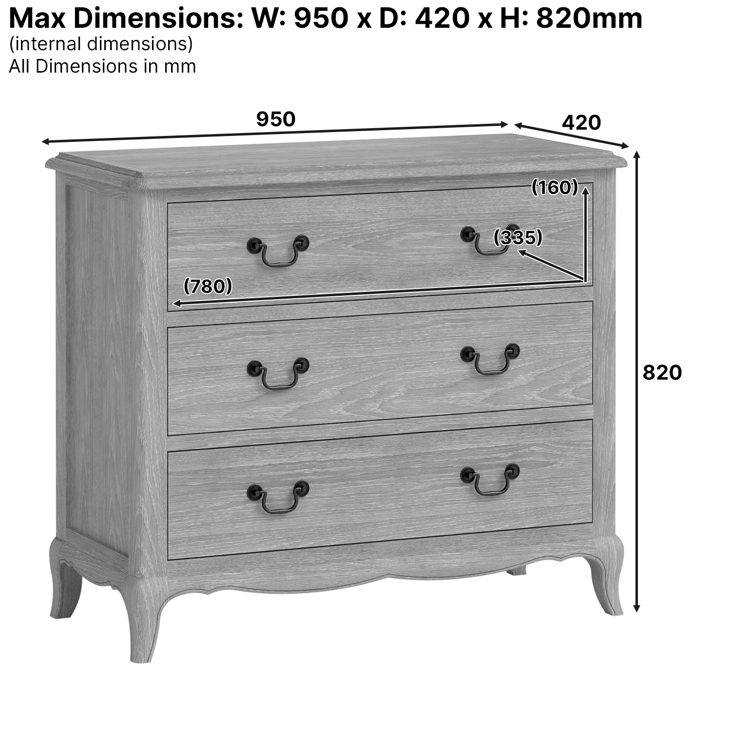 Antique Bronze Handles – The drawer fronts feature elegant antique bronze swan-neck drop handles, adding a touch of sophistication and complementing the classic French style.