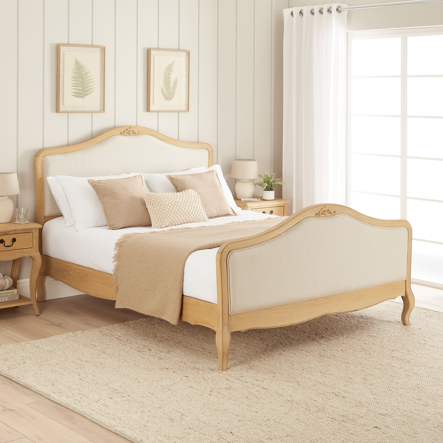 French Chateau Oak 4ft 6in Double Size Bed - A striking centrepiece for any bedroom, this French-style double bed combines timeless elegance with everyday practicality. The headboard and footboard are hand-upholstered in high-quality natural linen, offering comfort, durability, and refined style. A delicately piped border enhances the luxuriously padded panels, while the solid oak frame features graceful curves and enduring strength. Crafted with care, this bed brings warmth, sophistication, and lasting charm to your home. Its soft, neutral tones make it effortlessly versatile, complementing both classic and contemporary interiors.