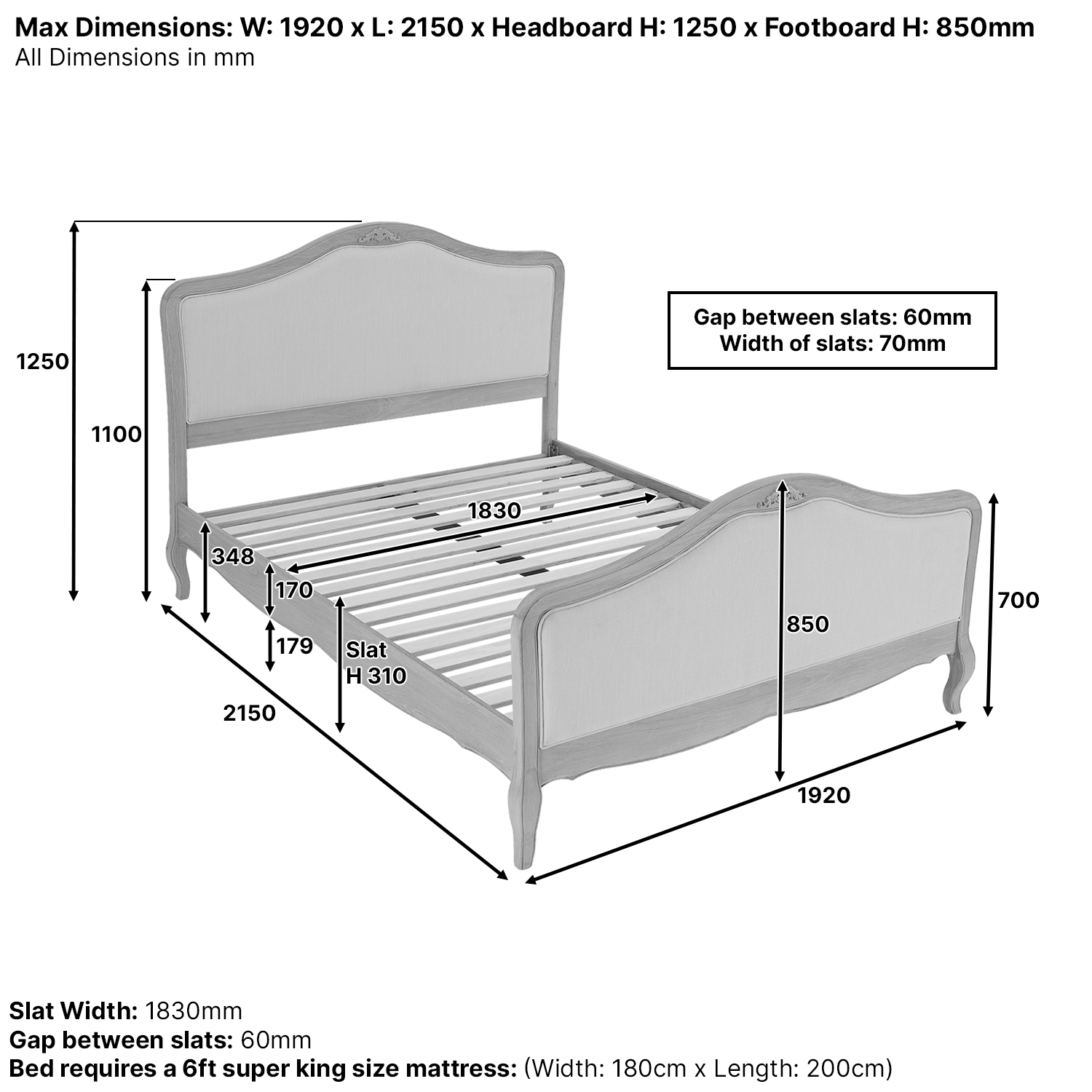 French Chateau Oak 6ft Super King Size Bed - A striking centrepiece for any bedroom, this French-style super king size bed combines timeless elegance with everyday practicality. The headboard and footboard are hand-upholstered in high-quality natural linen, offering comfort, durability, and refined style. A delicately piped border enhances the luxuriously padded panels, while the solid oak frame features graceful curves and enduring strength. Crafted with care, this bed brings warmth, sophistication, and lasting charm to your home. Its soft, neutral tones make it effortlessly versatile, complementing both classic and contemporary interiors.