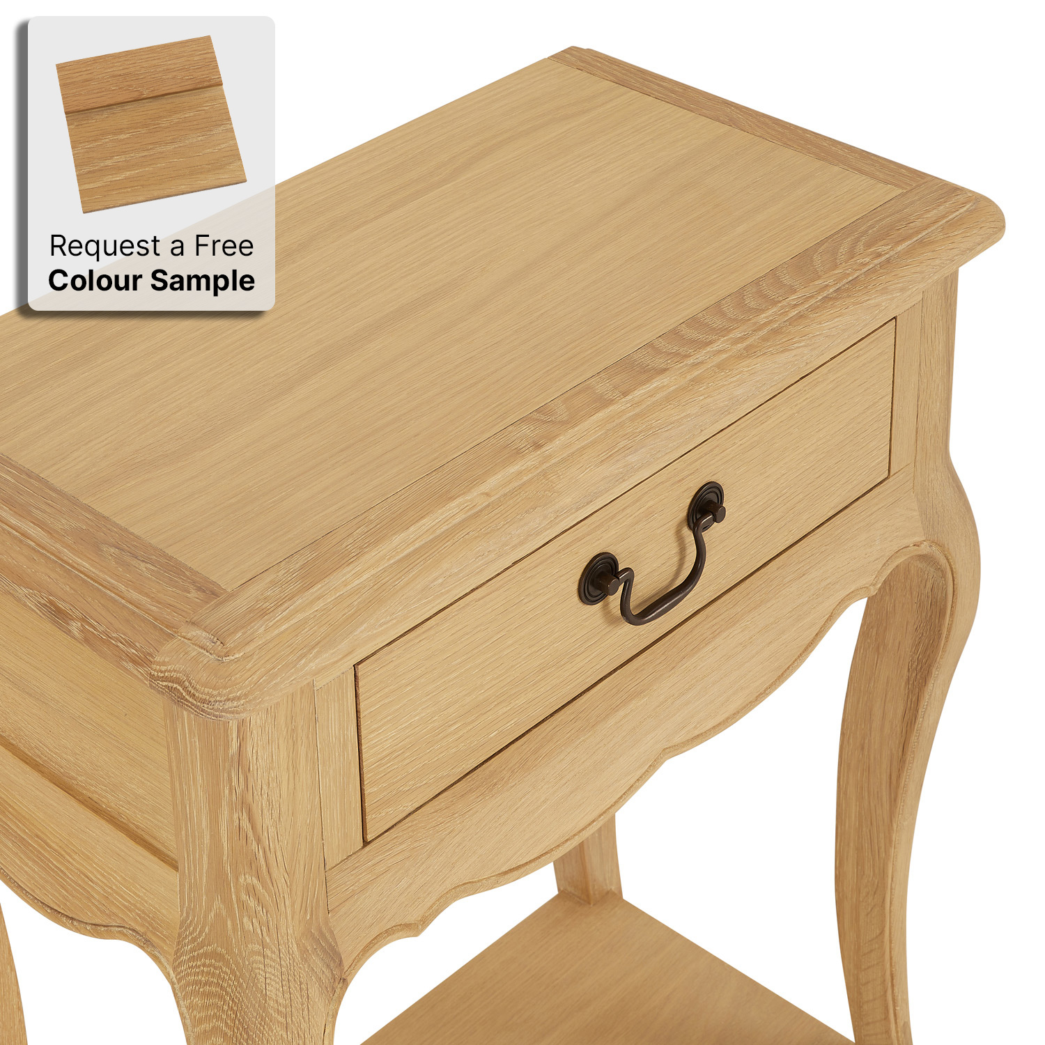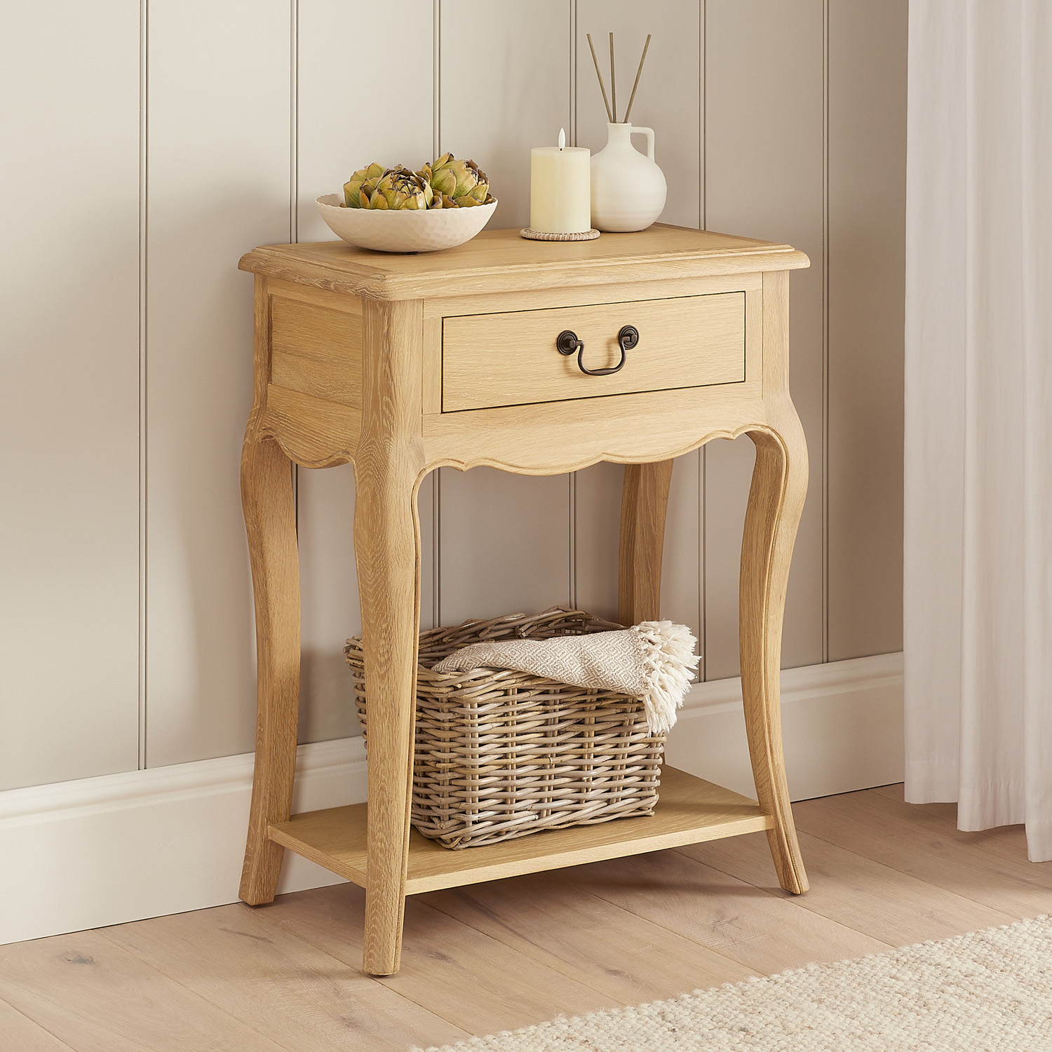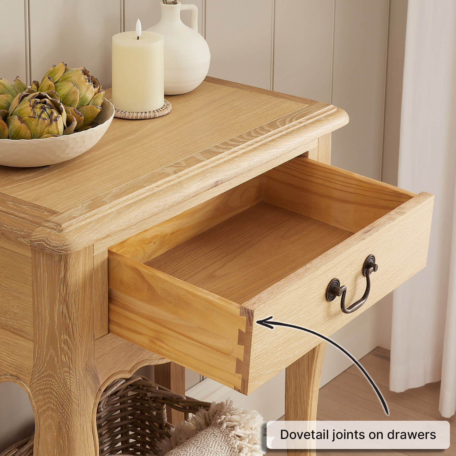 French Chateau Oak Small Console Table - A charming and practical addition to your home, this small console table blends timeless French elegance with everyday functionality. Perfect for a hallway, it provides a convenient spot to set down your keys, while the lower shelf is ideal for a decorative basket or shoes. The spacious drawer offers practical storage for everyday essentials, and the design is versatile enough to be used as a lamp table or side table in your living room. The frame is crafted from solid oak with refined detailing, this piece brings warmth, sophistication, and enduring style to any space.