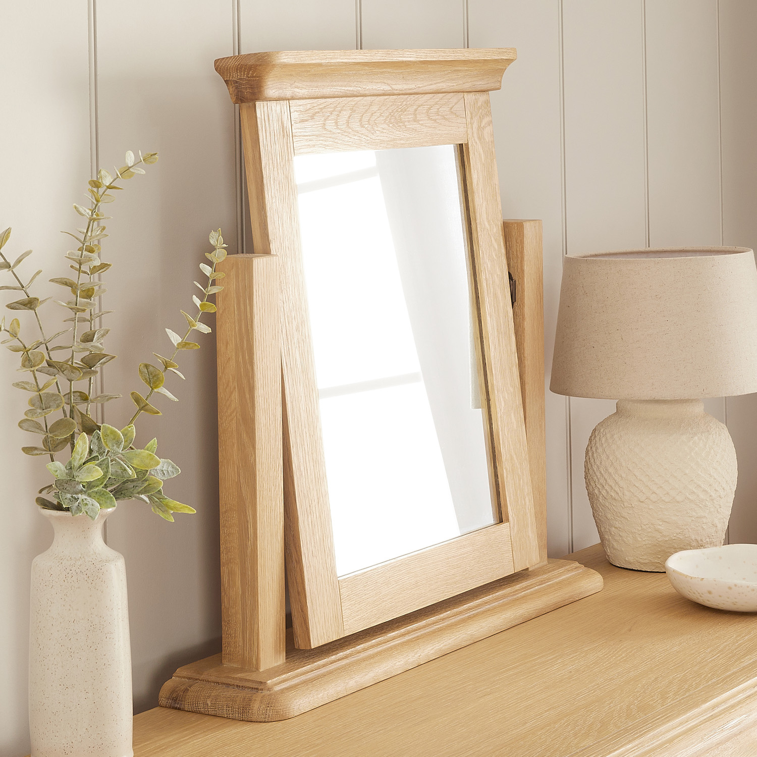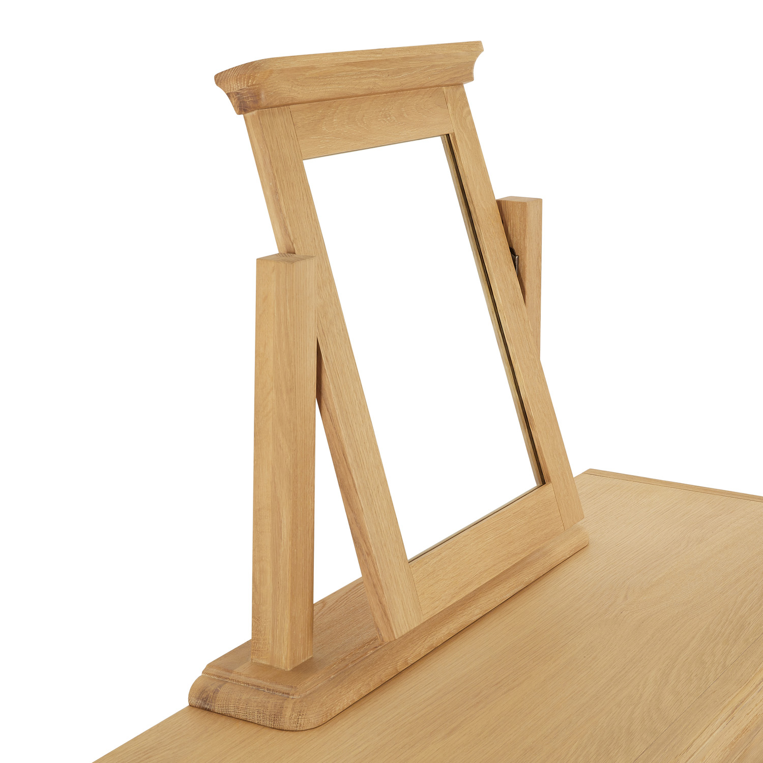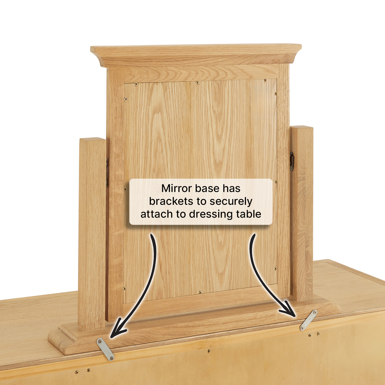 French Chateau Oak Vanity Mirror - A stylish and practical dressing table mirror which will make a fabulous addition to any dressing table area. Its practical design has an adjustable hinged mirror that allows for you to tilt the mirror to your preferred angle. The mirror frame base has screw brackets on the back allowing you to easily and safely secure the mirror to the back of your dressing table top.