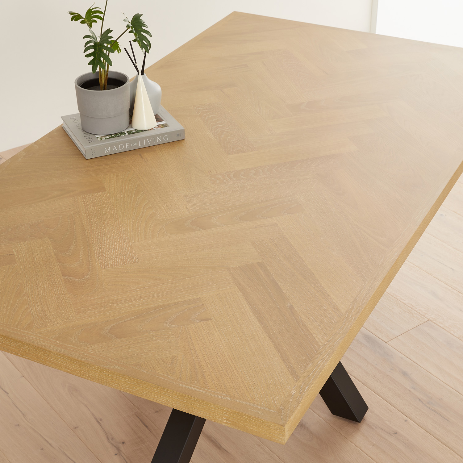 Limed Oak Herringbone Top The 40mm thick oak top has a herringbone parquet design that is absolutely stunning and has a limed oak finish that really brings out the natural beauty in the oak grain. The top has been hand crafted using thick oak veneers for increased strength and durability over time and has a protective matt lacquered finish that is hardwearing and maintenance free.