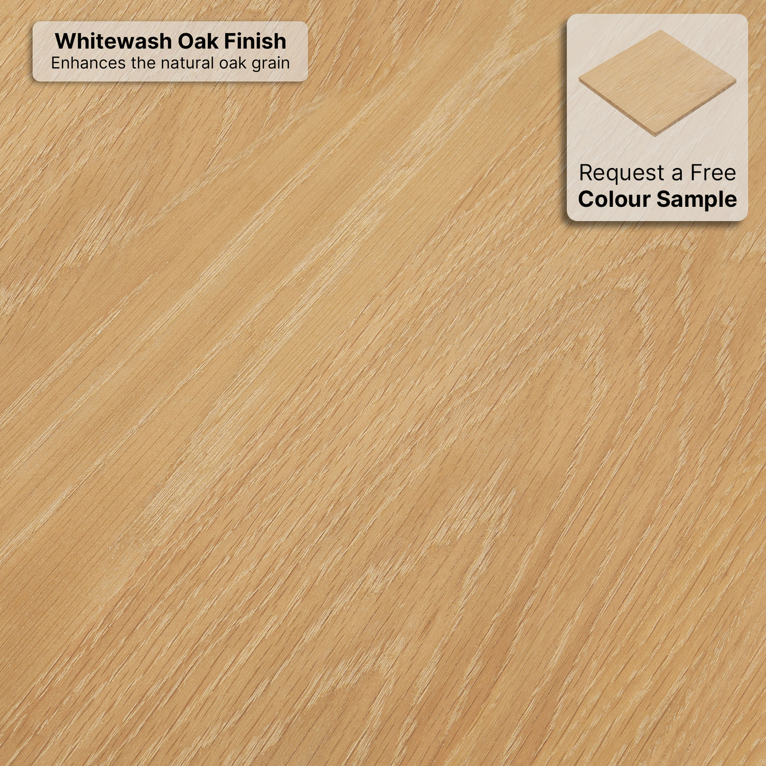 Natural Oak with a light whitewash finish – Crafted from natural oak, with a hand-applied light whitewash finish that subtly softens and accentuates the oak’s natural grain, creating a beautifully refined, airy aesthetic. The finish is complemented by a durable oiled finish, offering exceptional protection while preserving the oak’s natural charm. Designed for effortless upkeep, this furniture is maintenance-free and can be easily cleaned with a damp cloth, ensuring its timeless appeal remains pristine for years to come.