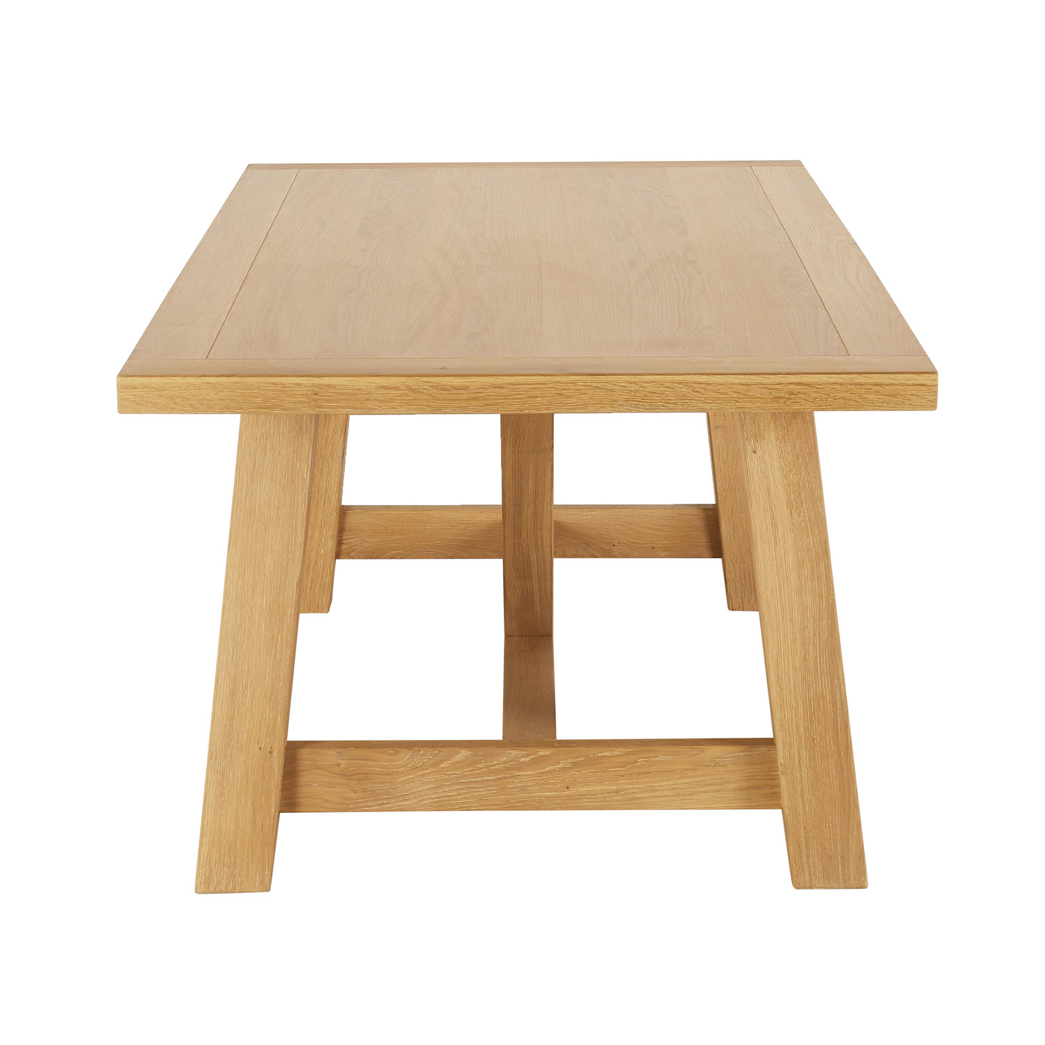 Distinctive Trestle Design – The dining table is designed in a classic trestle style with its angled legs connected by a horizontal stretcher, ensuring both stability and architectural appeal. The chunky oak design features clean lines, two sturdy angled leg frames made using 100mm square leg posts, and a substantial 50mm thick oak top, exuding strength and sophistication.