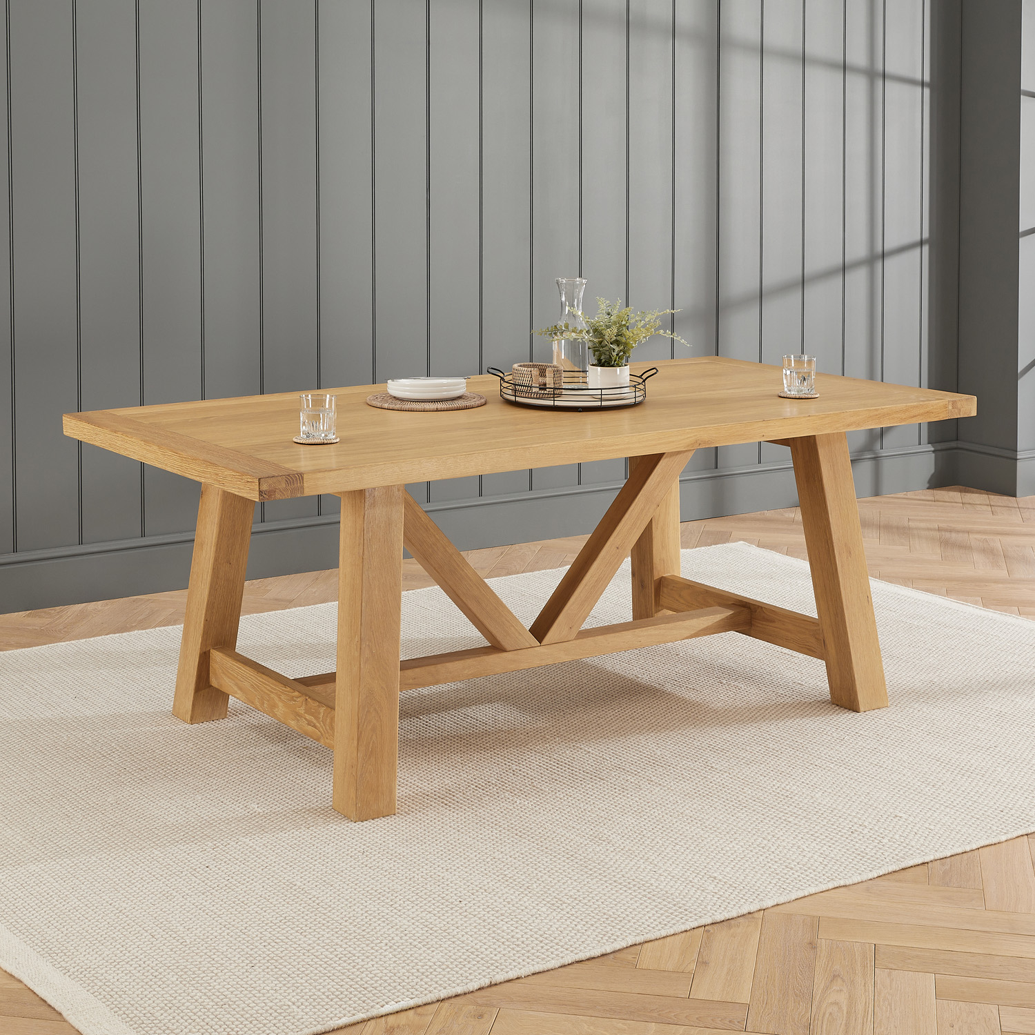 Marbury® Classic Oak 2m Trestle Dining Table – Expertly handcrafted this dining table showcases a harmonious blend of durability and refined style. Featuring a robust chunky oak frame, this table embodies enduring quality with an elegantly understated charm. Designed for both everyday dining, its spacious 2-meter length comfortably accommodates six chairs, with room for up to eight guests when needed. Whether set in a rustic farmhouse interior or a contemporary living space, this trestle table offers a perfect balance of practicality and timeless appeal, making it a sophisticated centrepiece for any home.