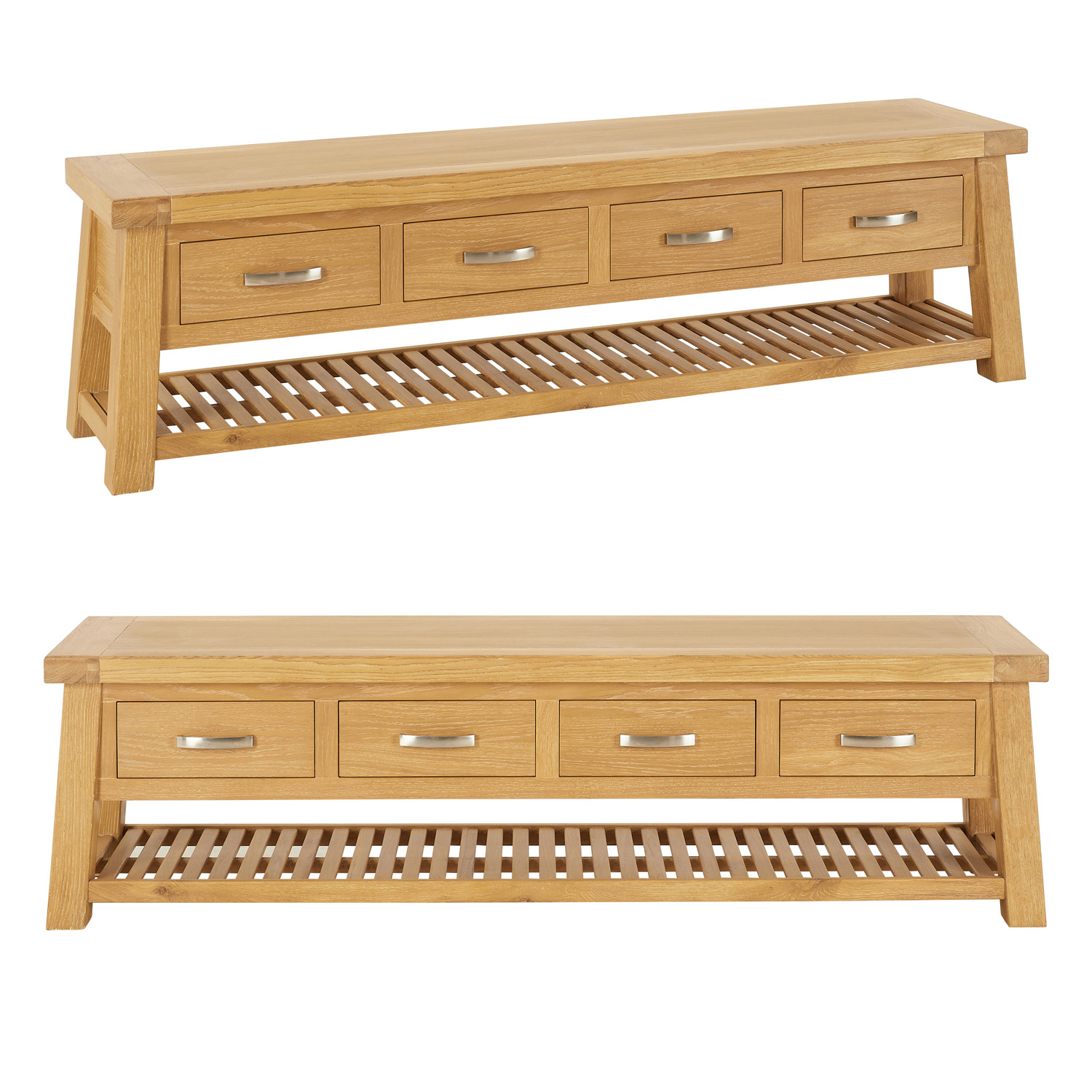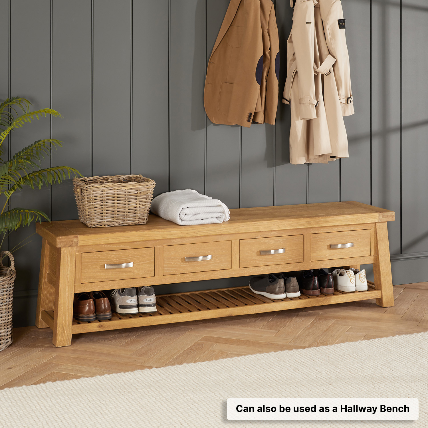 Distinctive Trestle Design - Designed in a classic trestle style with its angled legs connected by four drawers and a slatted oak lower shelf, ensuring both stability and architectural appeal. The chunky oak design features clean lines, two sturdy angled leg frames made using 70mm square leg posts, and a substantial 50mm thick oak top, exuding strength and sophistication. The versatile nature of this adorable design is that it can also be used as a shoe storage bench in your hallway or boot room.