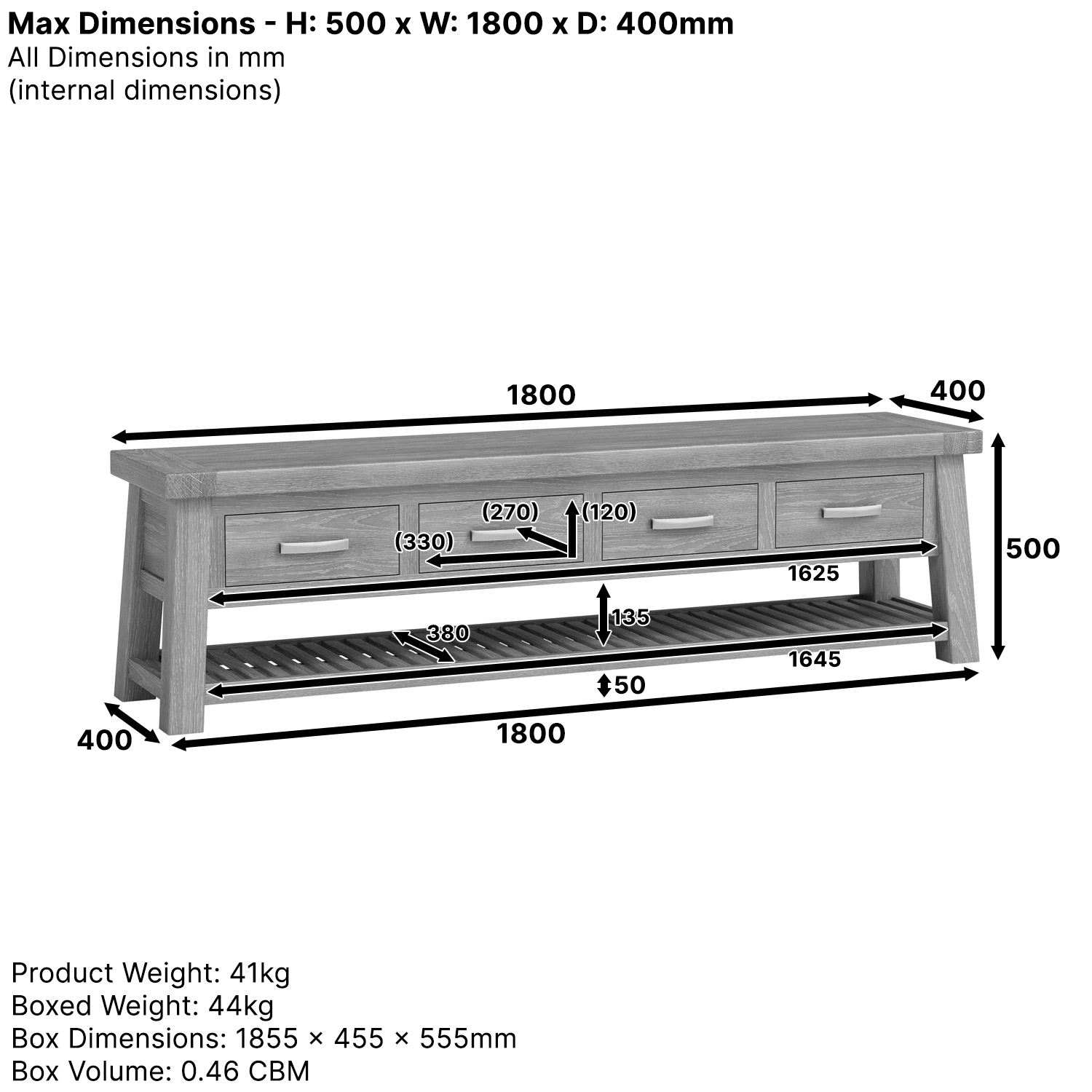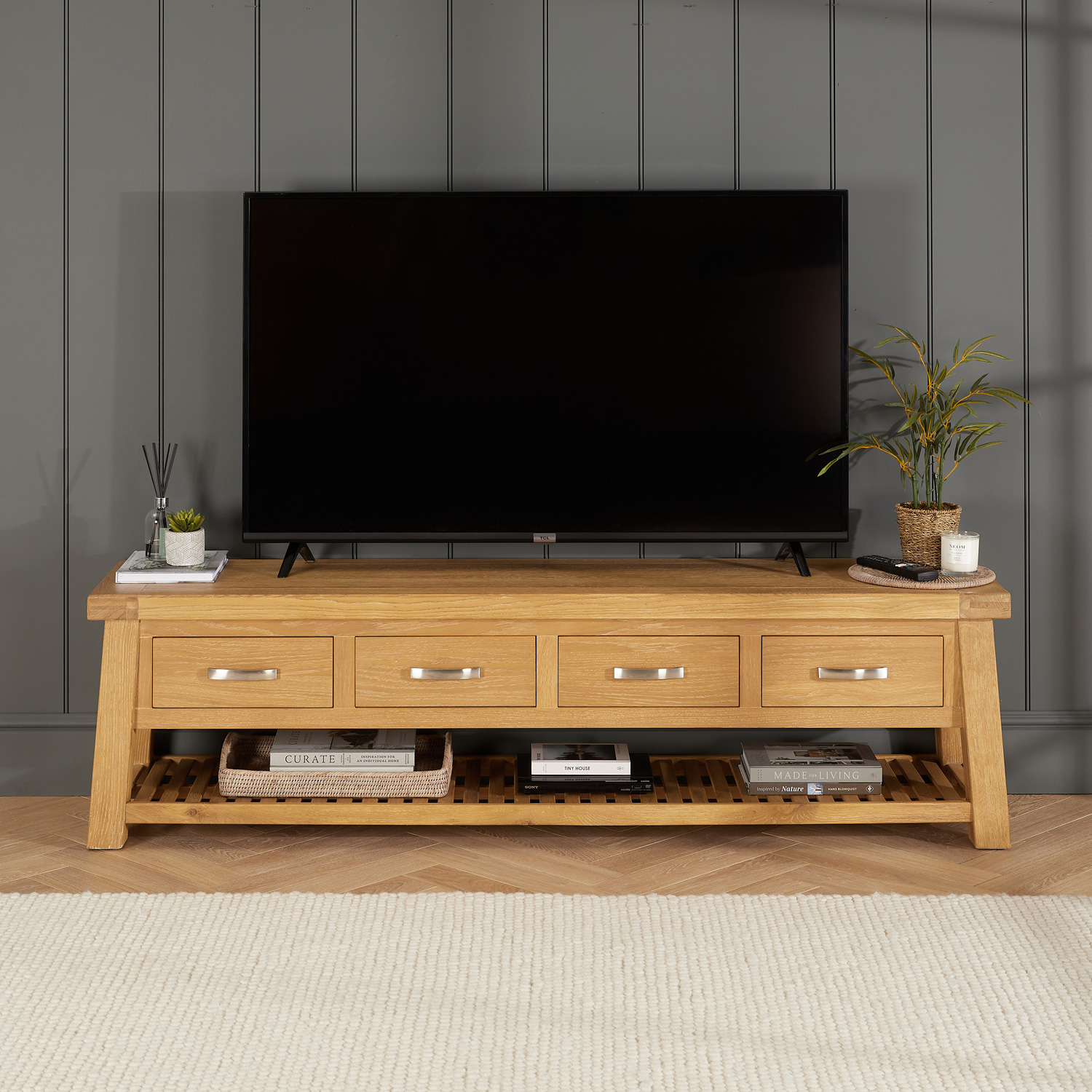 Marbury® Classic Oak Extra Large TV Stand – A perfect blend of style and functionality designed to elevate your living room. This extra-large TV stand combines classic craftsmanship with contemporary elegance, providing the ideal solution for your entertainment needs. It boasts exceptional strength and sturdiness, and its functionality is enhanced by four large storage drawers and a large, slatted oak shelf that provides plenty of display space for all your media devices.