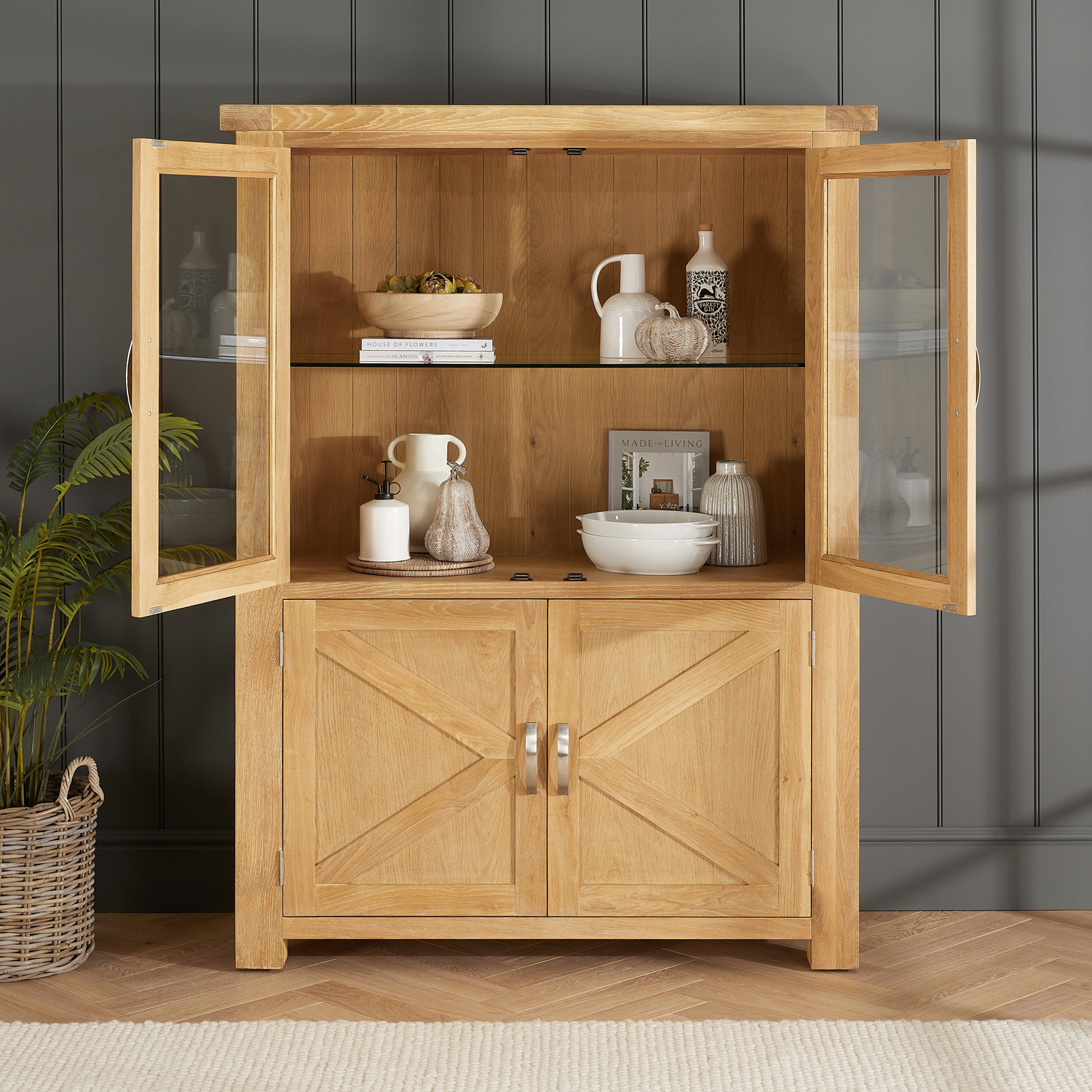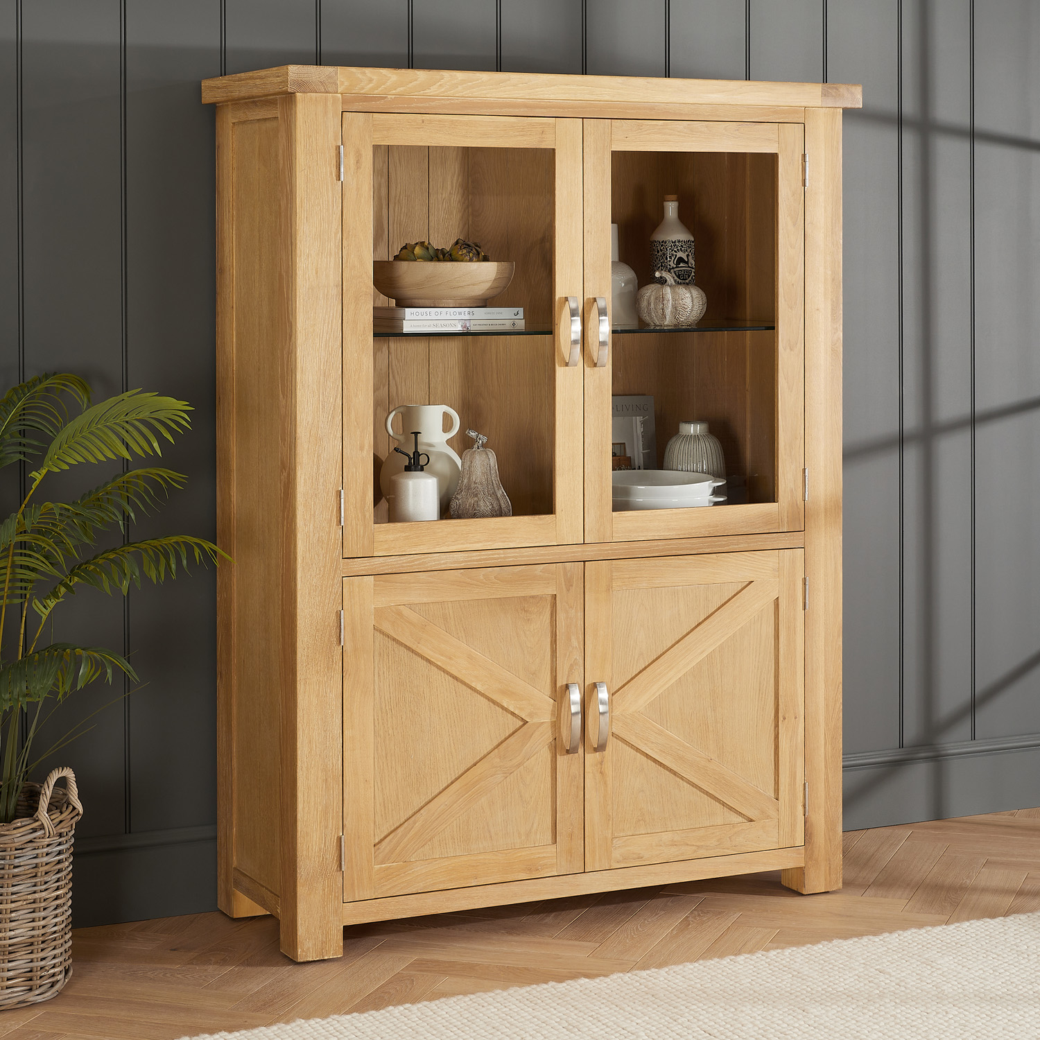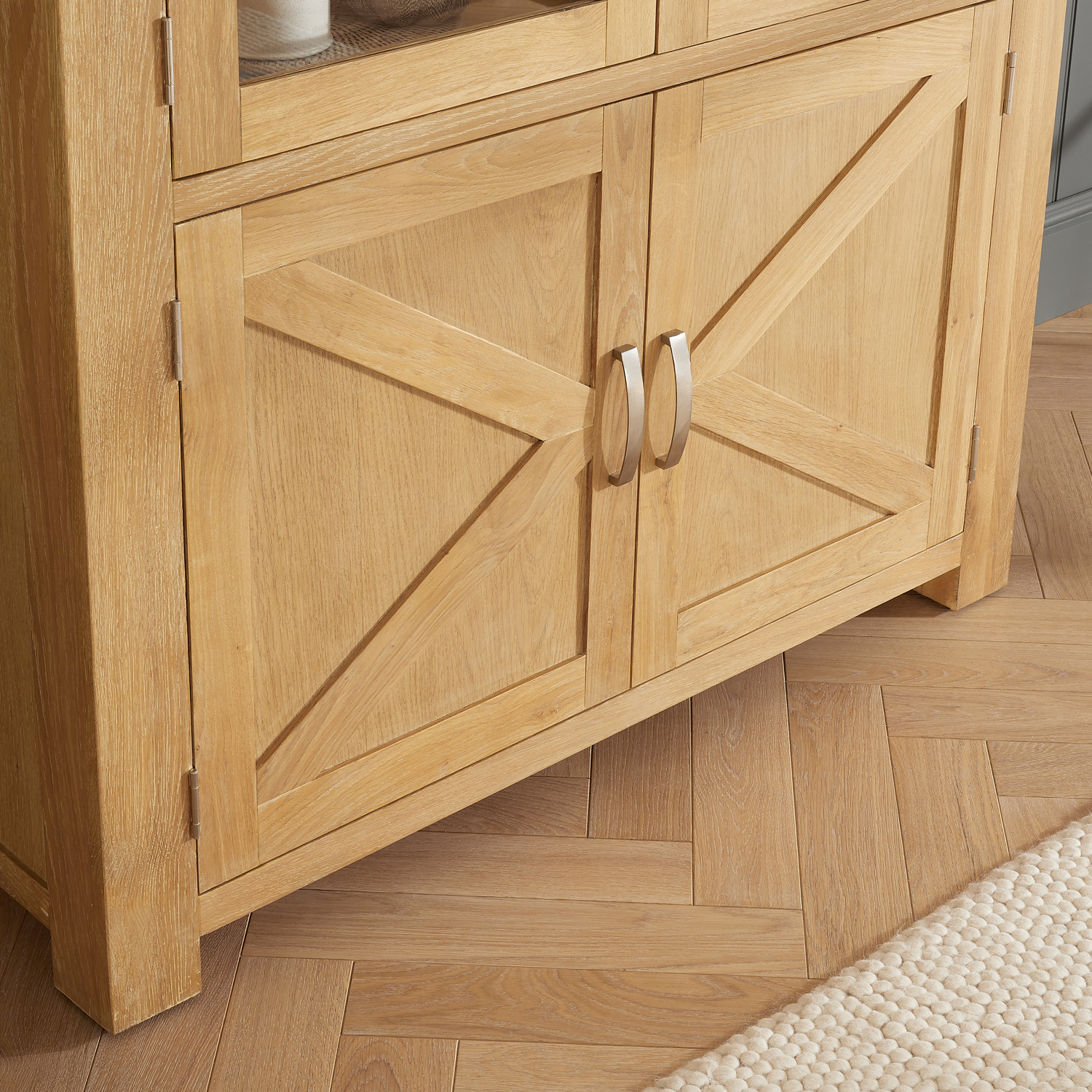 Marbury® Classic Oak Glazed Display Cabinet - Blending classic trestle-inspired styling with contemporary versatility, the Marbury® Classic Oak display cabinet is designed to offer both practical storage and timeless appeal. Its well-balanced proportions make it a seamless addition to a dining room, kitchen, or living space, effortlessly adapting to your needs. Providing ample space for your glass collection and kitchenware and as it has thoughtfully been crafted with a lower height top profile, it also serves as a perfect display unit for ornaments and picture frames.