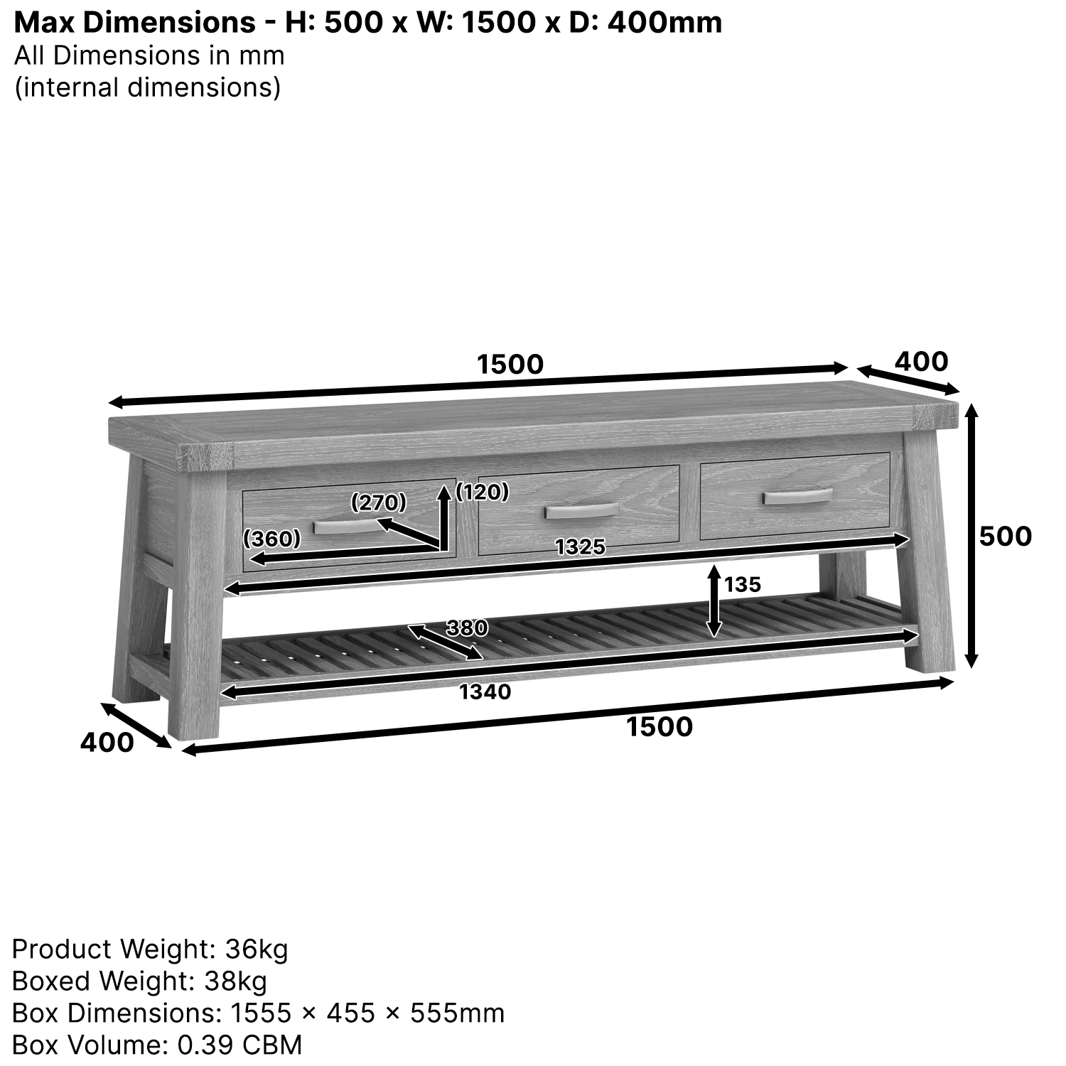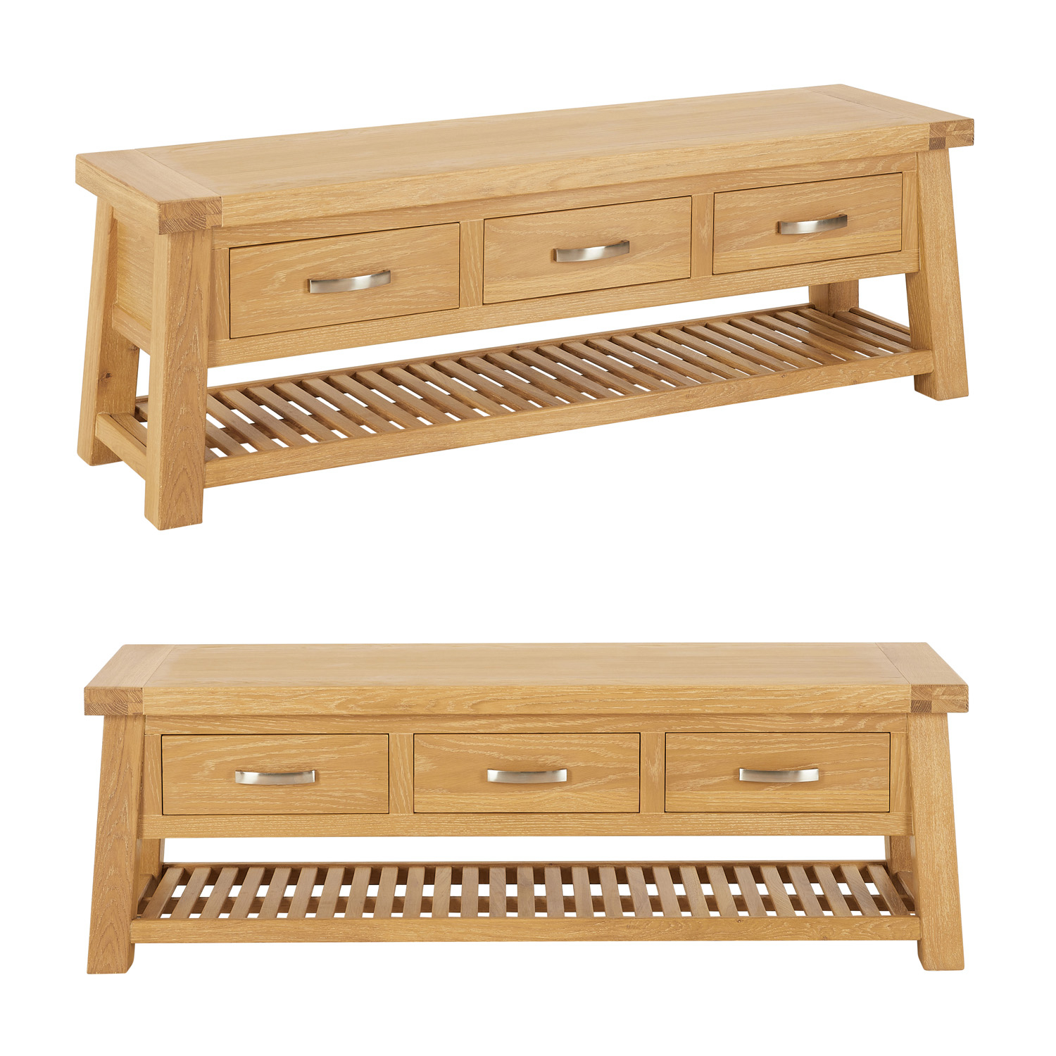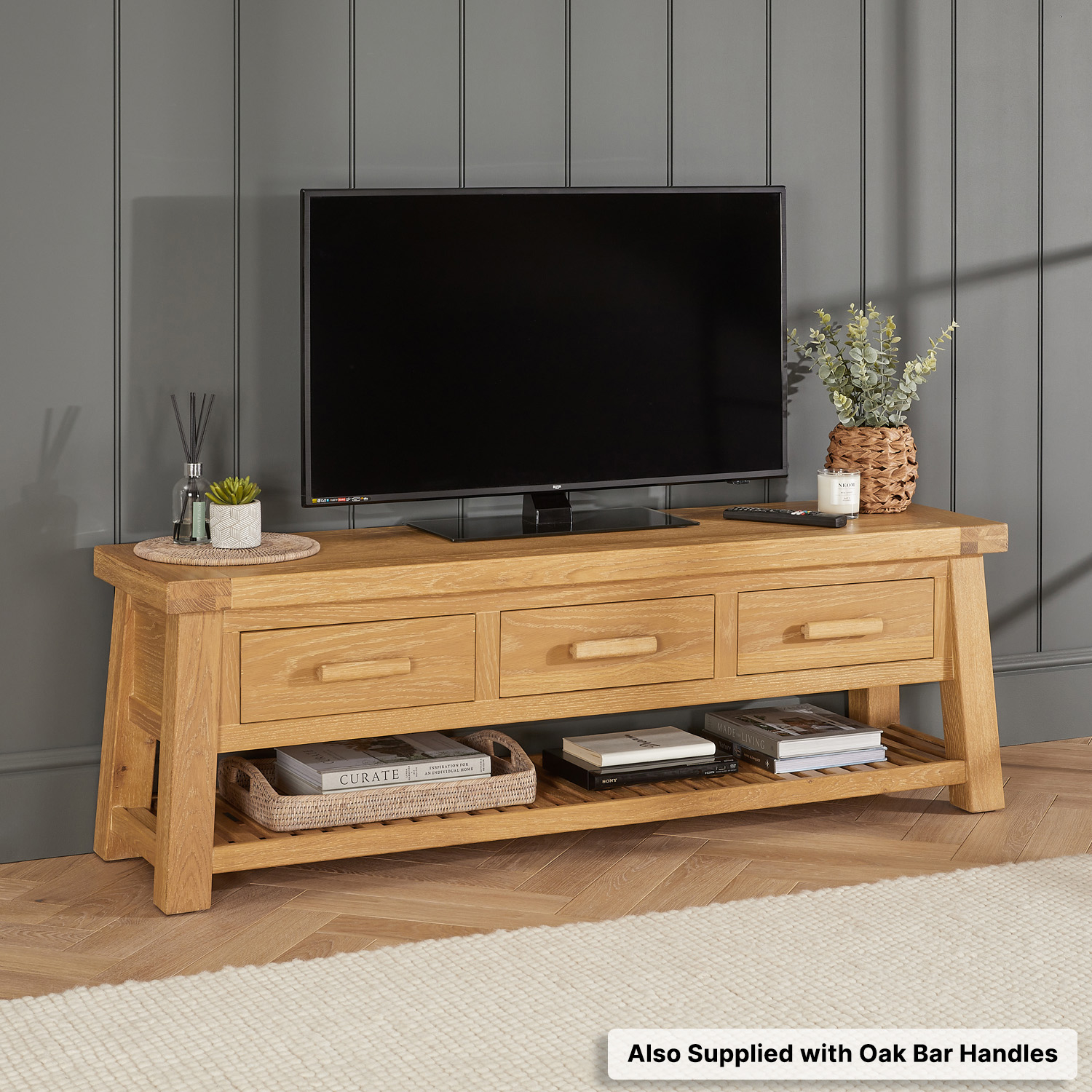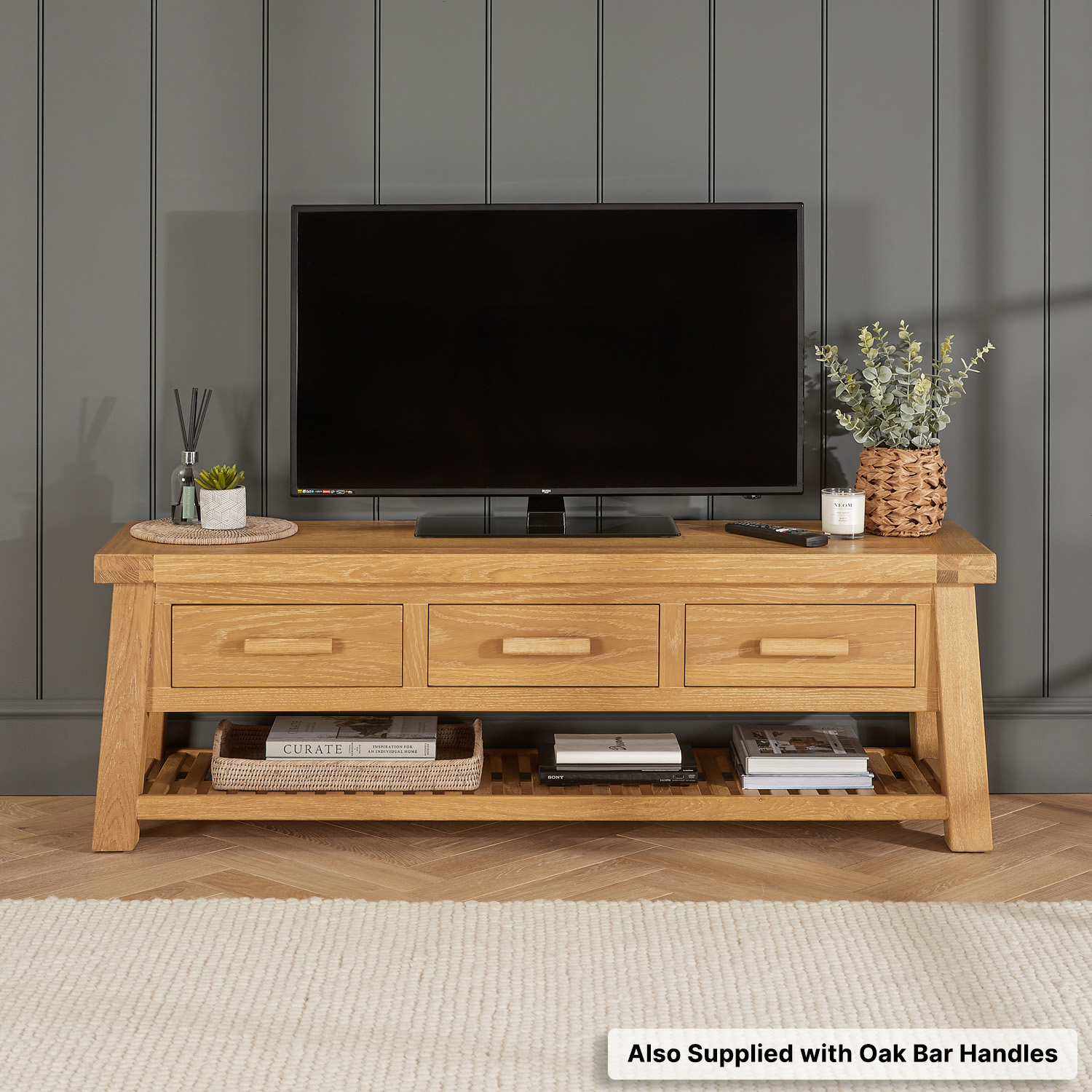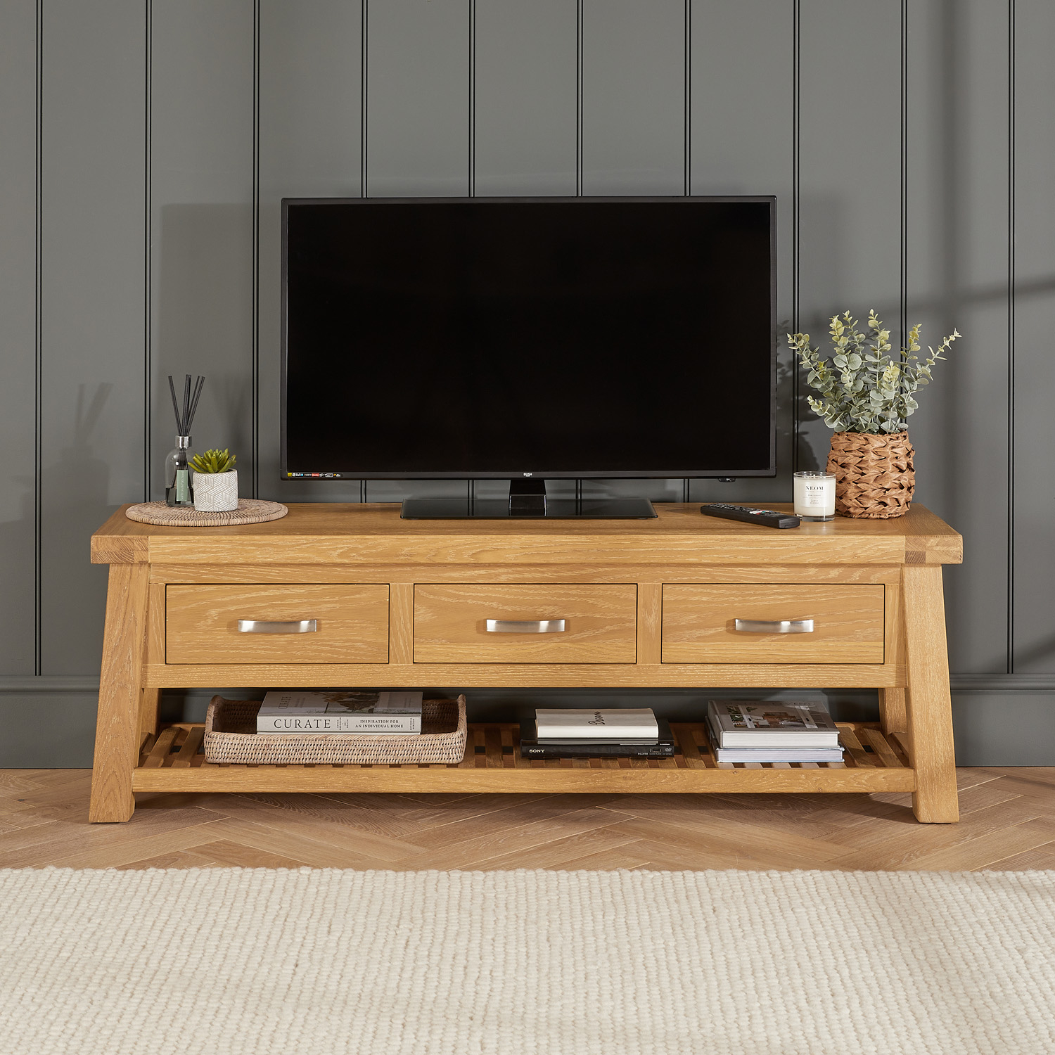 Marbury® Classic Oak Large TV Stand – A perfect blend of style and functionality designed to elevate your living room. This large TV stand combines classic craftsmanship with contemporary elegance, providing the ideal solution for your entertainment needs. It boasts exceptional strength and sturdiness, and its functionality is enhanced by three large storage drawers and a large, slatted oak shelf that provides plenty of display space for all your media devices.