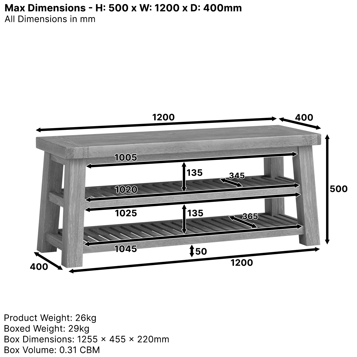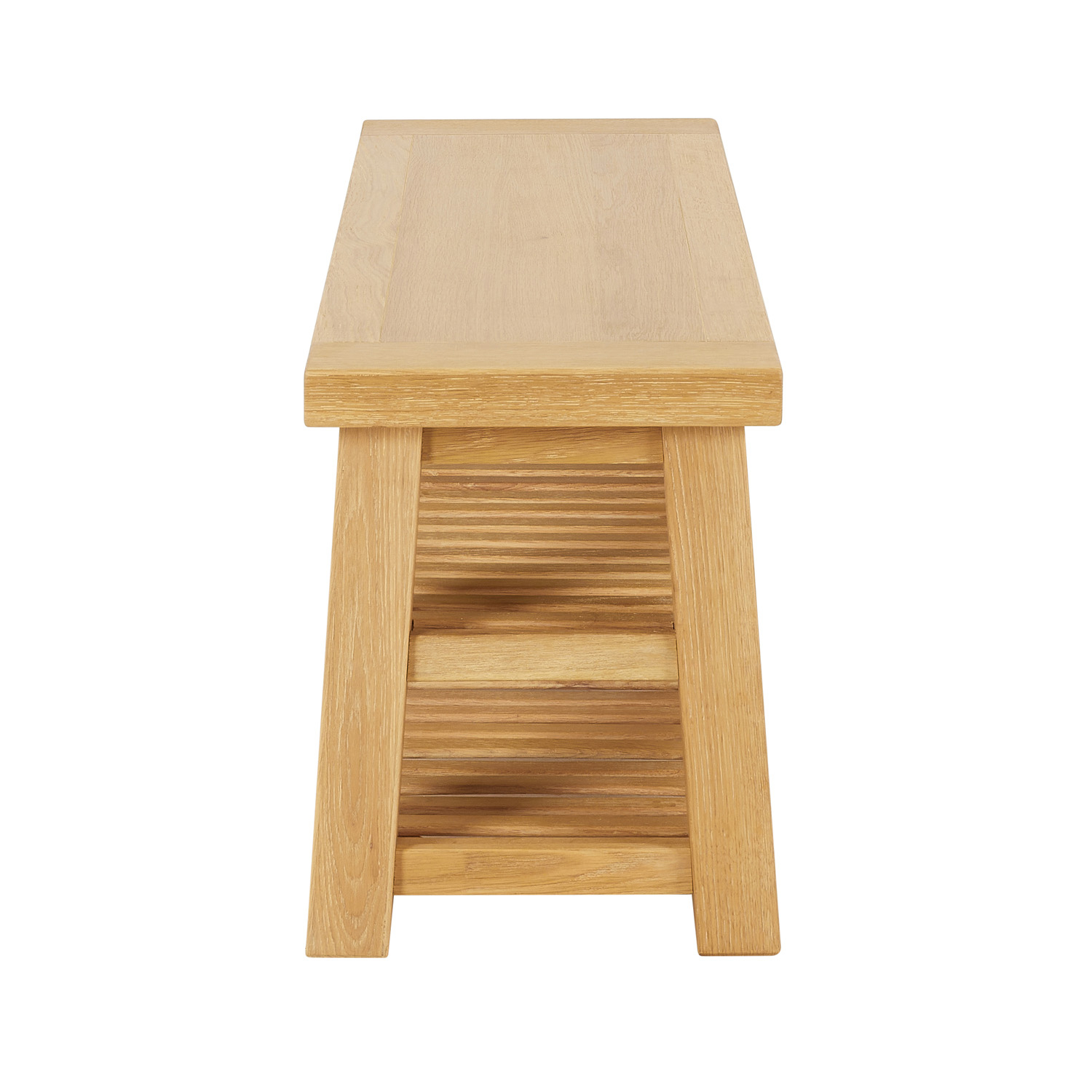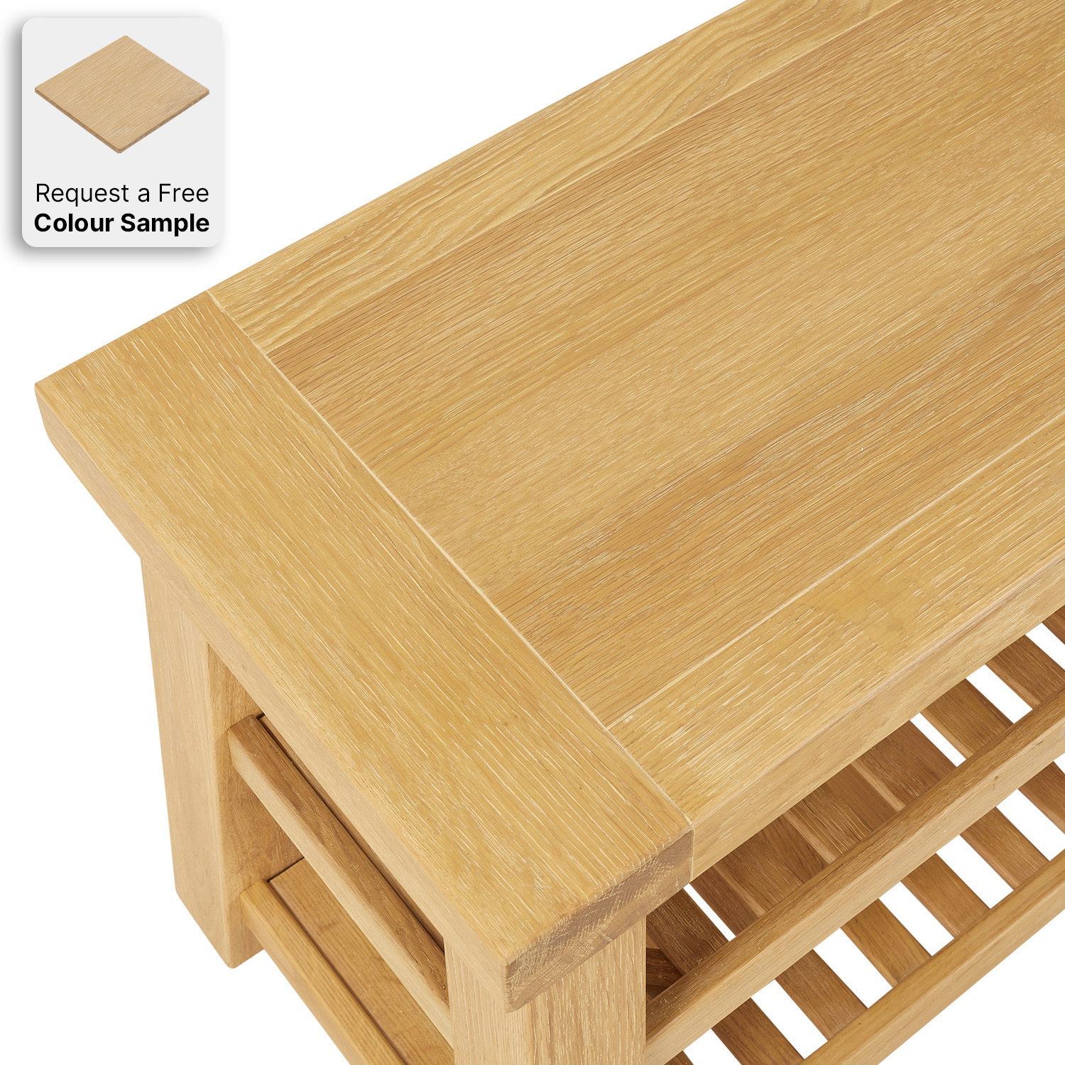 Distinctive Trestle Design - Designed in a classic trestle style with its angled legs connected by two horizontal slatted shelves, ensuring both stability and architectural appeal. The chunky oak design features clean lines, two sturdy angled leg frames made using 70mm square leg posts, and a substantial 50mm thick oak top, exuding strength and sophistication. The versatile nature of this adorable design is that it can also be used as a shoe storage bench in your hallway or boot room.