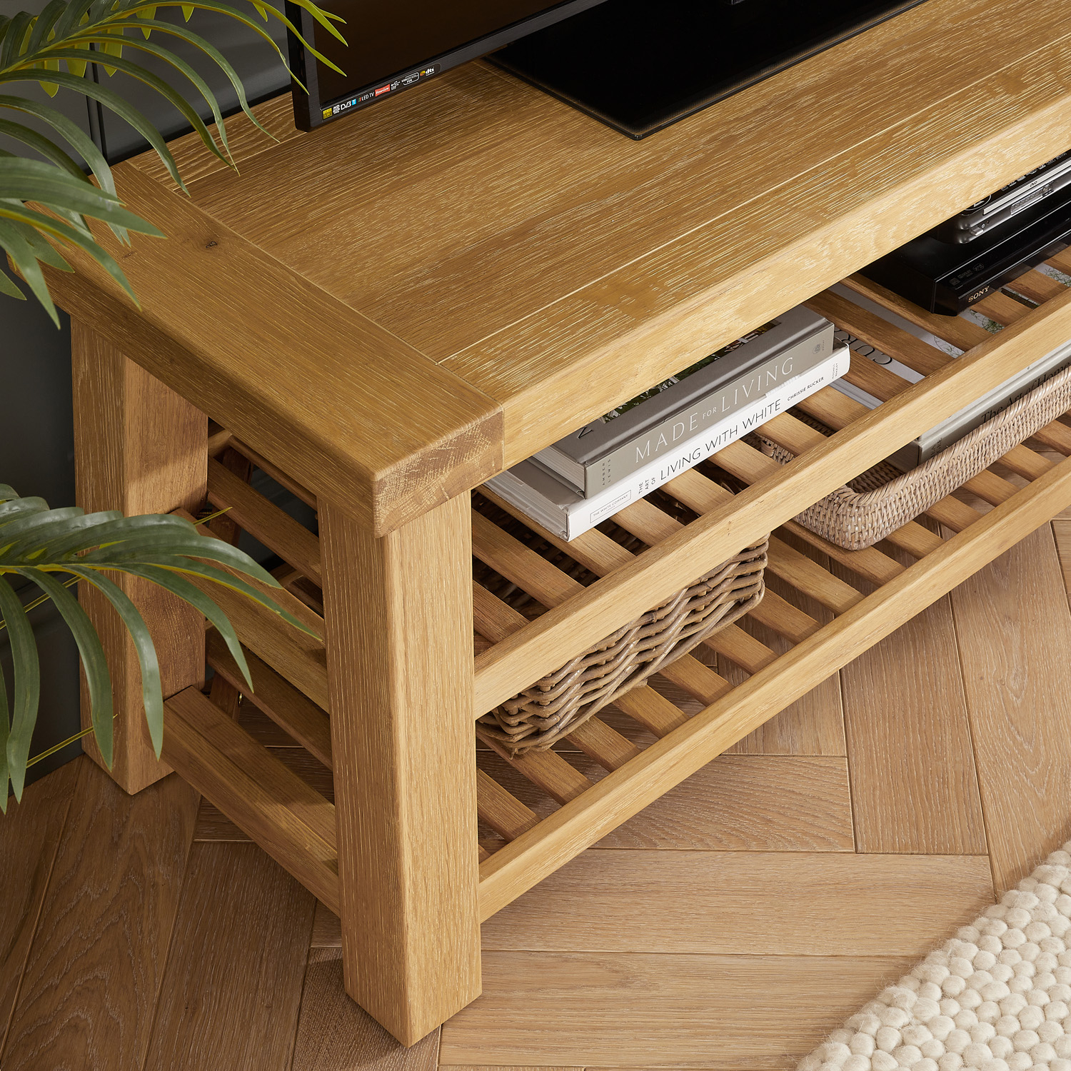 Marbury® Classic Oak Small TV Stand – A perfect blend of style and functionality designed to elevate your living room. This TV stand combines classic craftsmanship with contemporary elegance, providing the ideal solution for your entertainment needs. It boasts exceptional strength and sturdiness, and its functionality is enhanced by two slatted oak shelves that offer texture and plenty of shelf space for your media device needs. Designed to be versatile, this TV stand is finished on all sides and can be used as a standalone piece in the middle of a room if required.