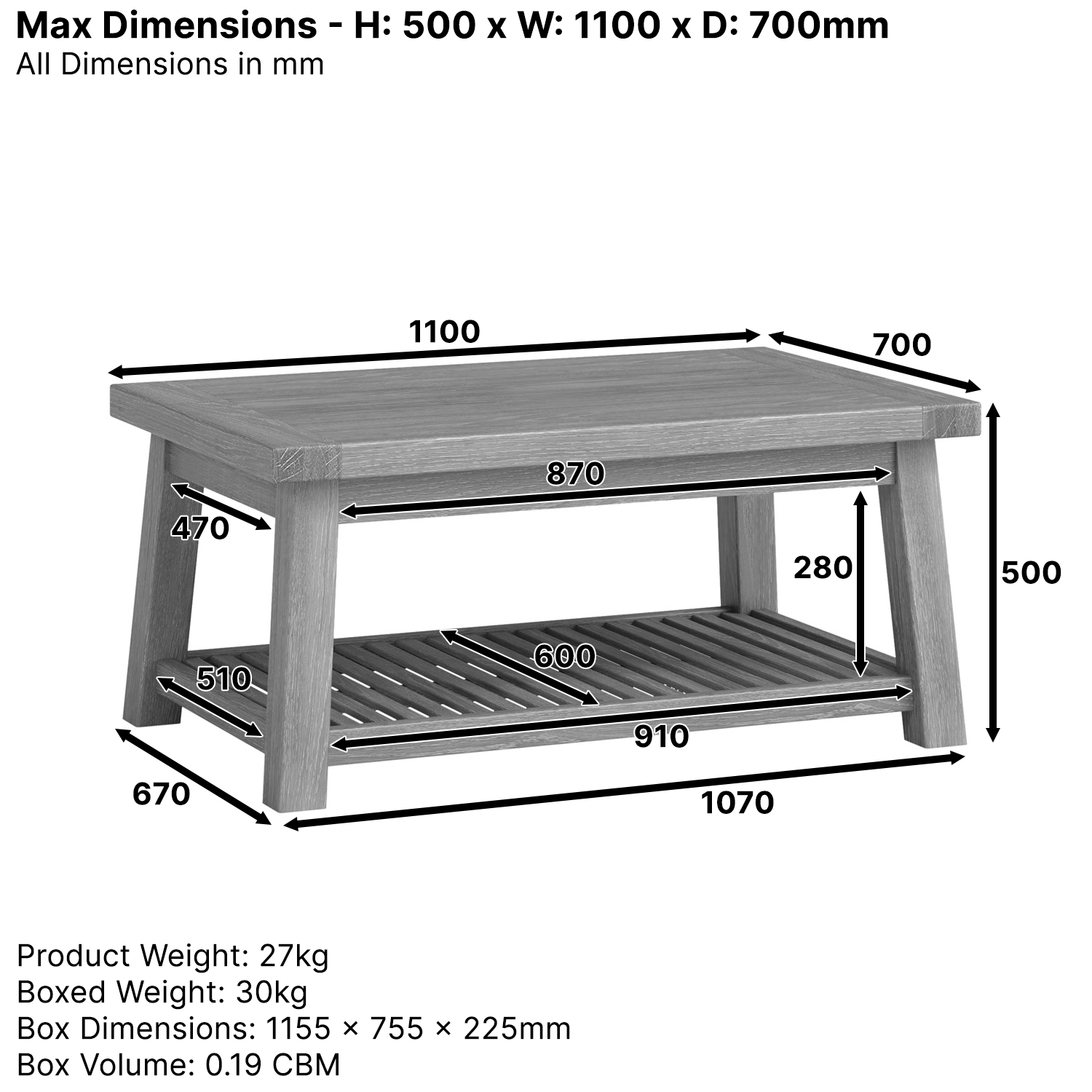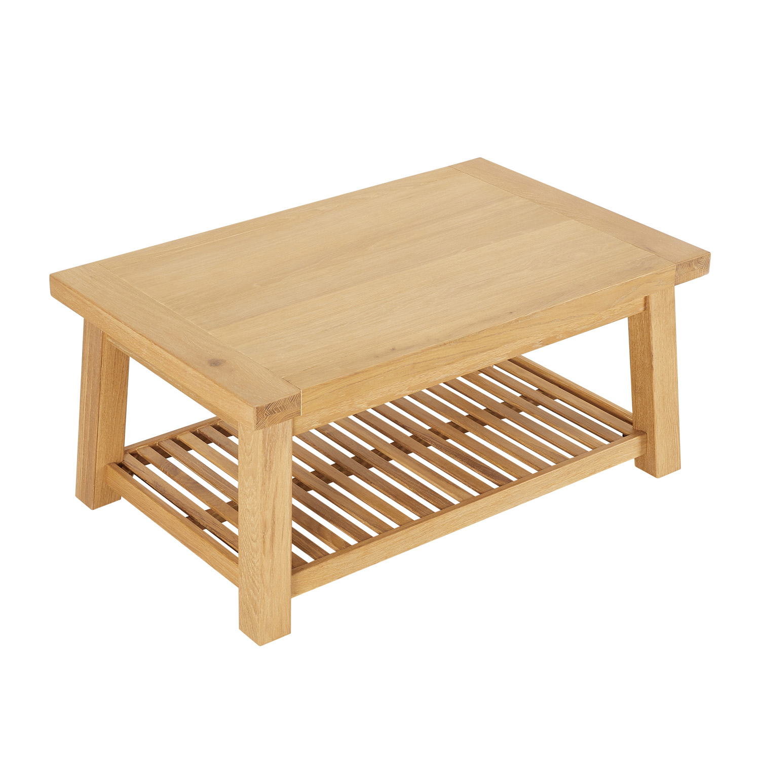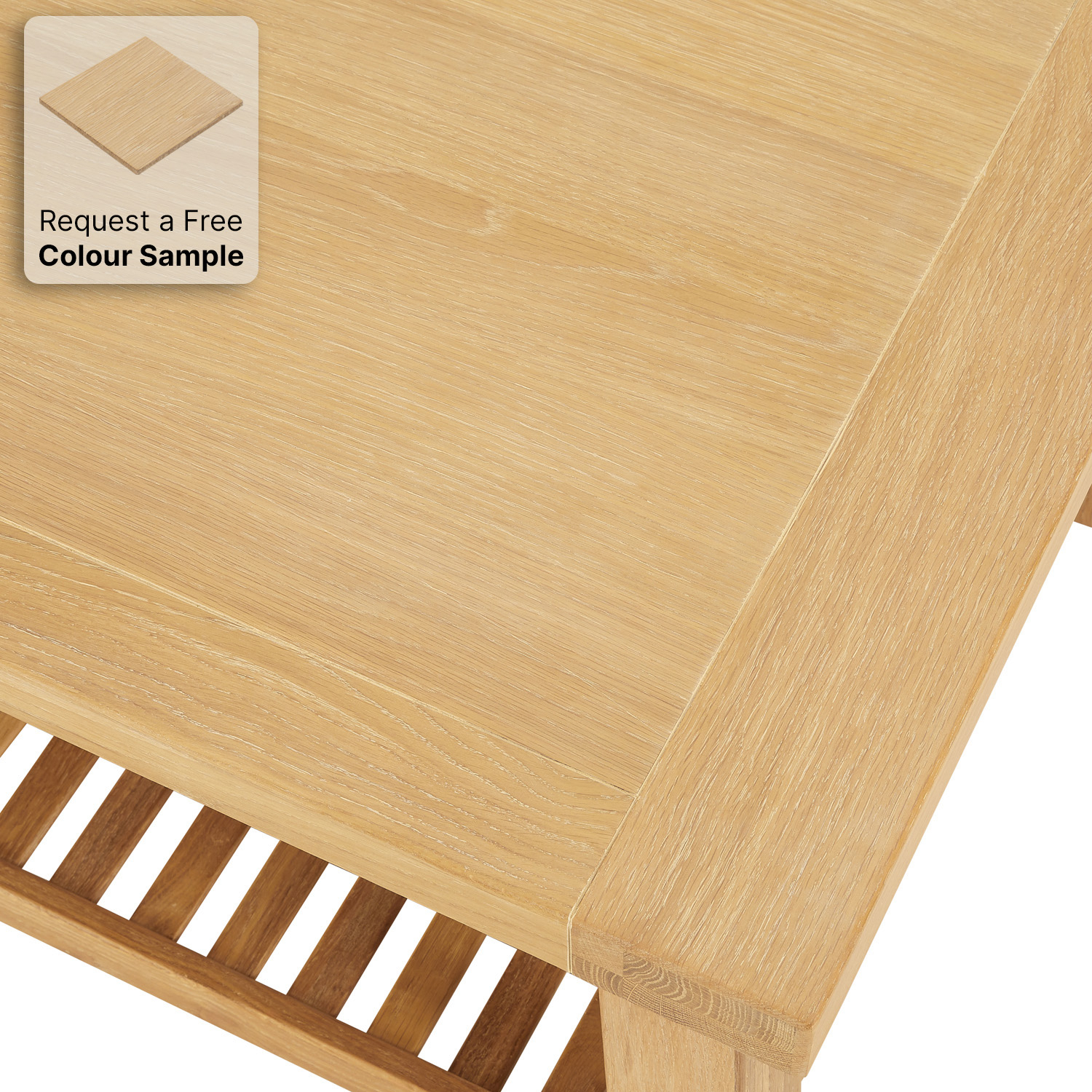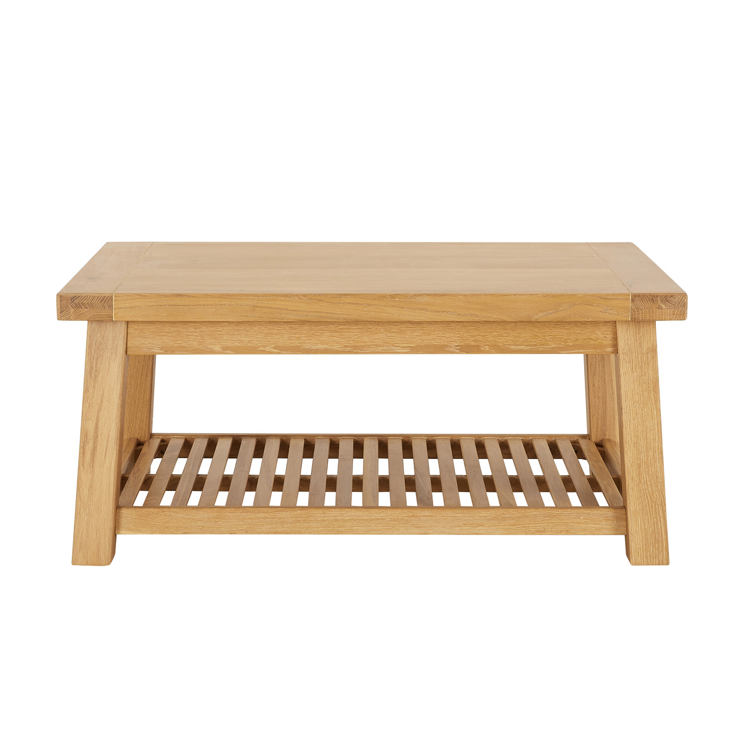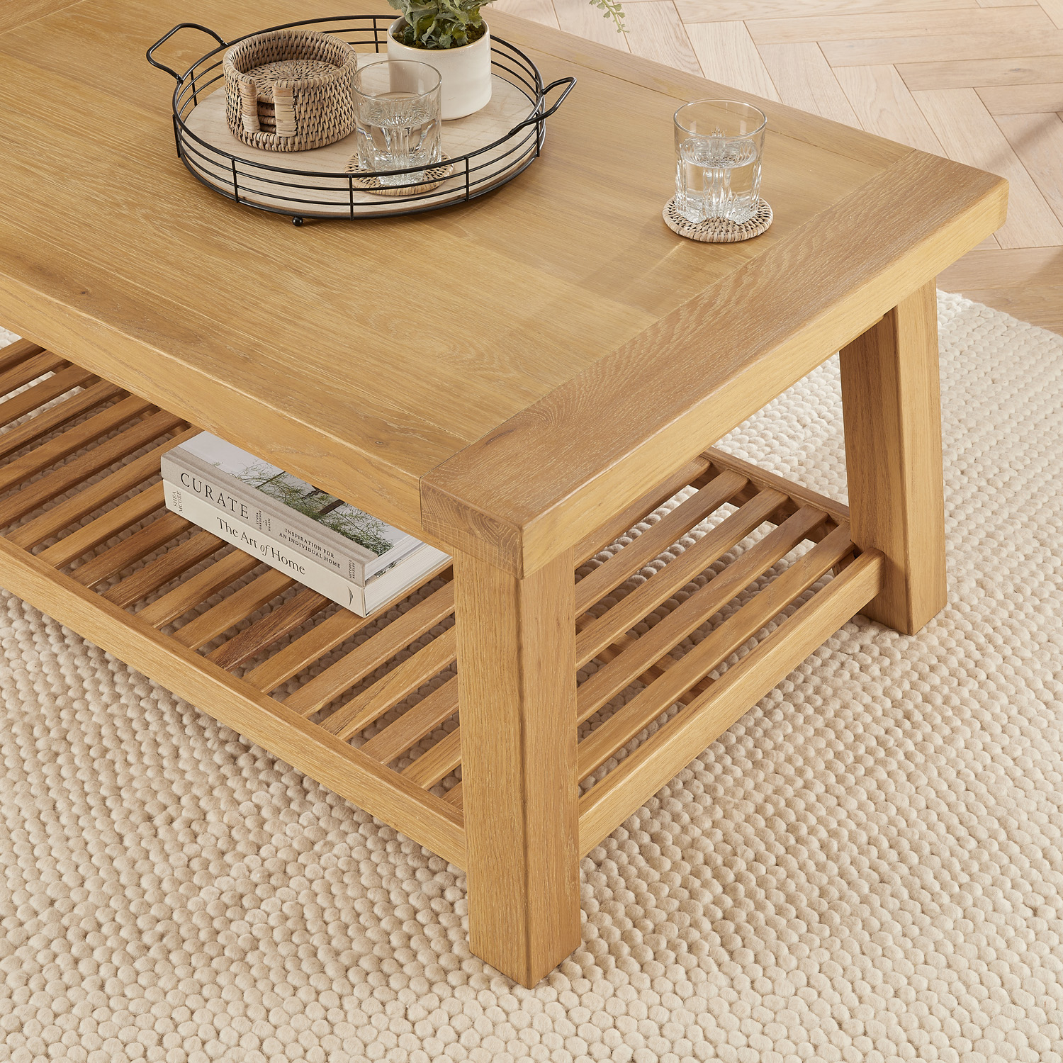 Marbury® Classic Oak Coffee Table - A timeless centrepiece for any living space, this rectangle shaped oak coffee table combines striking design with everyday practicality. Crafted from high-quality oak, its robust construction and substantial proportions exude durability and refined craftsmanship. Designed for both style and function, this chunky coffee table features a slatted lower shelf, adding texture while offering a convenient storage space for magazines, decorative baskets, or everyday essentials. Whether used for entertaining, displaying décor, or simply enjoying a morning coffee, this beautifully crafted piece blends seamlessly with classic and contemporary interiors alike.