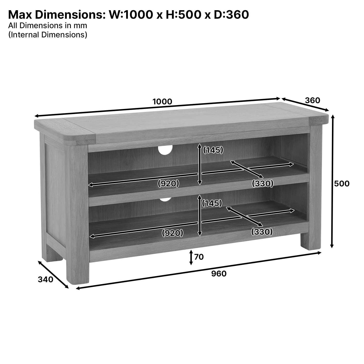 Dimensions: Dimensions: H 500 x W 1000 x D 360mm (see dimensions image for specific measurements)