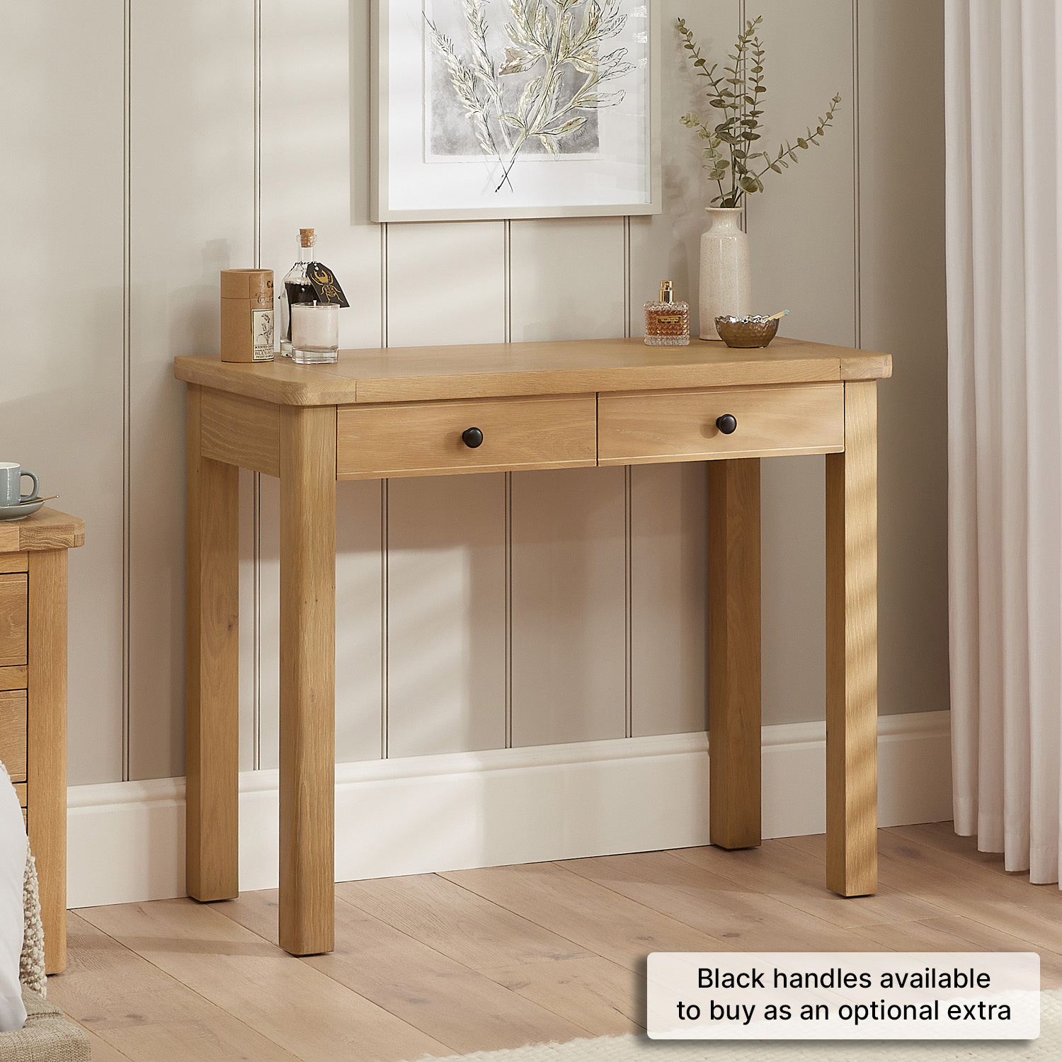 he Marbury® Oak two drawer dressing table is a practical dressing table that will take pride of place in any bedroom or dressing room interior. The large oak table top area can be used to display your dressing table mirror and make up items while the shallow two drawers are perfectly sized to store most beauty products and accessories.