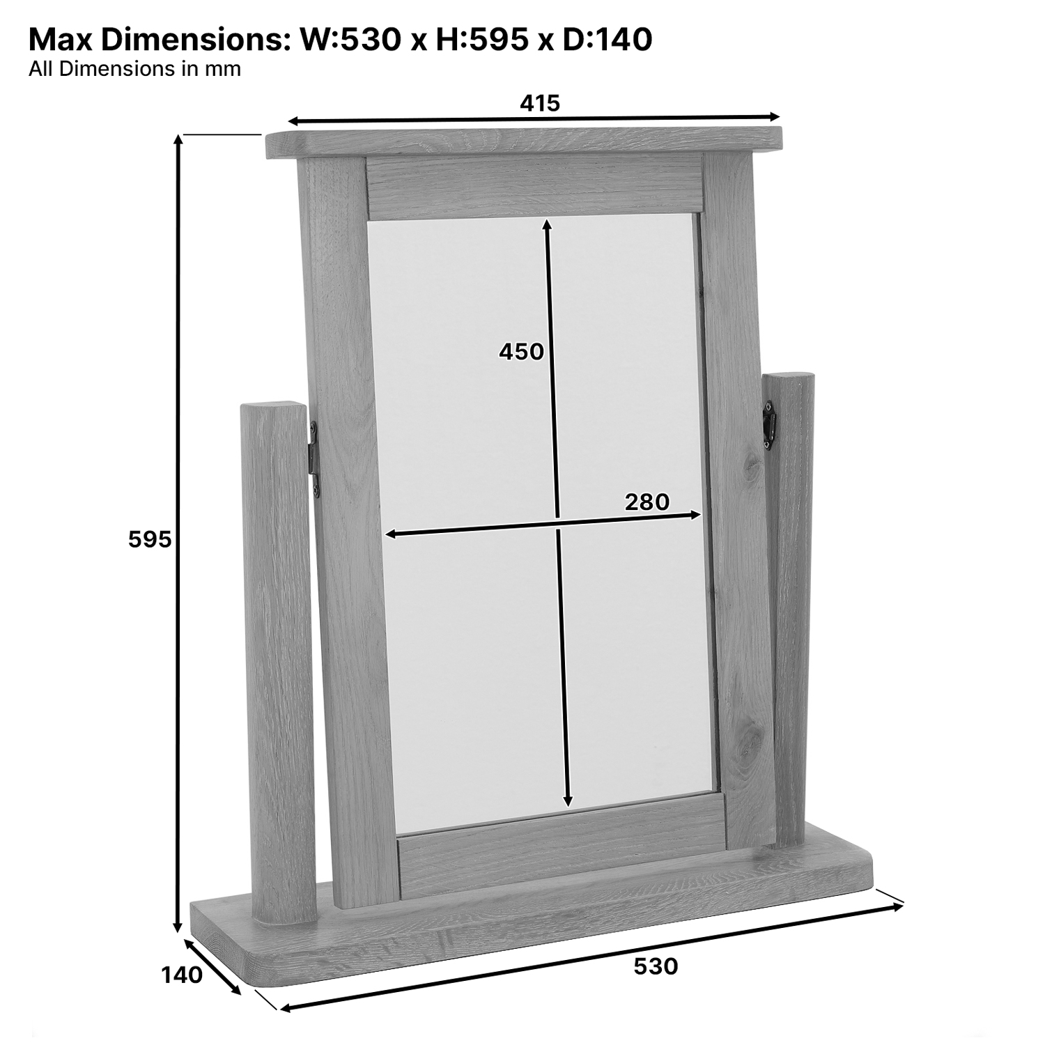 The Marbury Oak vanity mirror has a hinged mirror that allows for you to tilt the mirror to your preferred angle. The mirror frame base also has screw brackets on the back allowing you to easily and safely secure the mirror to your dressing table top.