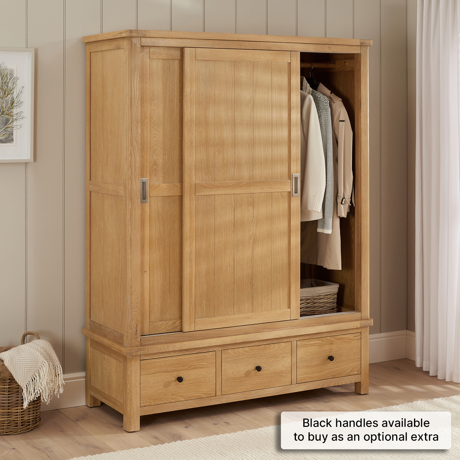 The Marbury® Oak Large Double Wardrobe is a large wardrobe that provide ample of clothes storage space. It is the size of a standard triple wardrobe. It features two large sliding doors and provides you with plenty of clothes hanging space due the full length clothes hanging rail. The base also have two large drawers for additional storage space.