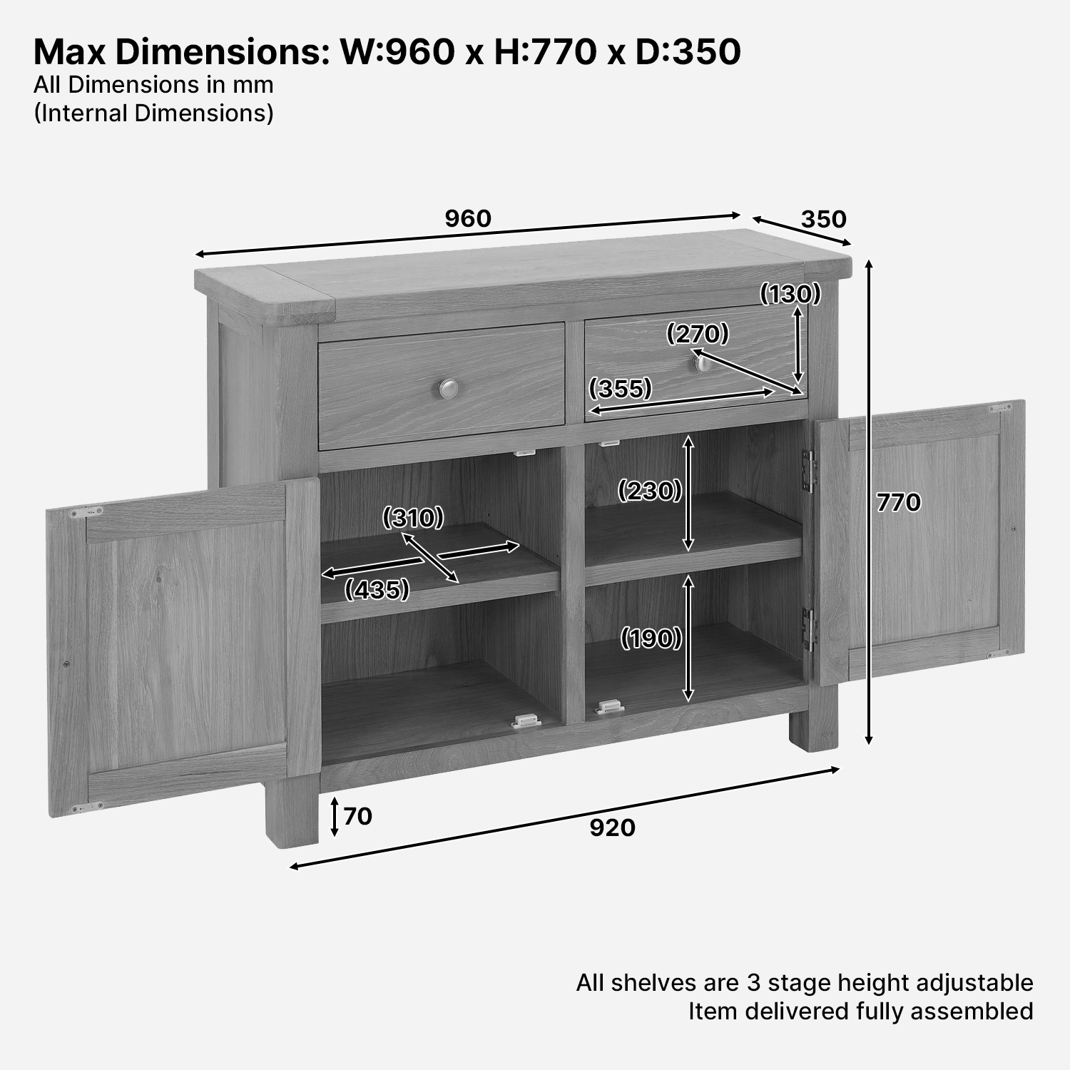 This medium sized oak sideboard features two drawers over two cupboards, each cupboard has a three stage height adjustable shelf allowing you to configure the shelf height to your own requirements.