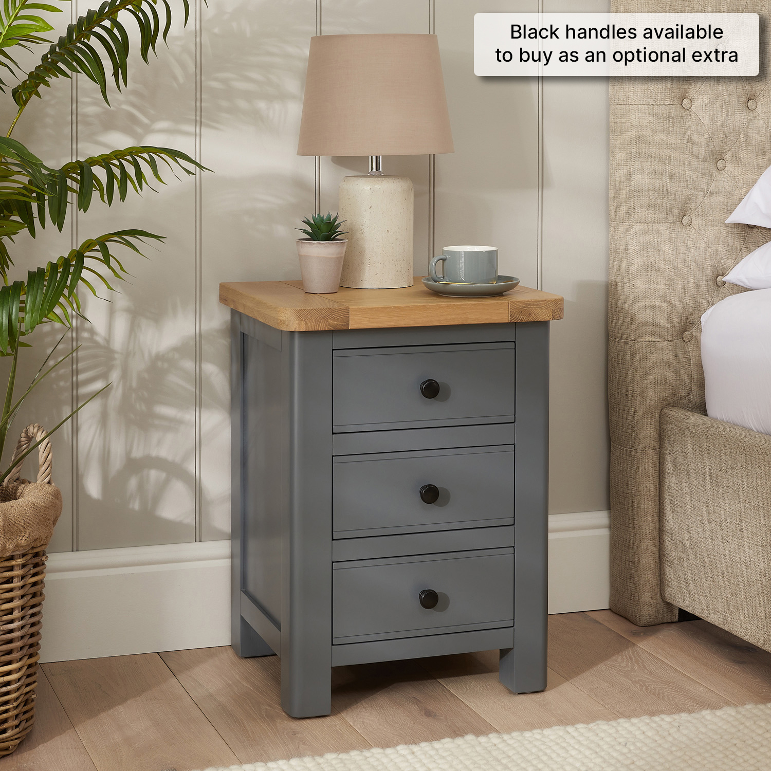 The Marbury® slate grey painted three drawer bedside is the perfect side table to any bed. Substantial in size and chunky in design, this bedside will no doubt look great in any bedroom. It features three large drawers that will provide you with plenty of bedside storage space.